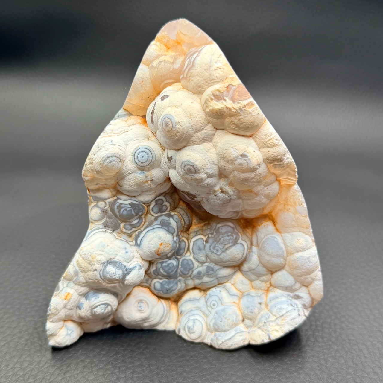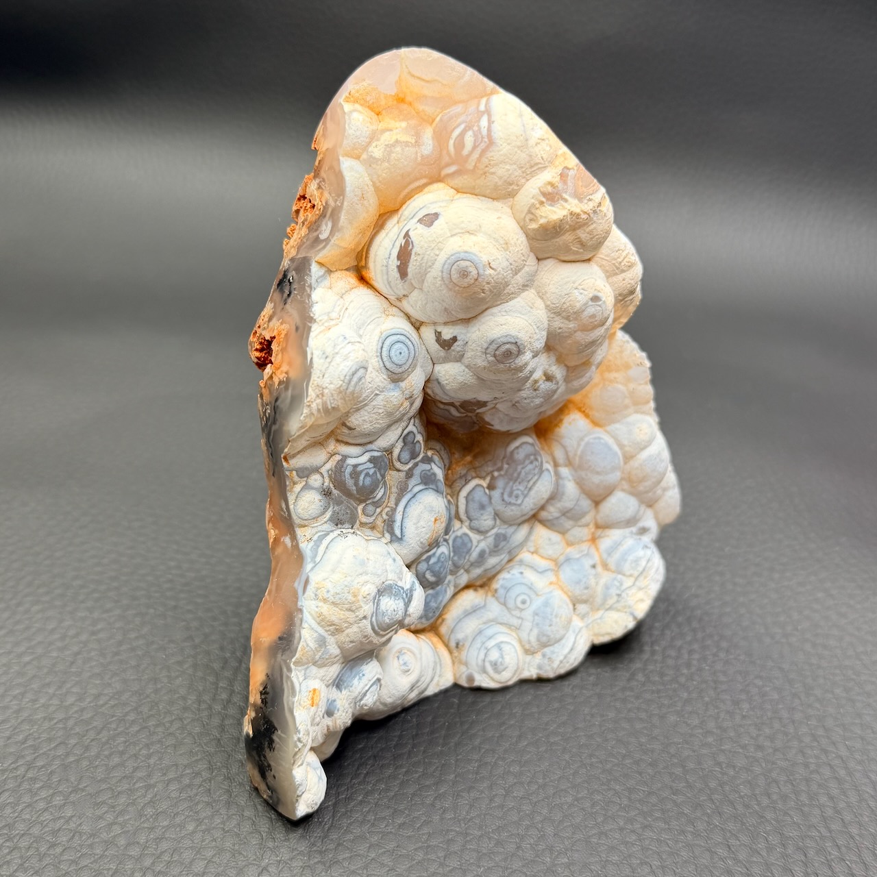 La structure en bandes de cette pierre est appelée texture zonée, et elle est le résultat de la croissance rythmique de la calcédoine dans la cavité. Ce processus de croissance lente est influencé par les variations saisonnières et les changements dans l’environnement géologique. En regardant une tranche d’agate, on peut donc lire l’histoire géologique de la région où elle s’est formée, comme les anneaux d’un tronc d’arbre témoignent de la vie de celui-ci.