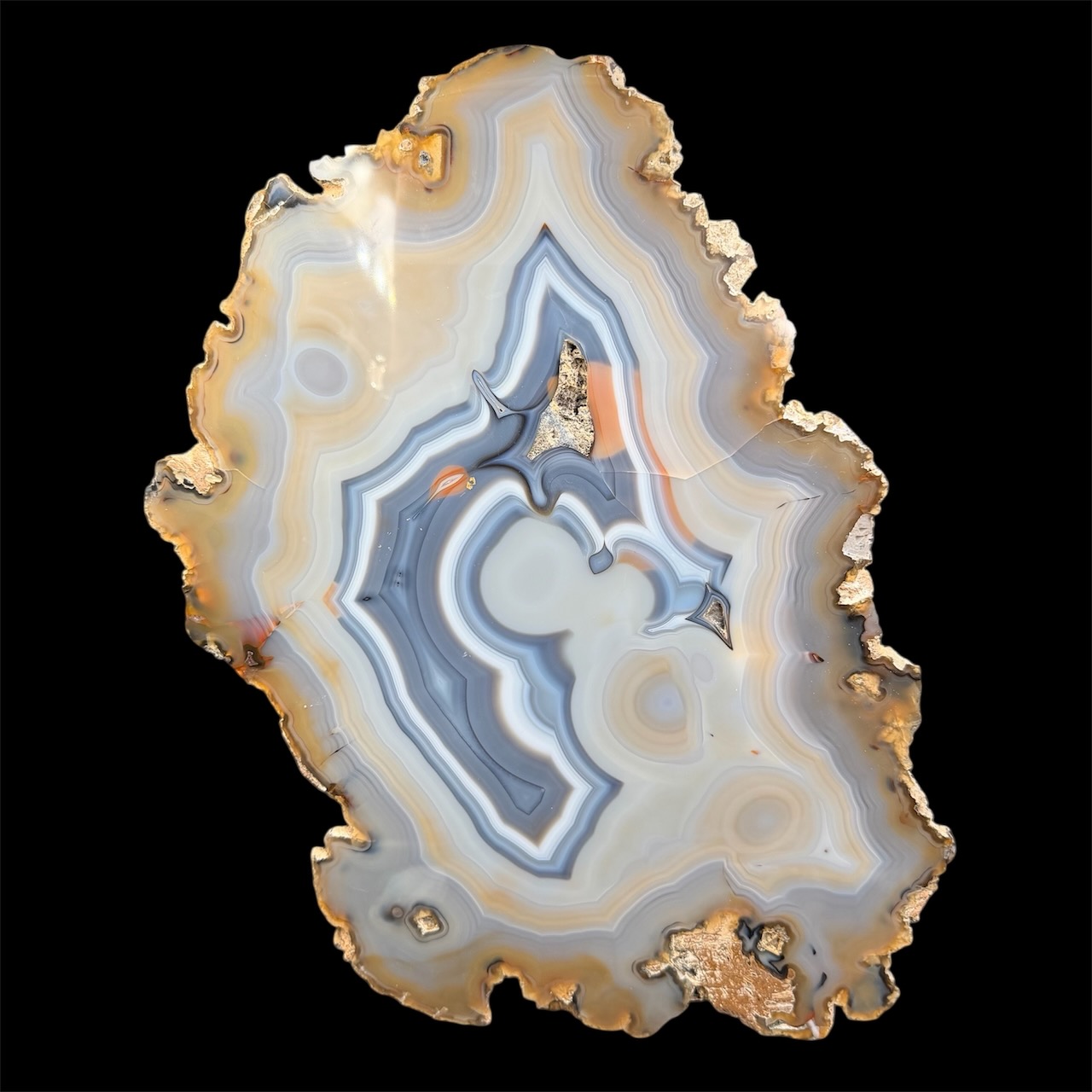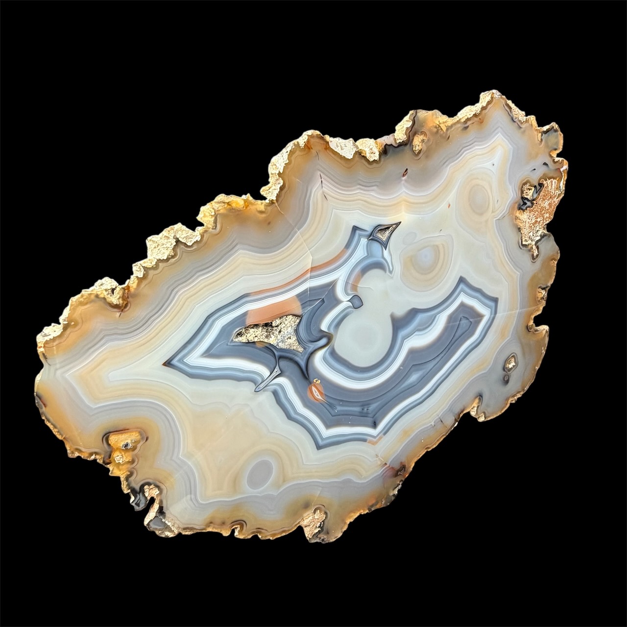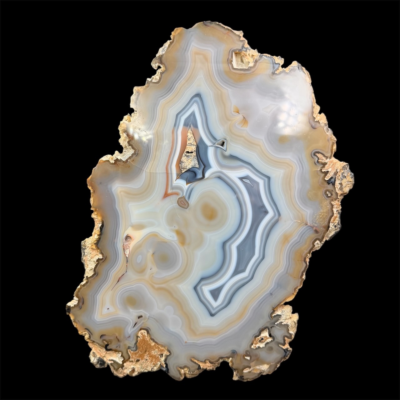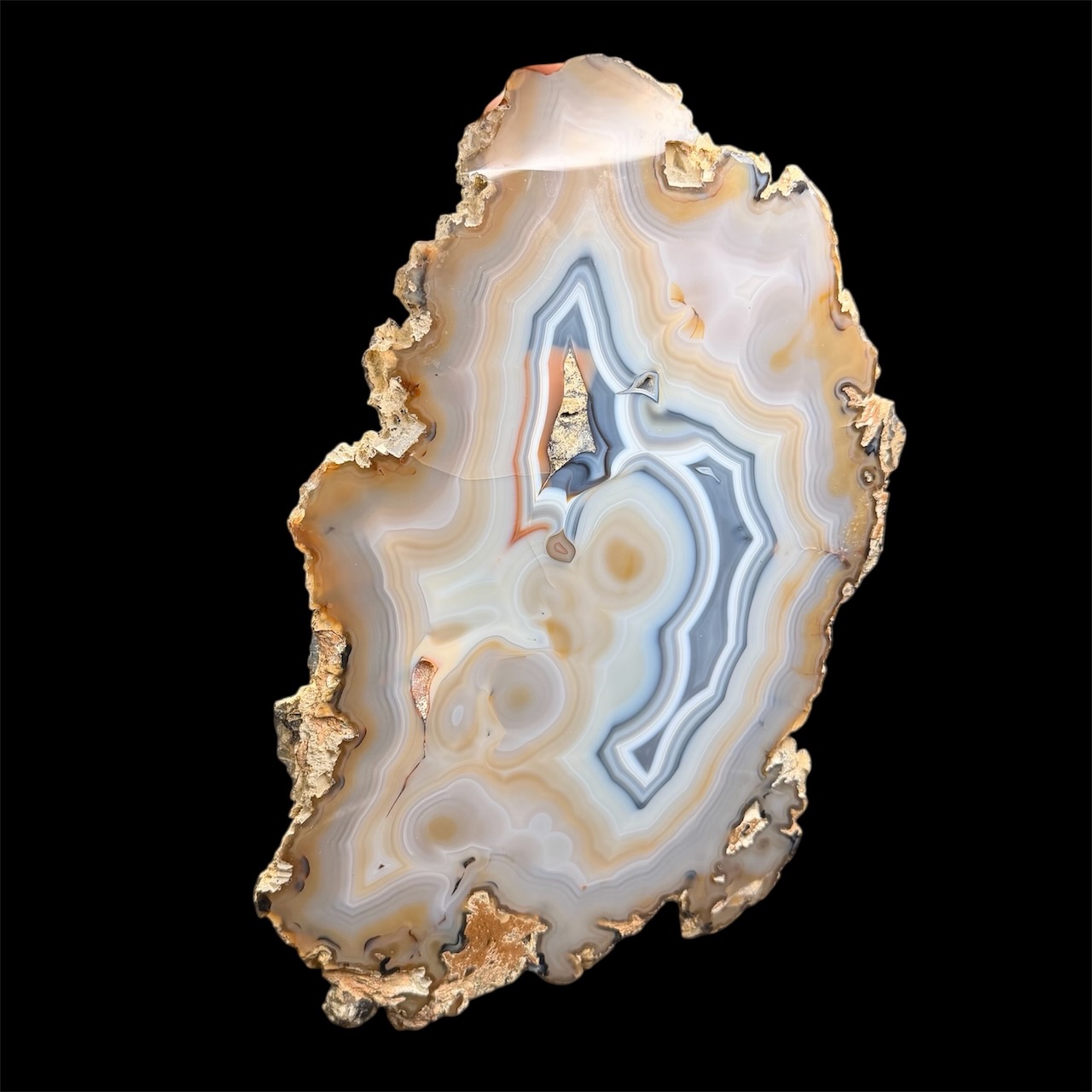 La structure en bandes de cette pierre est appelée texture zonée, et elle est le résultat de la croissance rythmique de la calcédoine dans la cavité. Ce processus de croissance lente est influencé par les variations saisonnières et les changements dans l’environnement géologique. En regardant une tranche d’agate, on peut donc lire l’histoire géologique de la région où elle s’est formée, comme les anneaux d’un tronc d’arbre témoignent de la vie de celui-ci.