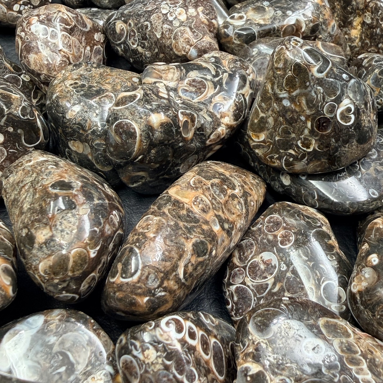 Chaque pierre révèle des formes spiralées, vestiges d’anciens gastéropodes fossilisés, enchâssés dans une matrice agatique patiemment constituée. Cette alliance rare entre matière minérale et trace du vivant confère à l’agate Turitelle une profondeur symbolique et énergétique exceptionnelle.