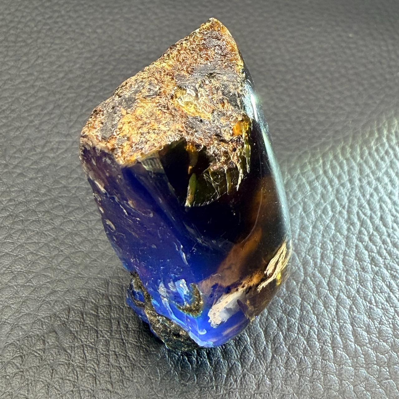Exposé sous une lumière artificielle, l’ambre bleu reste jaune transparente, avec des reflets légèrement bleuté, posé sur une surface noire à la lumière du jour, cette ambre prend une couleur d’un bleu profond c’est la que l’ont peut observer sa fluorescence qui réagi aux rayons ultraviolets que dégage le soleil .