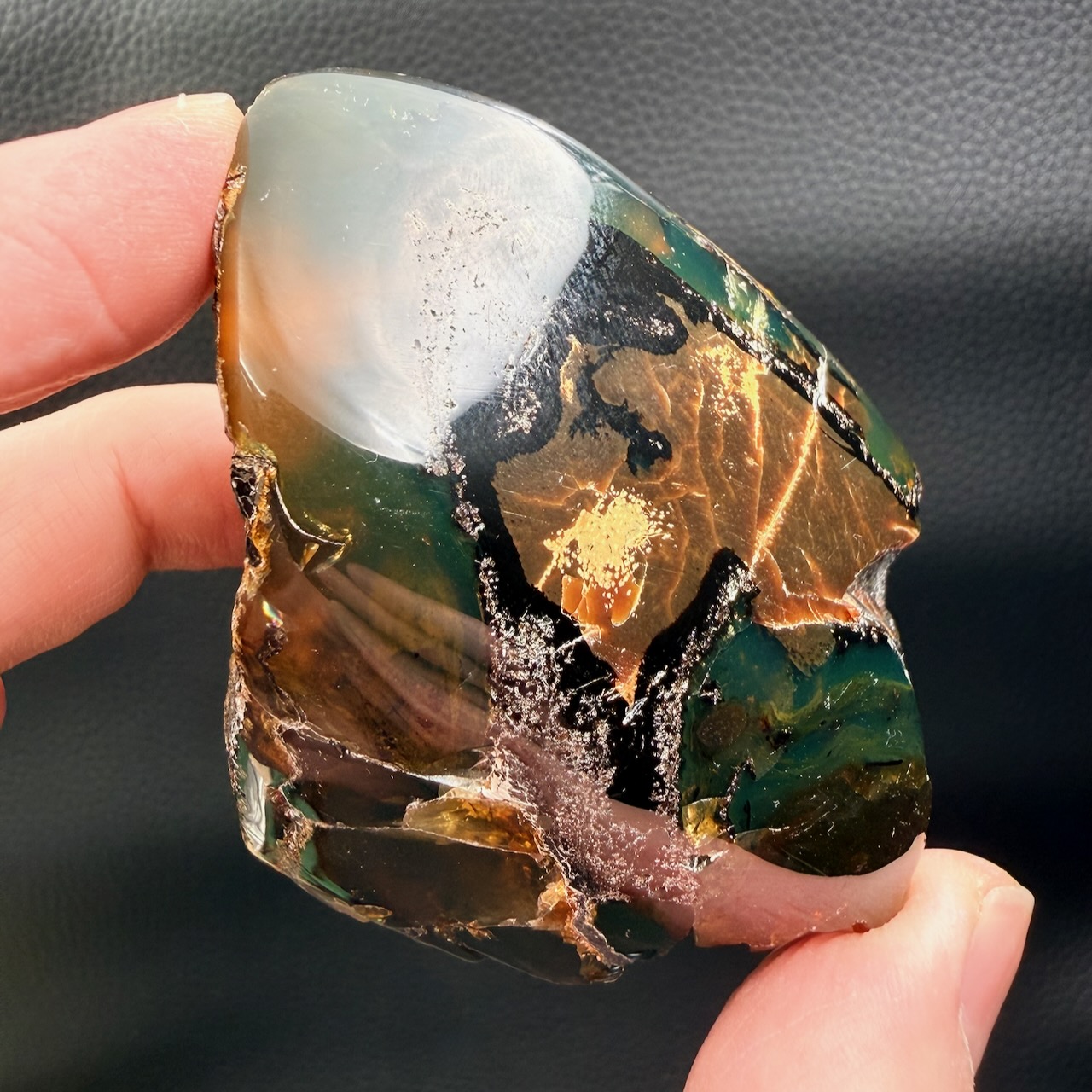 Taille de cet Ambre Bleu de Sumatra 8,5 cm sur 6,8 cm sur 4,1 cm.