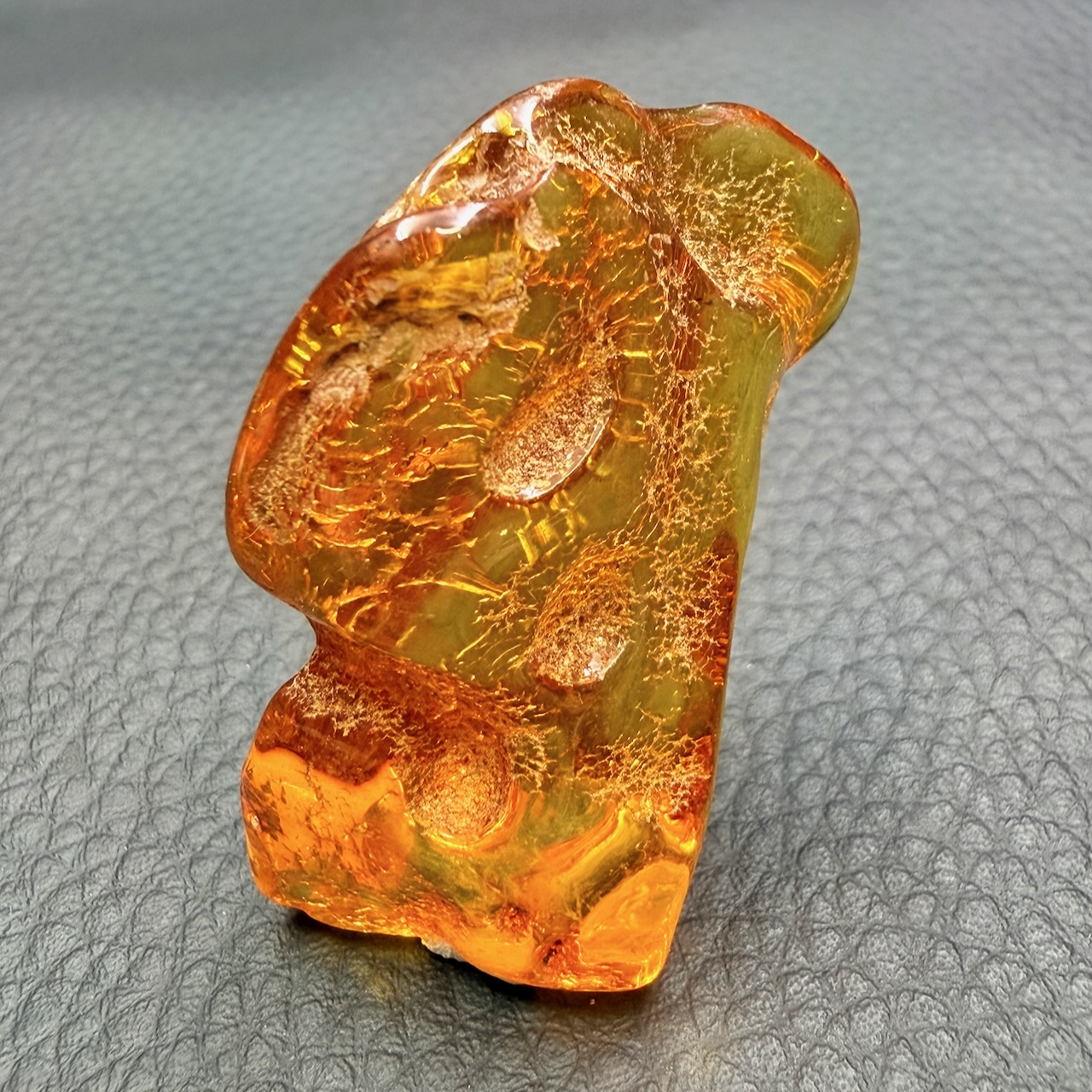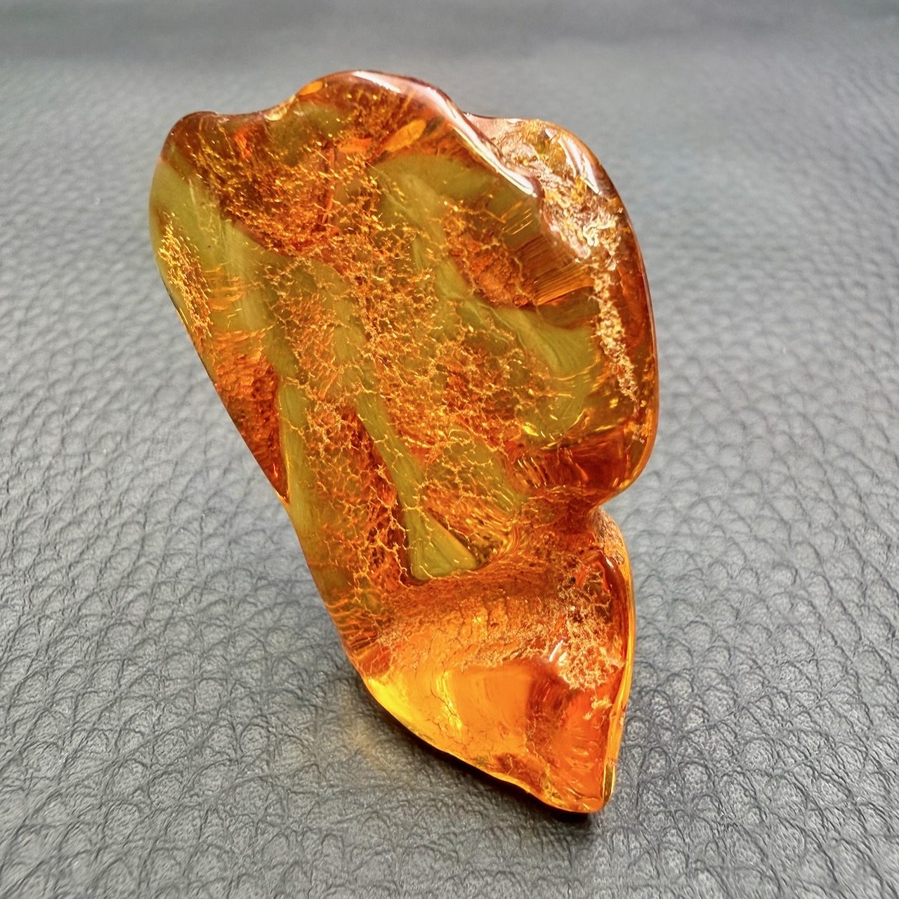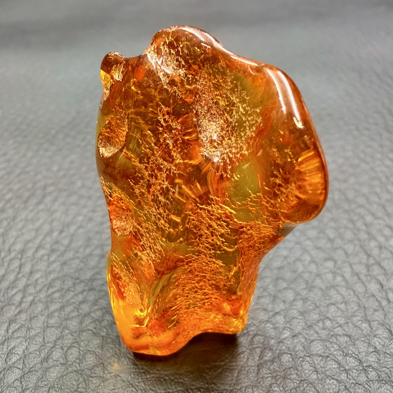 L’ambre, est la plus légère de toutes les pierres semi-précieuses, cette résine fossile est très tendre environ 2 sur l’échelle de Mohs et se raye facilement, elle possède un système cristallin amorphe.