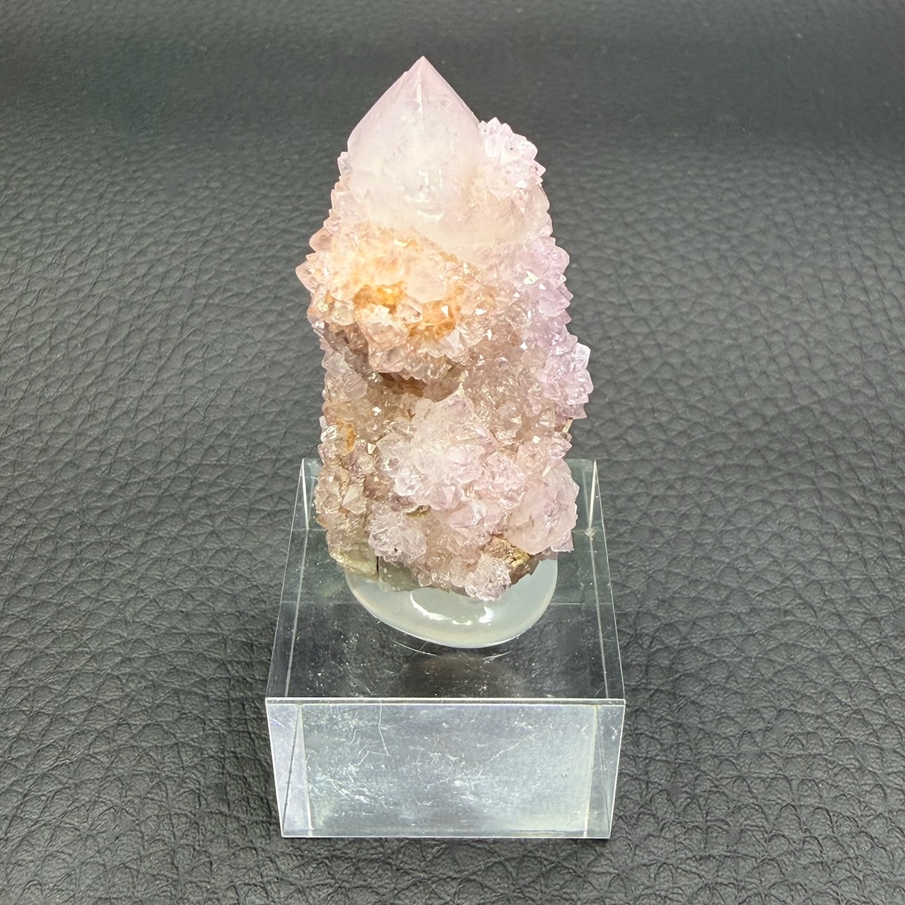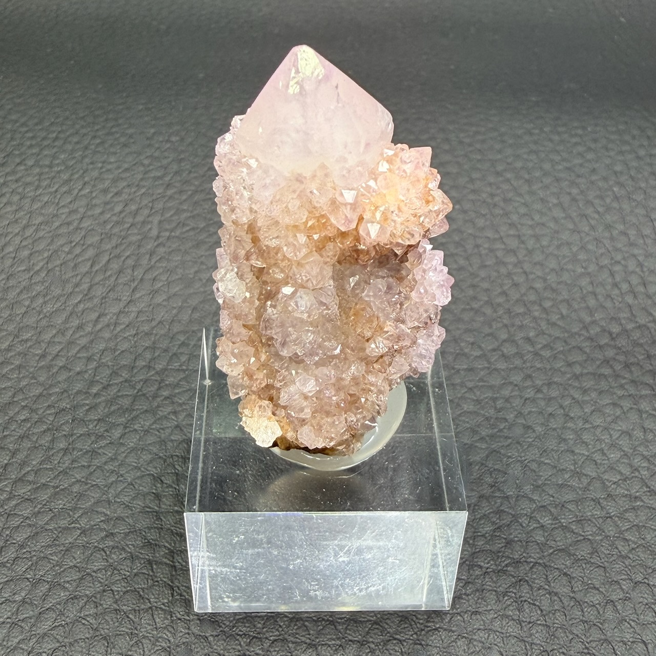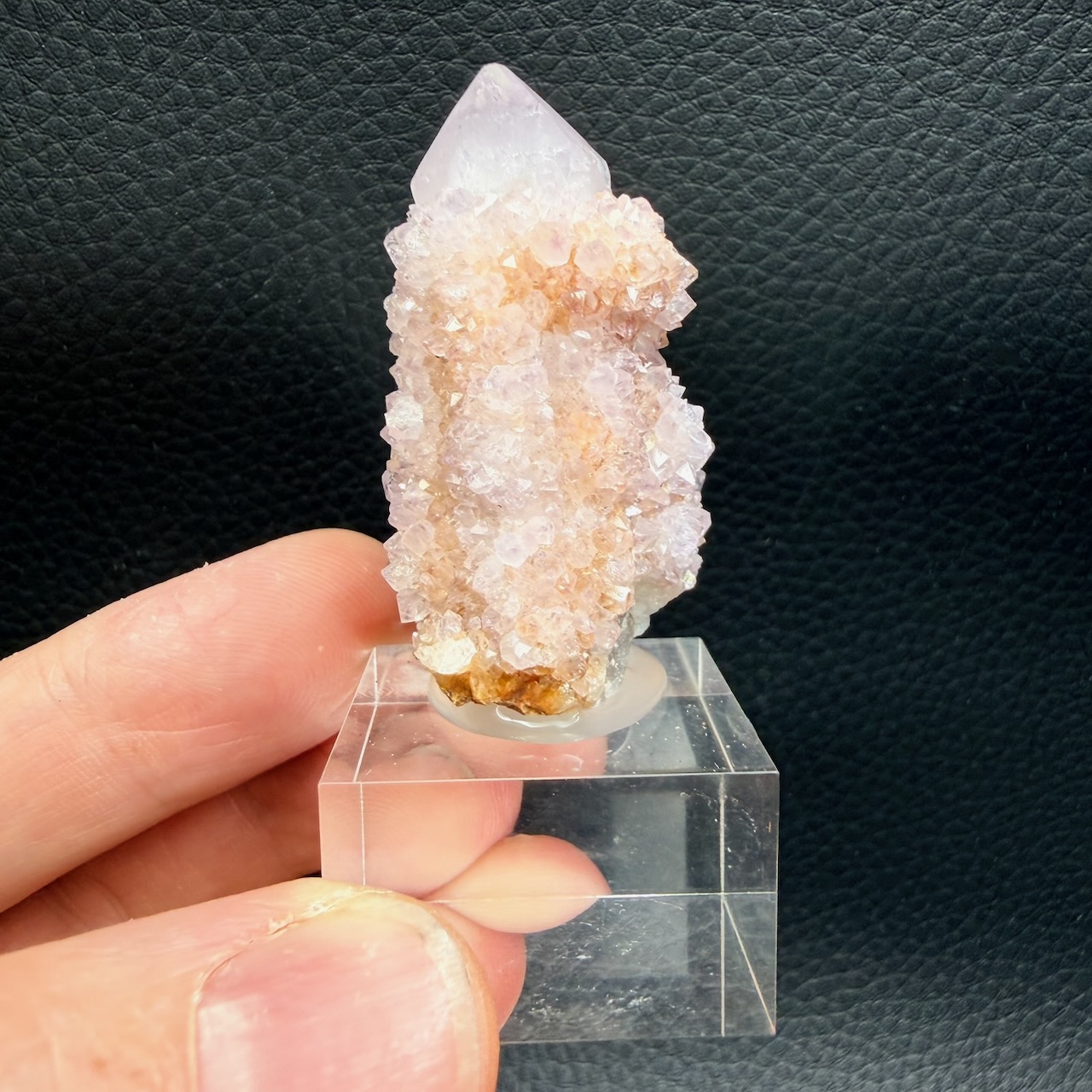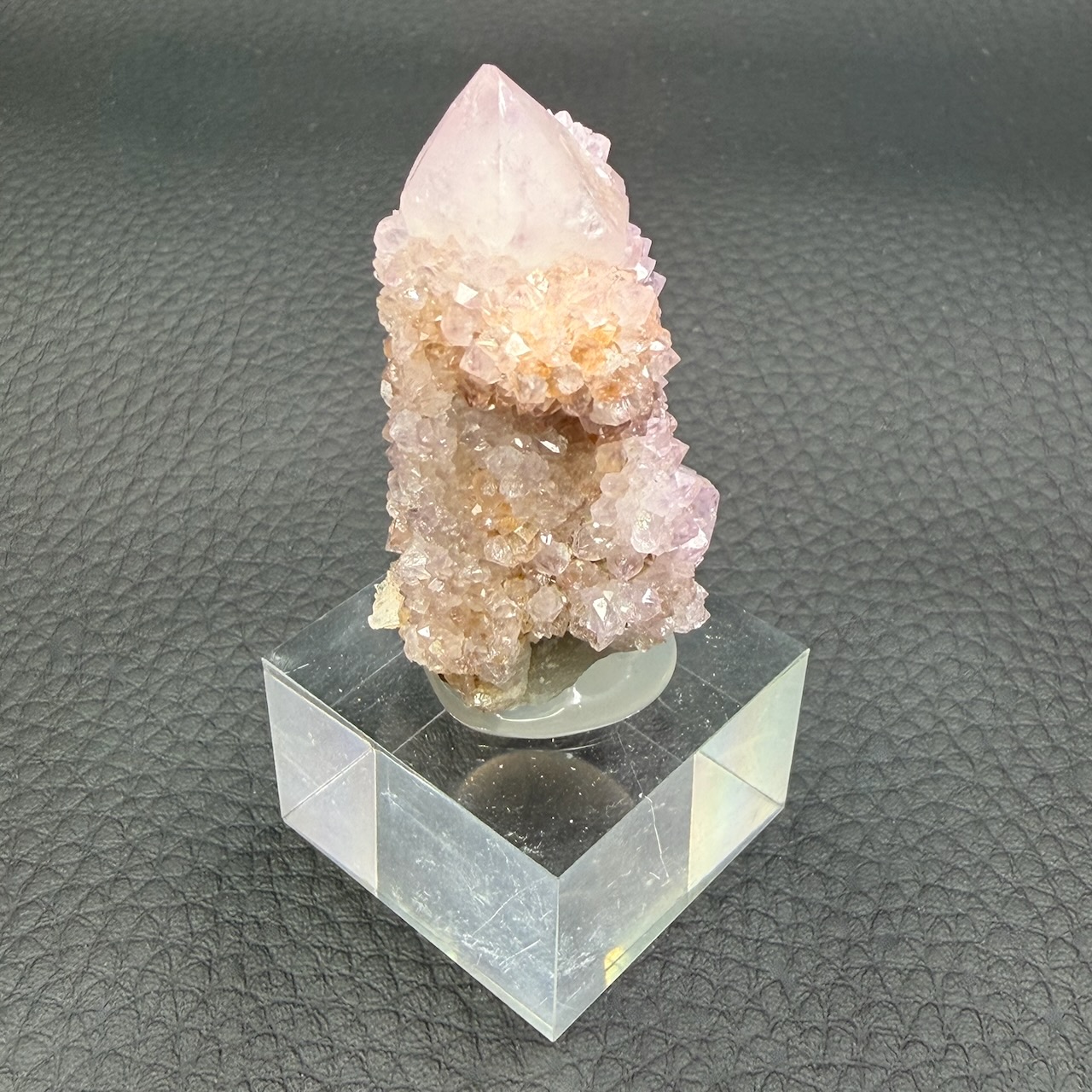L’améthyste cactus est reconnaissable au premier coup d’œil. Le cristal principal, généralement hexagonal et allongé, est recouvert d’une myriade de petits cristaux disposés de façon radiale. Cette formation donne l’impression d’une armure scintillante, ou d’une grappe de raisins figés dans la pierre.