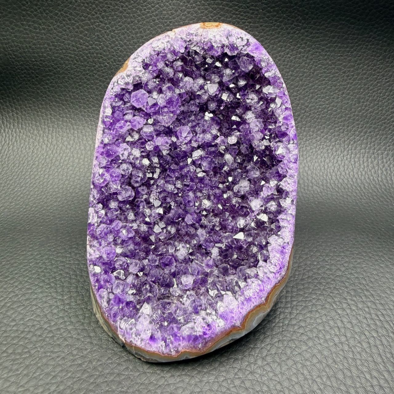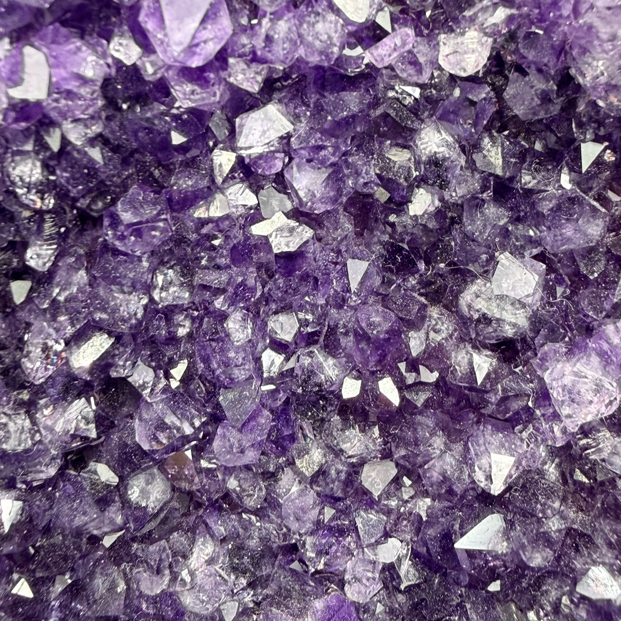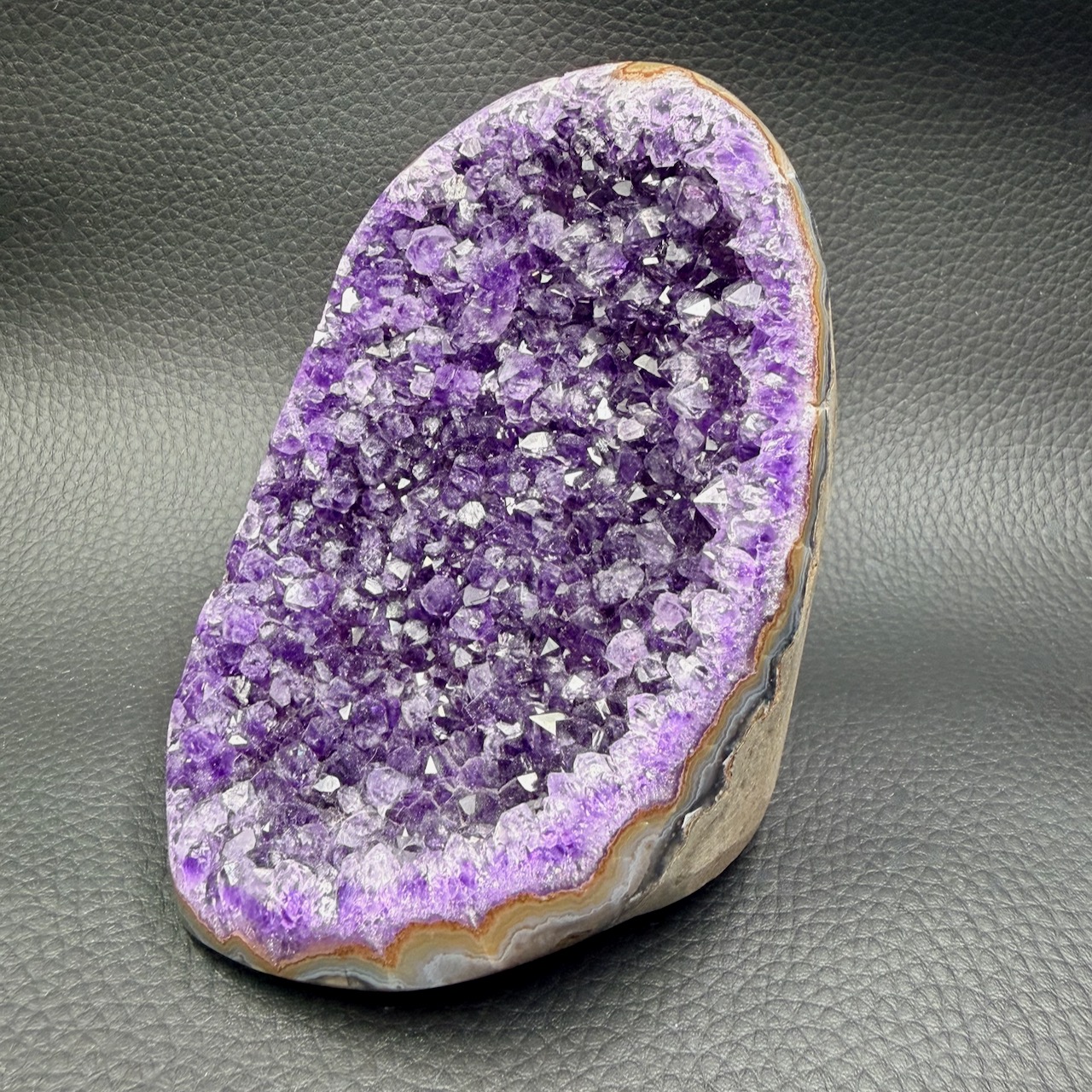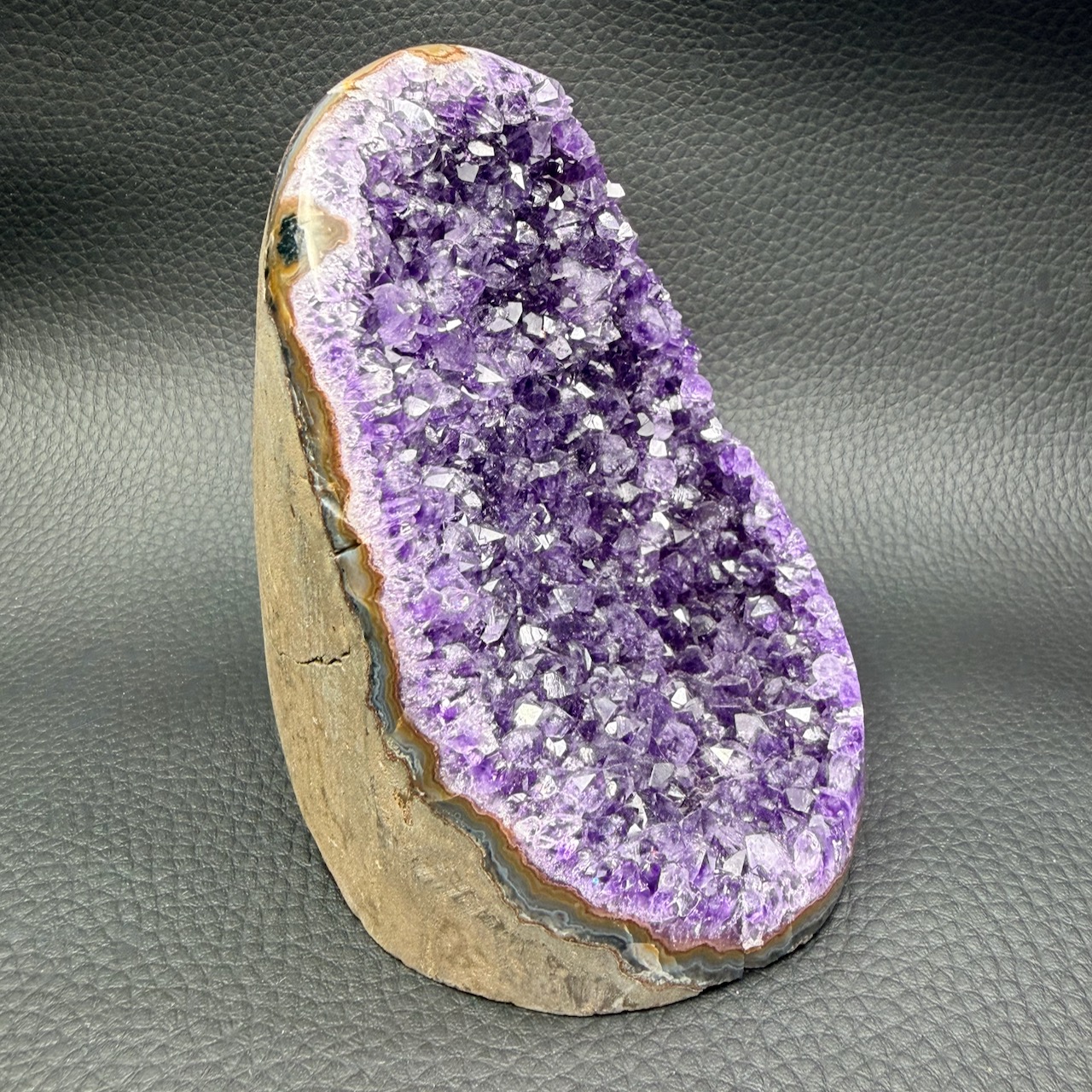 Les cristaux, souvent d’une teinte violette très profonde, sont devenus des objets de collection prisés. Cette couleur intense, spécifique à certaines formations géologiques uruguayennes, a rendu ces druses particulièrement populaires parmi les collectionneurs et les amateurs de lithothérapie.