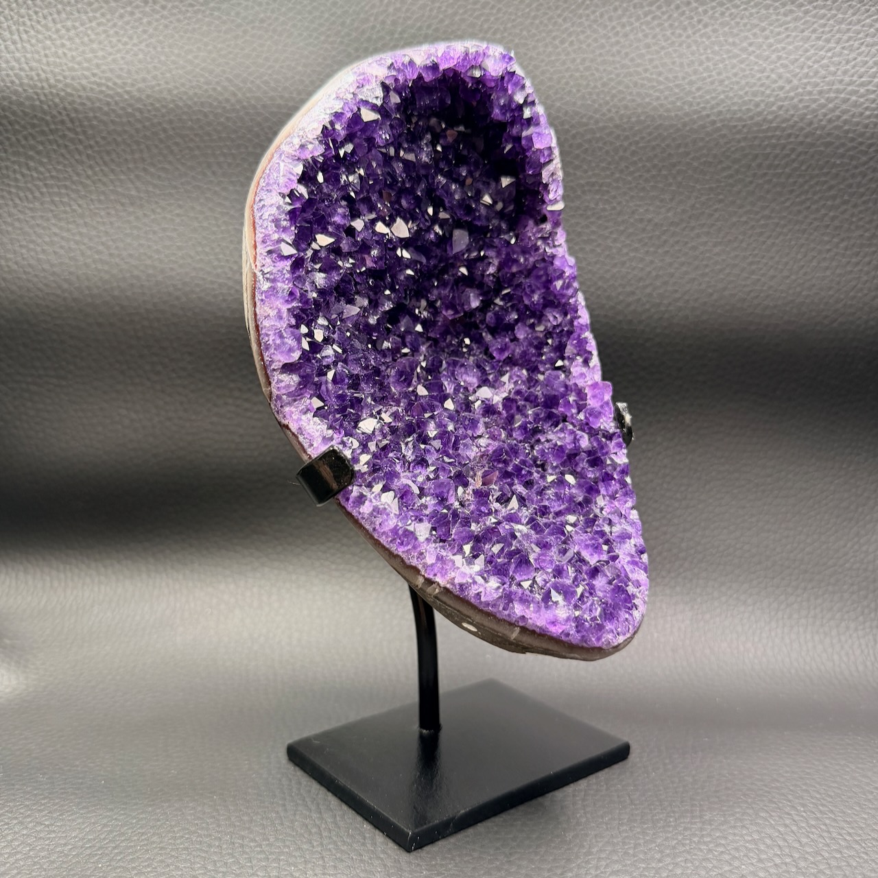 Les Géodes Impressionnantes : Les améthystes d’Uruguay se trouvent fréquemment sous forme de géodes, ces cavités rocheuses tapissées de cristaux brillants. Les géodes uruguayennes sont souvent de taille plus petite mais plus denses en cristaux, offrant une concentration élevée de minéraux de qualité.