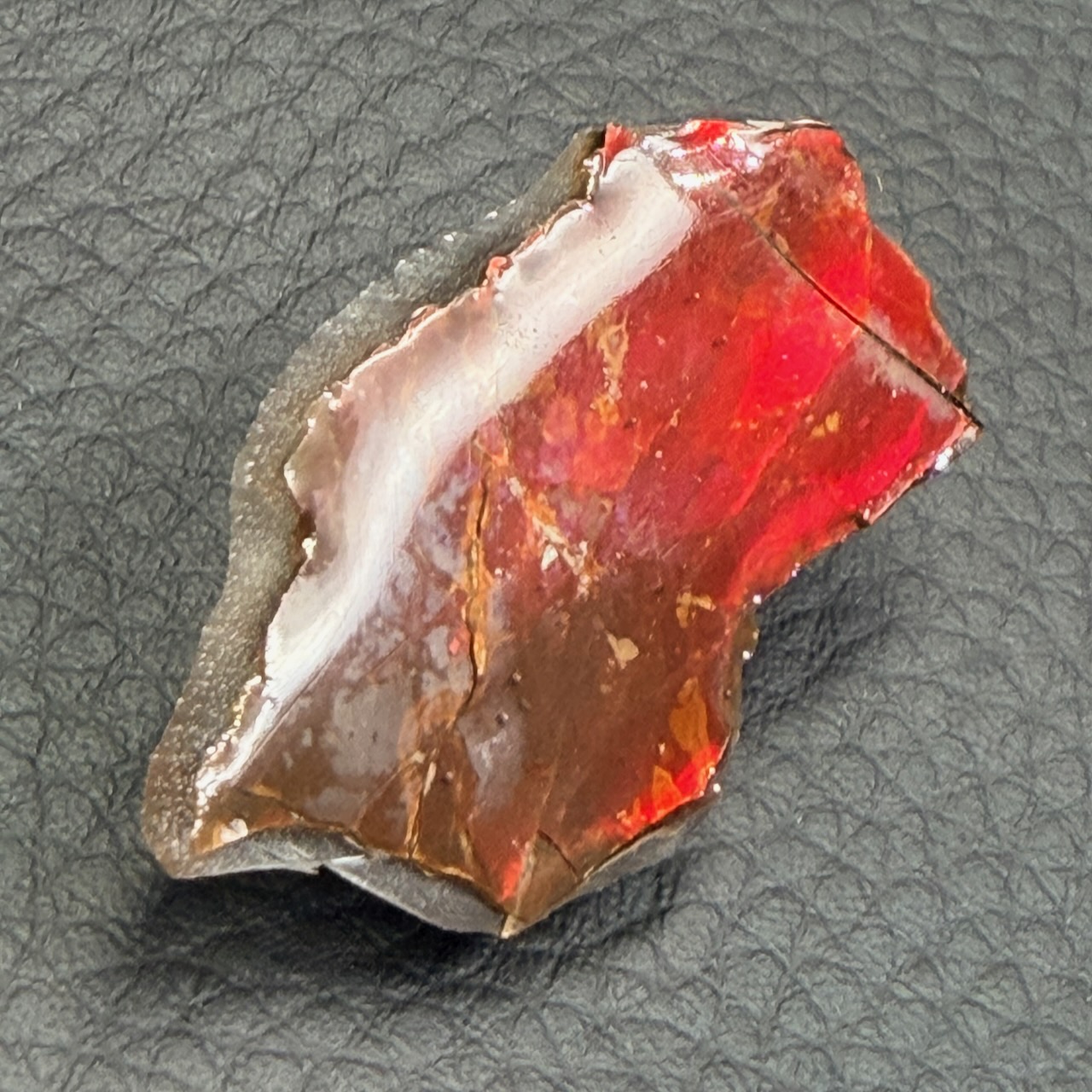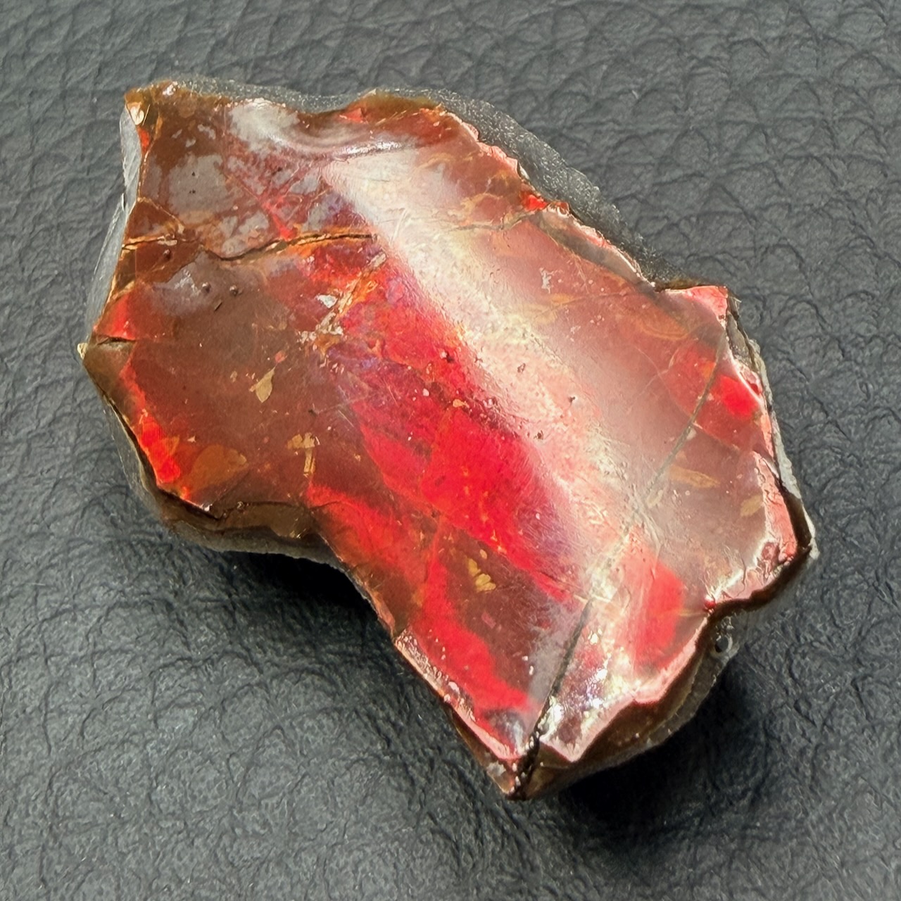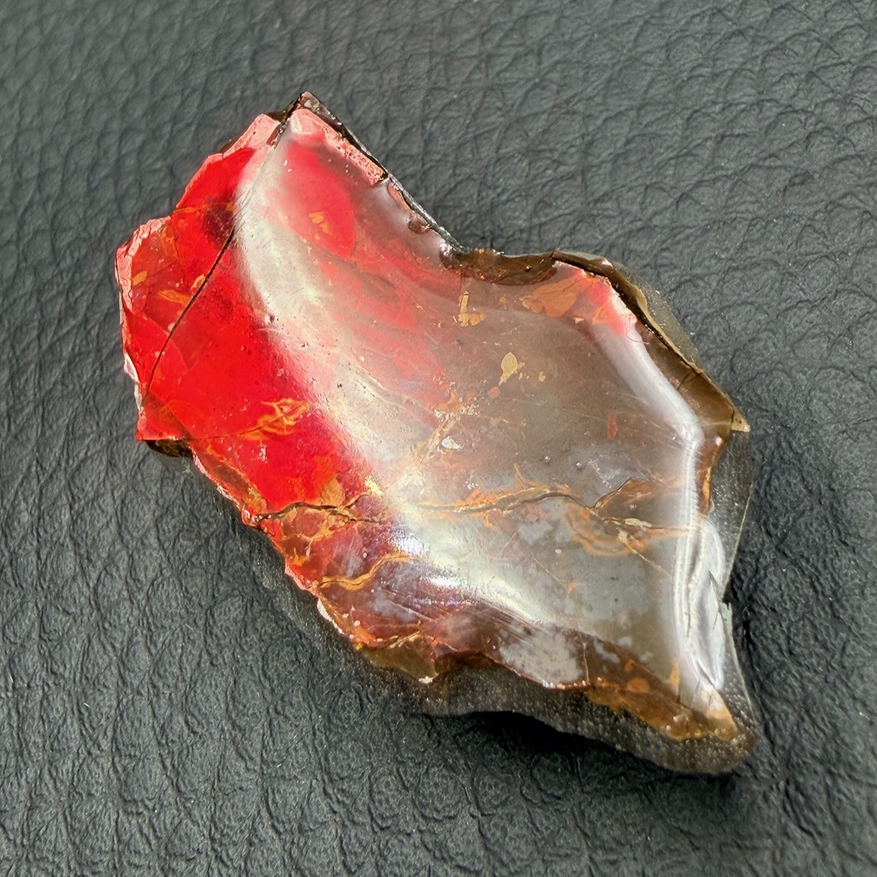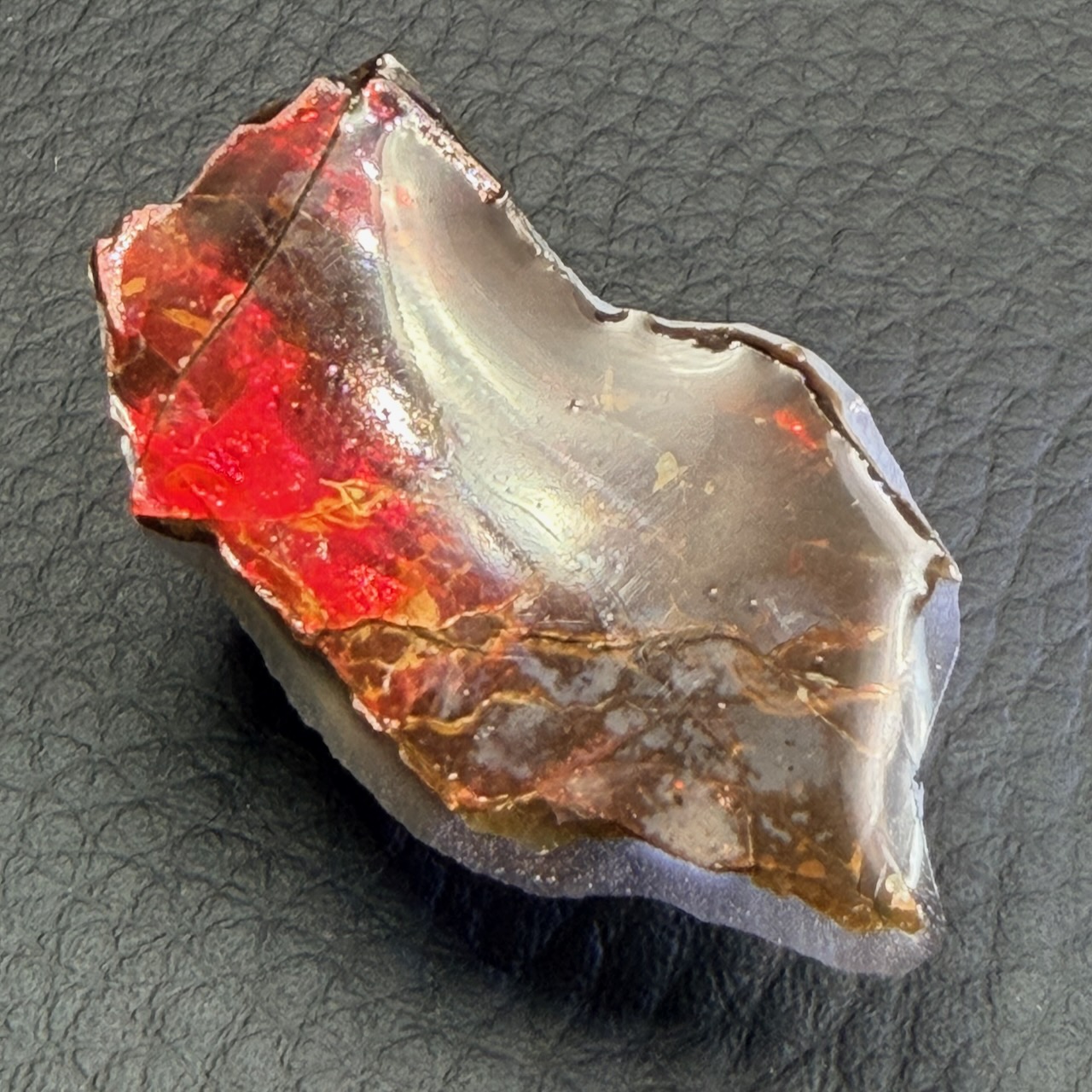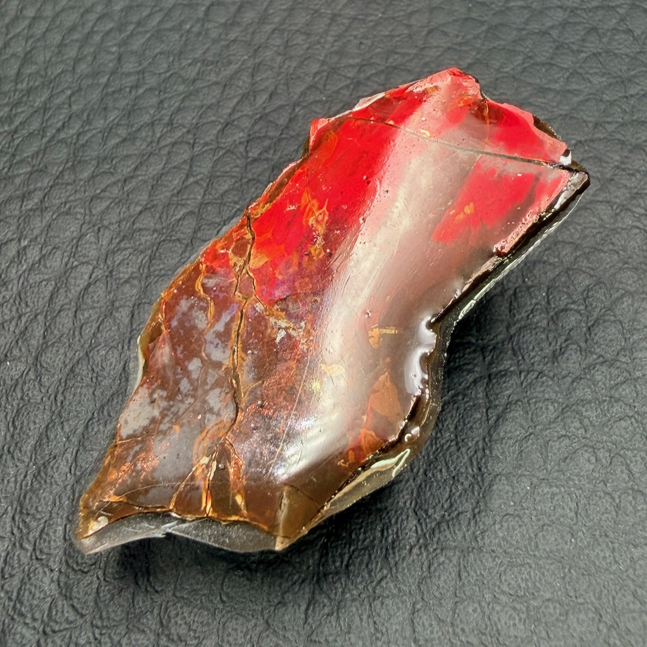 L’ammolite ce constitue d’une couche très mince, environ 0,5 à 0,8 mm d’épaisseur sur la roche, en règle générale on la retrouve avec sa matrice rocheuse.