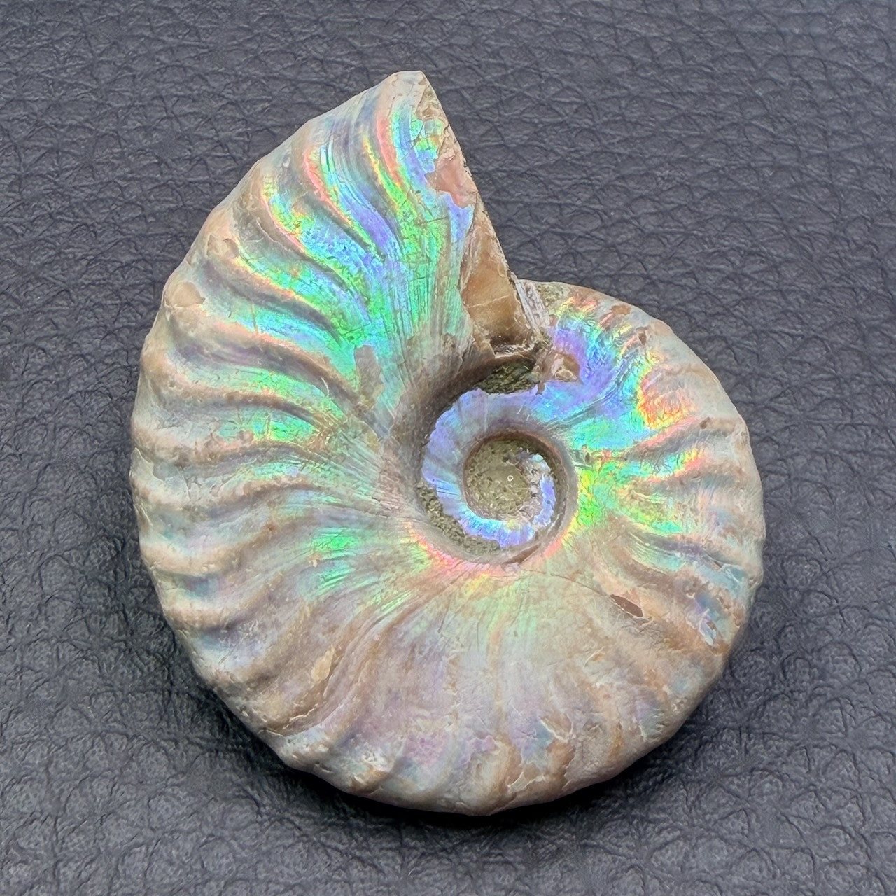 L’ammonite iridescente est une succession de couches irisée et nacrée reflétant les rayons de la lumière dans la coquille fossilisée.