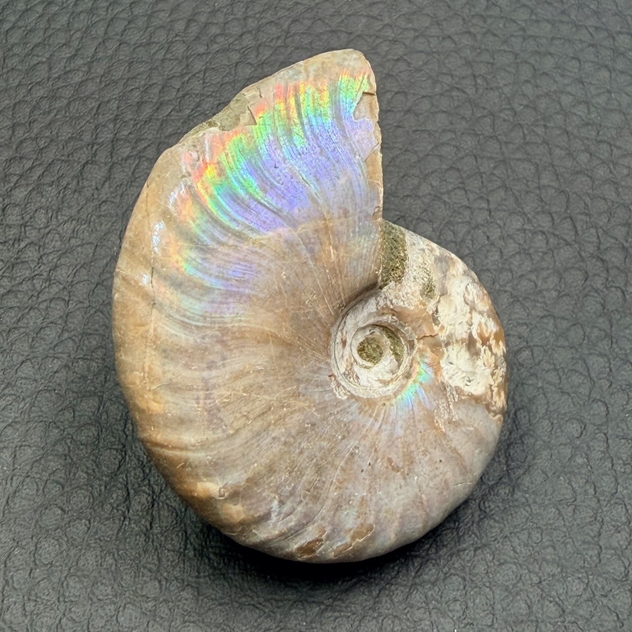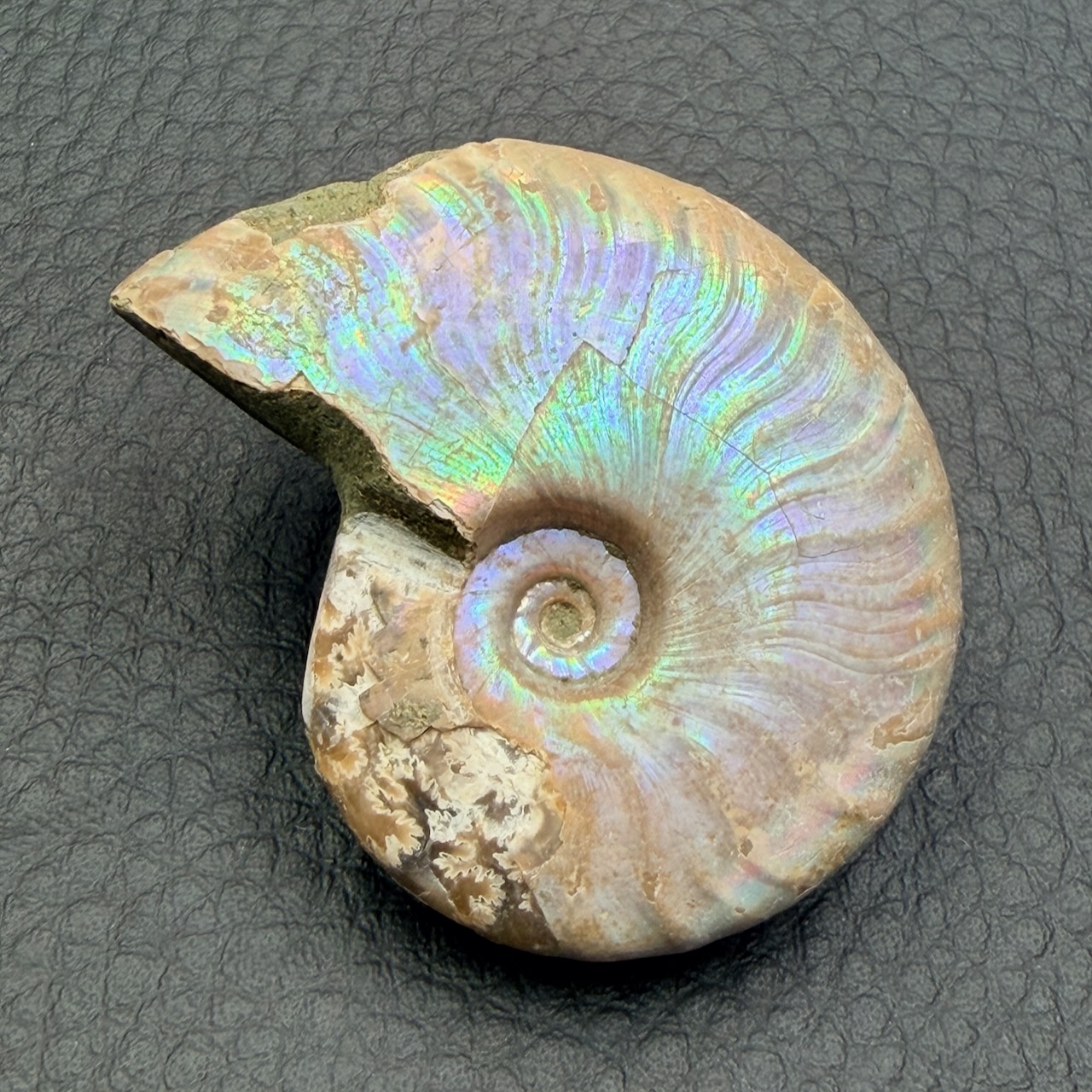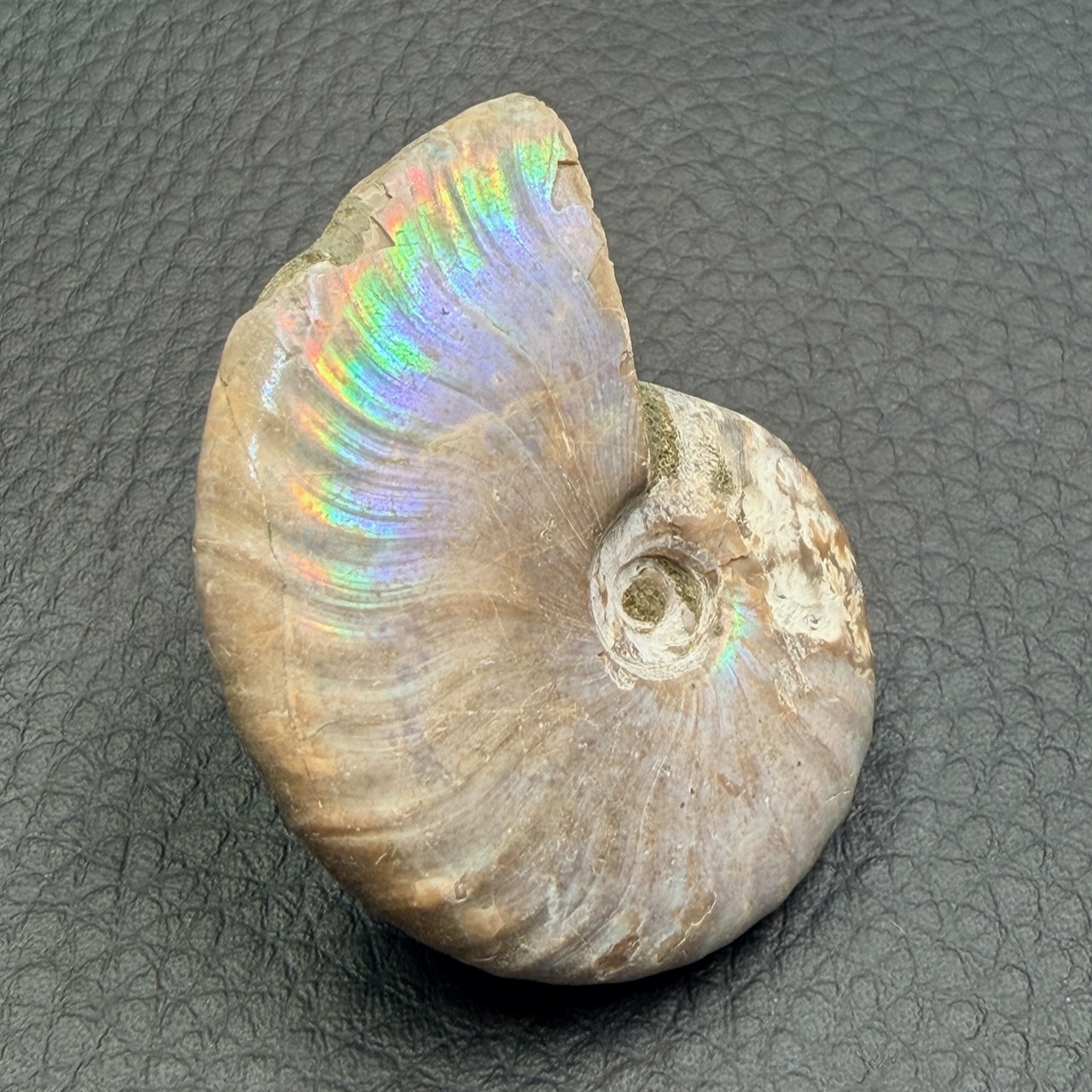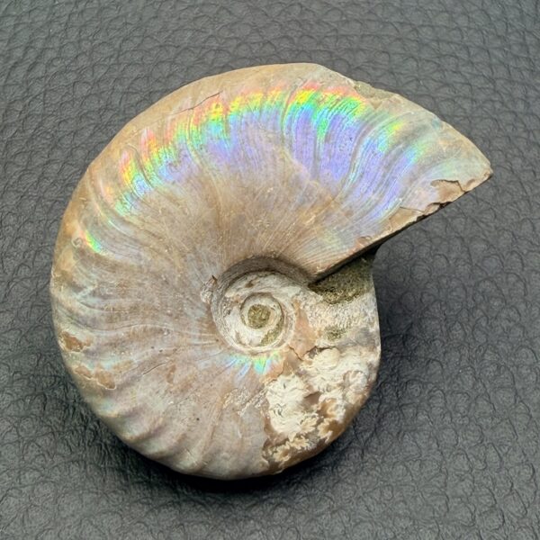 Les teintes chatoyantes de l’ammonite nacrée sont dues à une propriété physique fascinante : la diffraction de la lumière. La nacre fossilisée conserve sa structure en couches ultra-fines, qui agissent comme un prisme. Lorsque la lumière frappe ces couches, elle se décompose en différentes longueurs d’onde, produisant des reflets violets, bleus, verts, jaunes ou rouges.