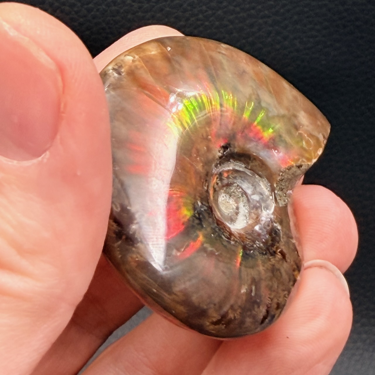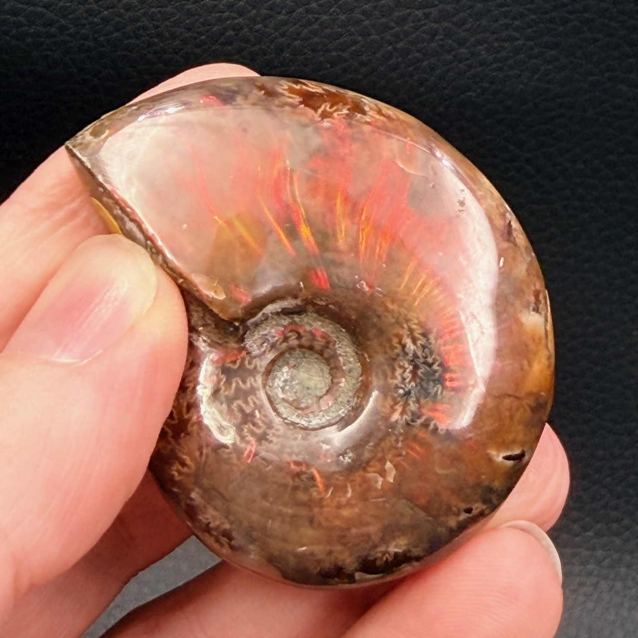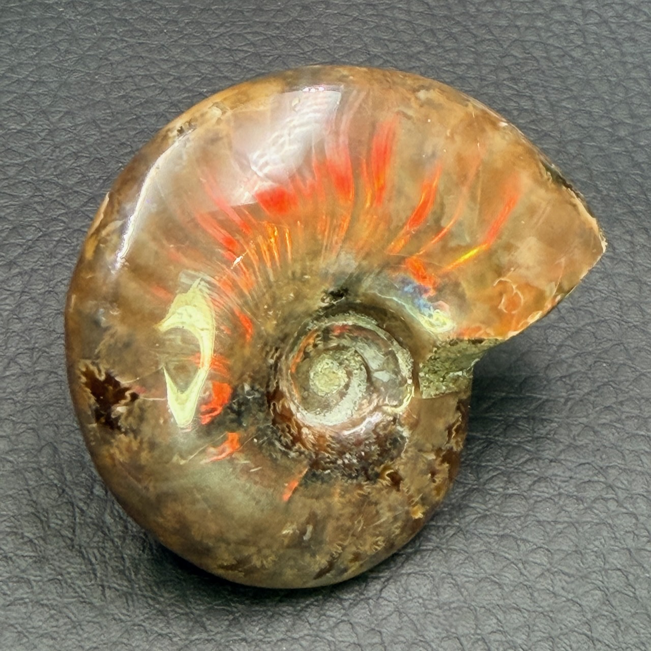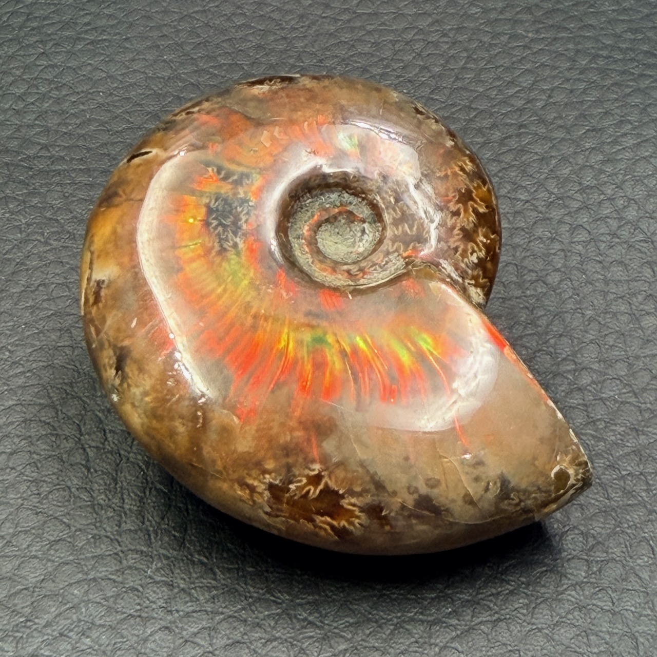 Lorsqu’il est maîtrisé, le polissage transforme l’ammonite opalisée en une surface lisible, presque tactile. Les chambres internes deviennent visibles, la spirale s’affirme, et les reflets apparaissent comme suspendus dans la pierre.