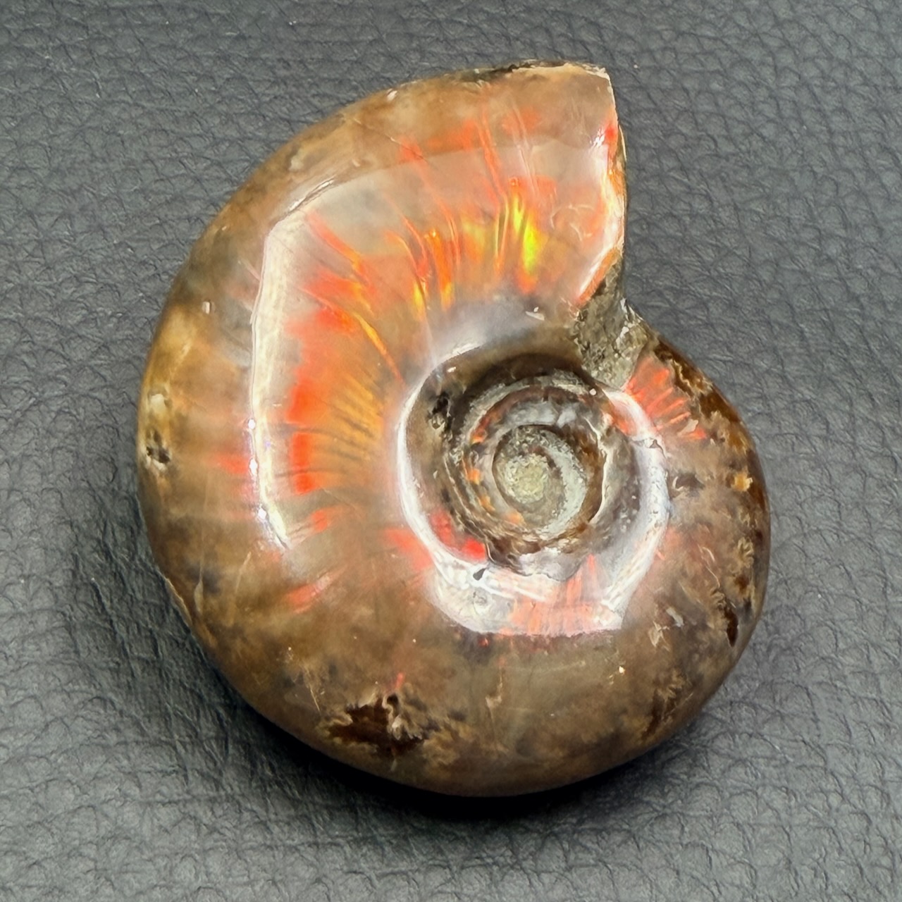 L’ammolite est une gemme organique reconnue, issue principalement des ammonites du genre Placenticeras, extraites en Alberta. Elle se caractérise par une couche aragonitique très fine, extrêmement colorée, mais fragile.