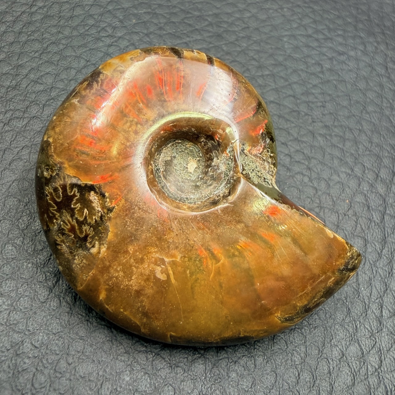 Intégré à une collection de fossiles, le Cleoniceras iridescent occupe une place singulière. Il dialogue à la fois avec les ammonites plus classiques et avec des pièces plus minéralisées. Sa surface changeante crée un contraste subtil avec les fossiles à teinte uniforme.
