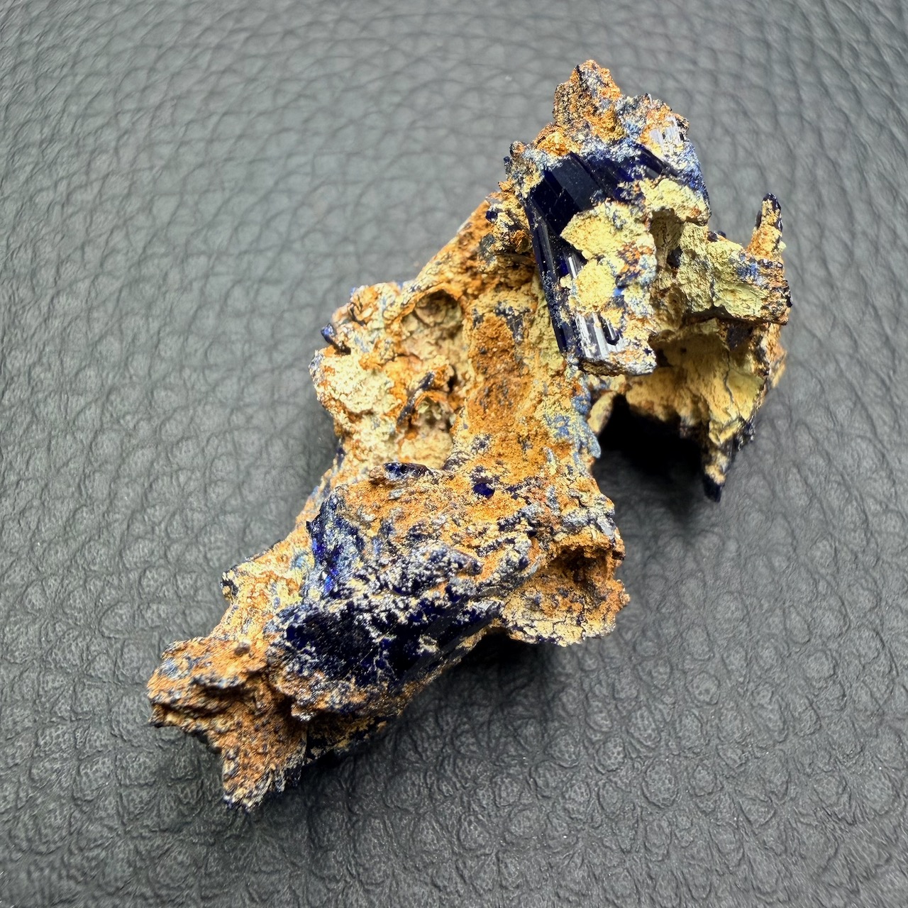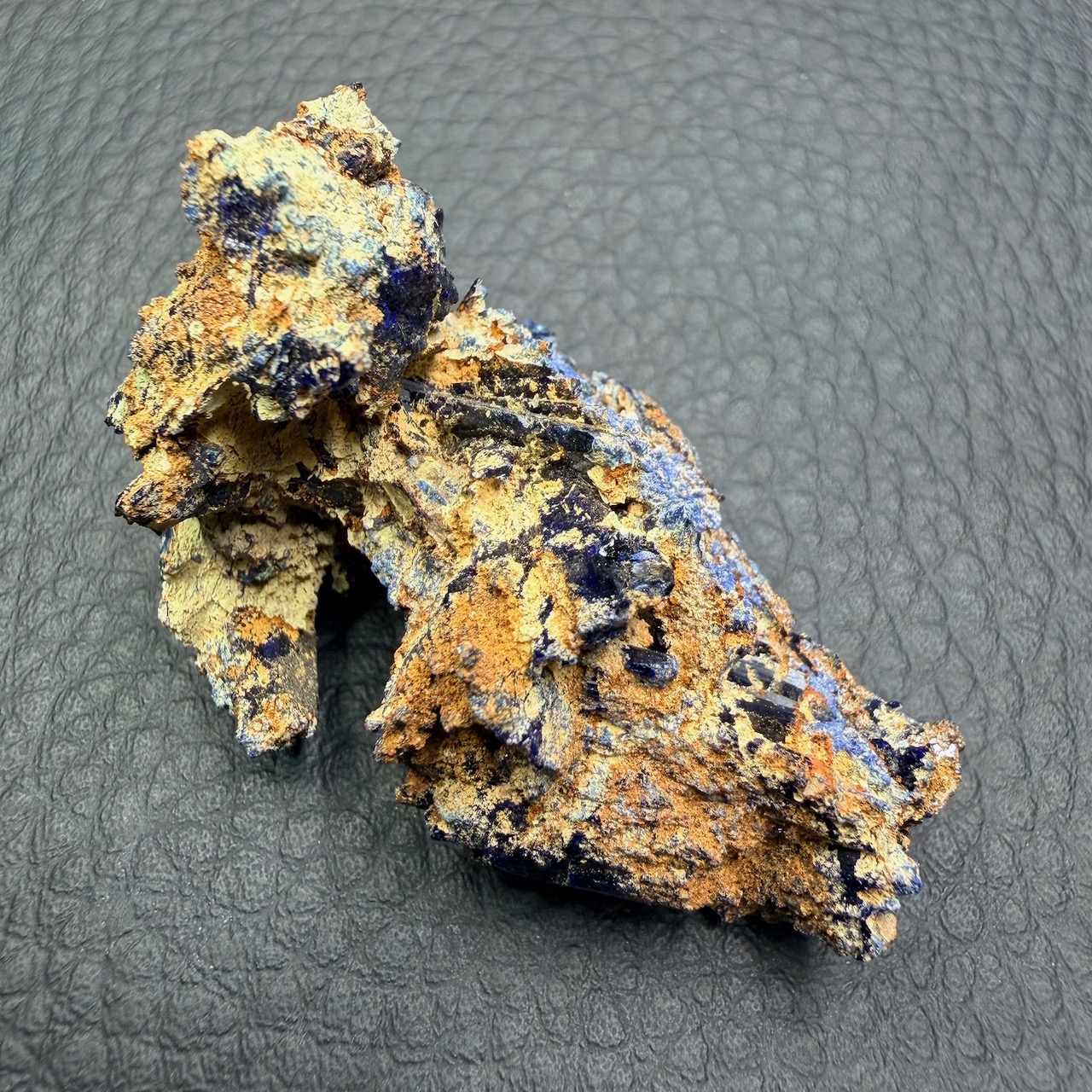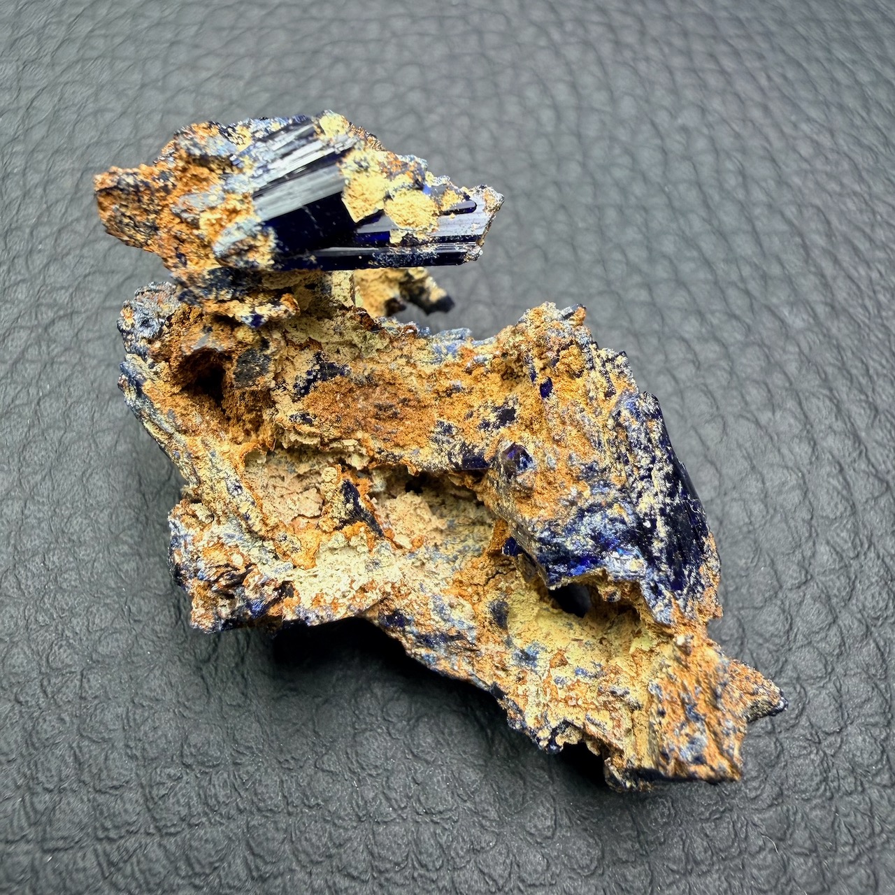 D’une couleur bleu profond, souvent avec des taches de vert qui son du a son association avec de la malachite.