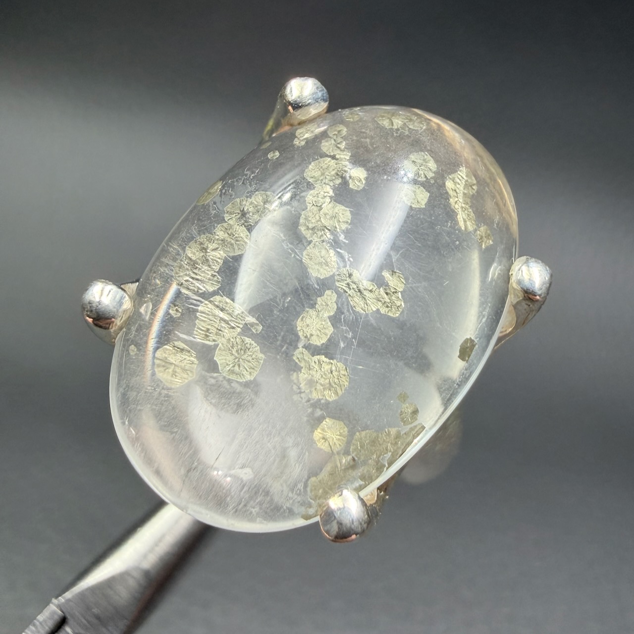 Le polissage du cristal de roche est une étape délicate : il doit révéler la clarté interne tout en respectant la structure fragile des inclusions de pyrite. La taille influence directement la perception des reflets et des inclusions, tandis que le sertissage assure la protection de la pierre et met en valeur son caractère exceptionnel.