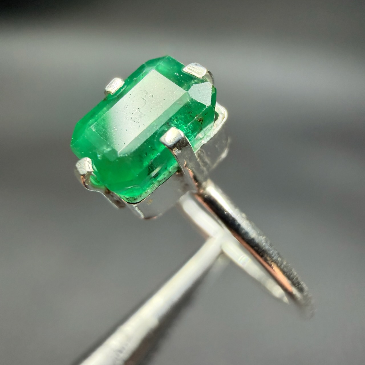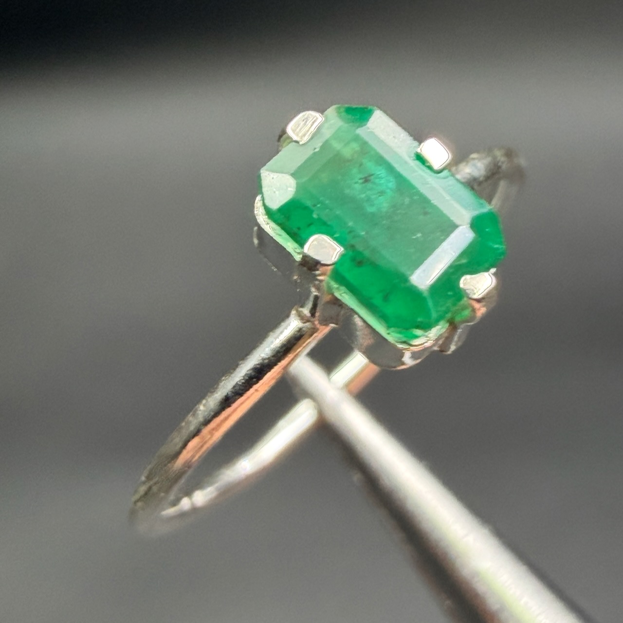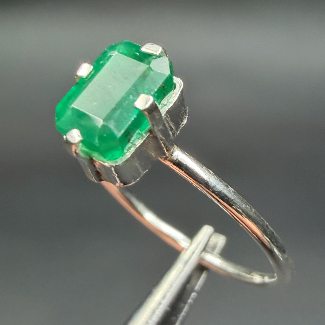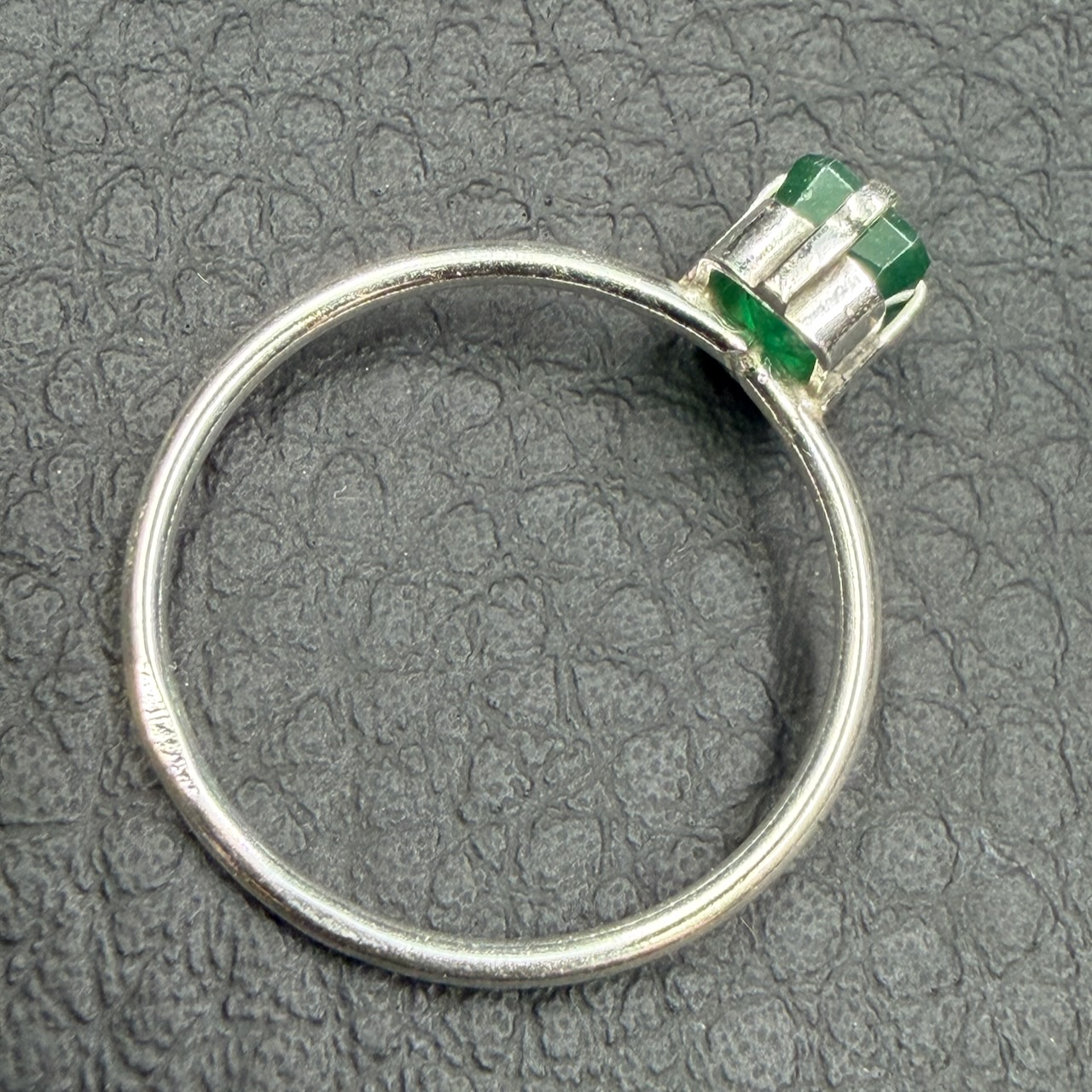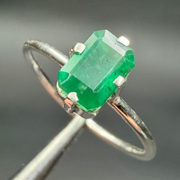 Taille de la pierre ornant la bague en émeraude 0,7 cm sur 0,5 cm sur 0,4 cm.