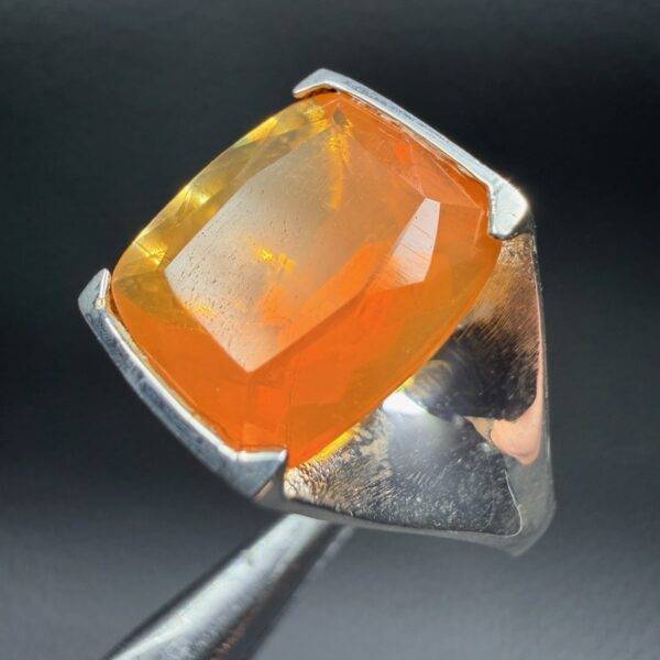 2. Effet de « chatoyance interne » dans certaines matrices mexicaines : Certaines opales de feu extraites au Mexique présentent des inclusions de matière volcanique qui créent un voile fin à l’intérieur de la pierre, renforçant le scintillement sous lumière rasante. Cette caractéristique peut donner à la bague en opale de feu un éclat presque « poussière d’or ».