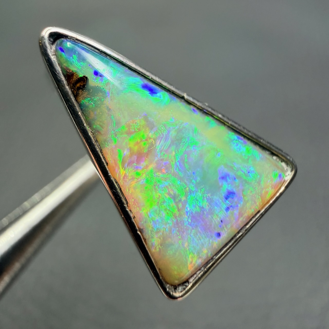 C’est une variété d’opale précieuse australienne présentant un jeu de couleur intense et souvent sertie dans sa roche mère ferrugineuse. Elle se distingue par sa profondeur chromatique et sa stabilité naturelle.