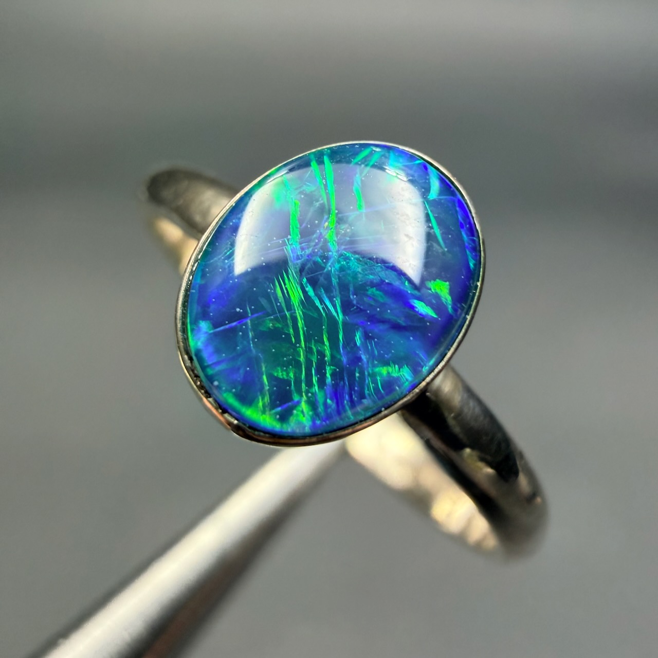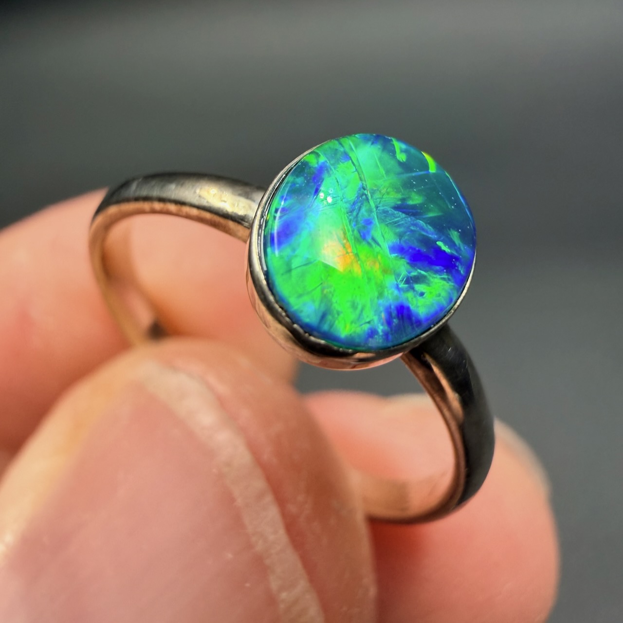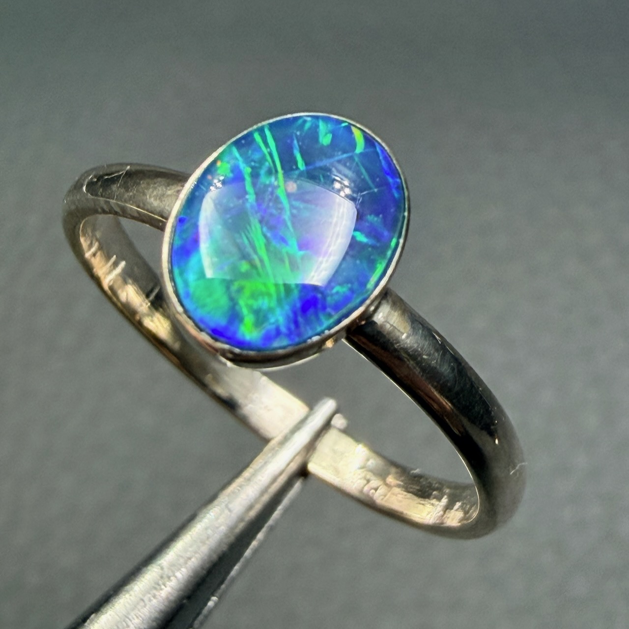 Cela dit, certaines zones spécifiques du gisement ont livré des opales noires d’une intensité rare, aux reflets bleu, vert ou pourpre profond. Ces gemmes, lorsqu’elles sont montées en bague, offrent un contraste saisissant : le fond sombre de la pierre magnifie la couleur, et le feu iridescent semble flotter à la surface.