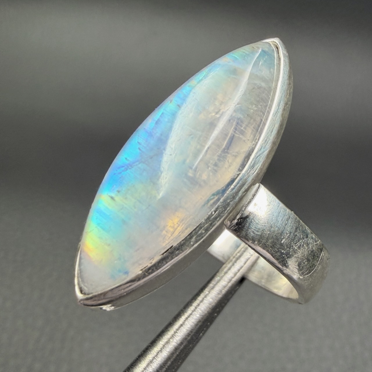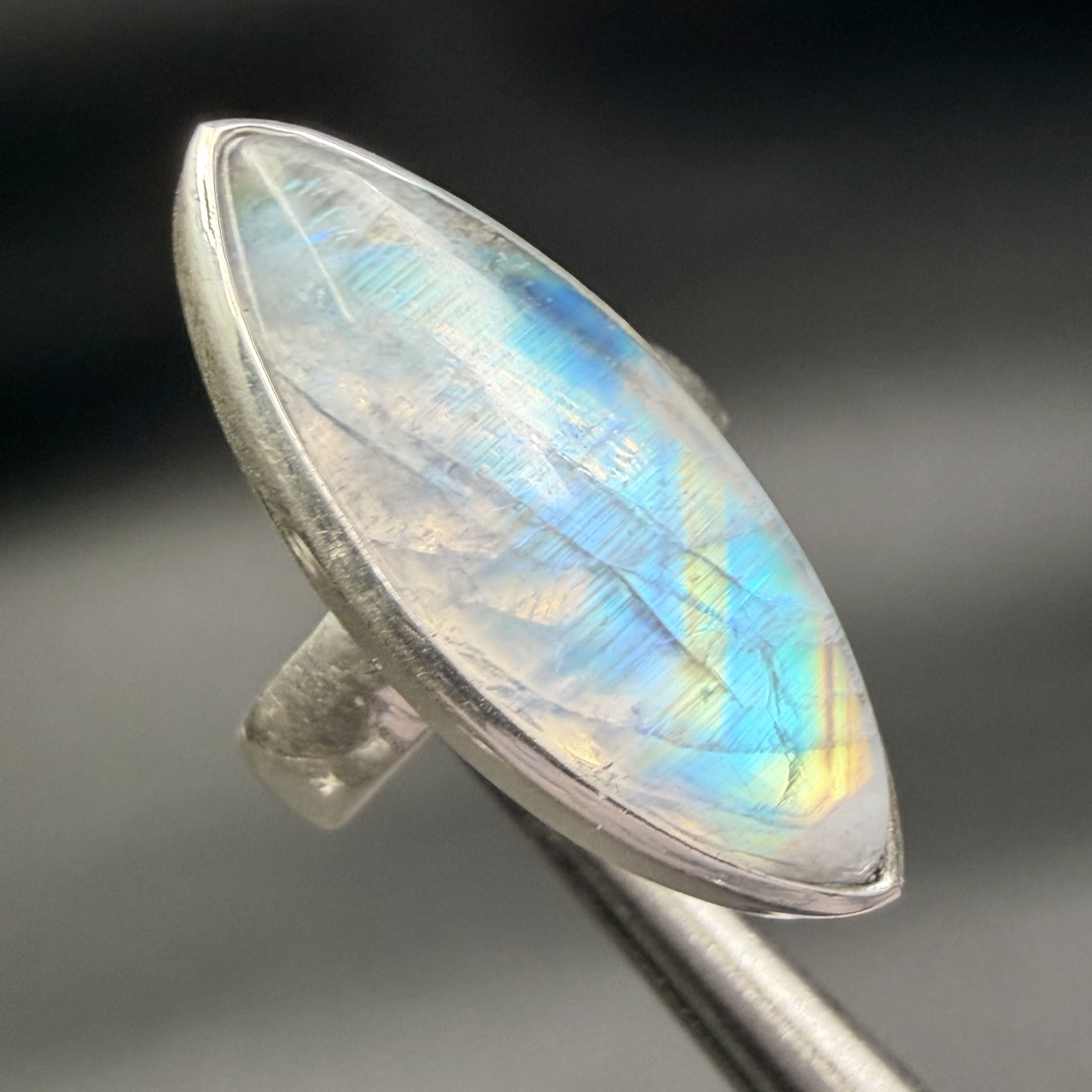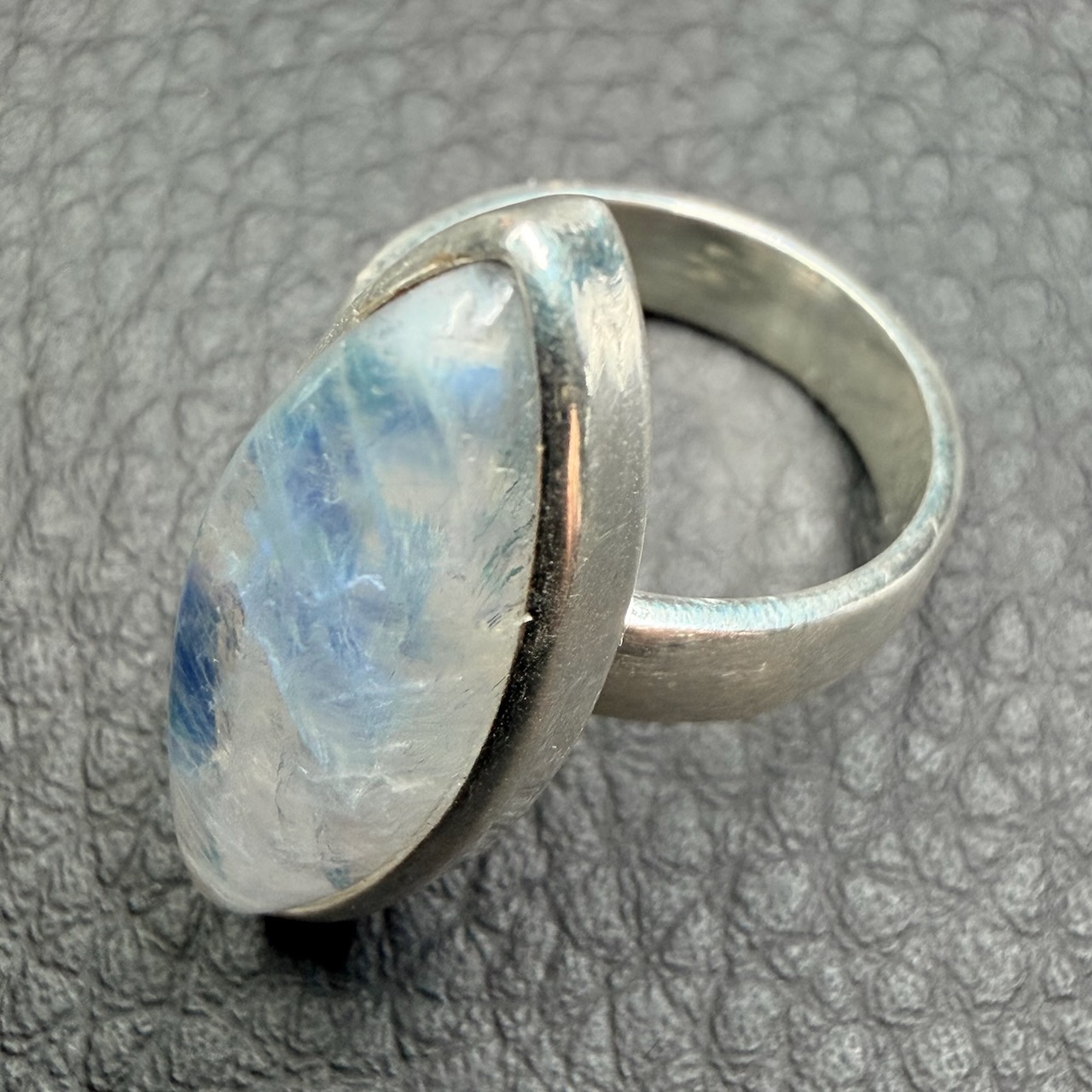 La bague en péristérite se révèle un véritable joyau aux multiples facettes. Sa pierre, d’une blancheur immaculée parée de reflets irisés bleutés et nacrés, évoque la douce lumière lunaire et les mystères féminins.