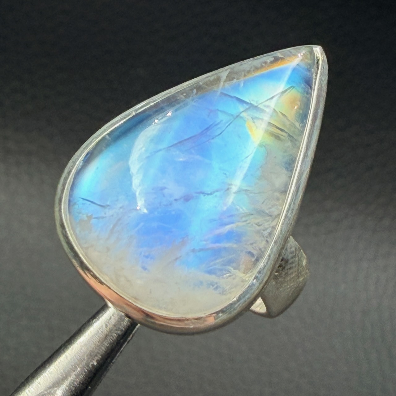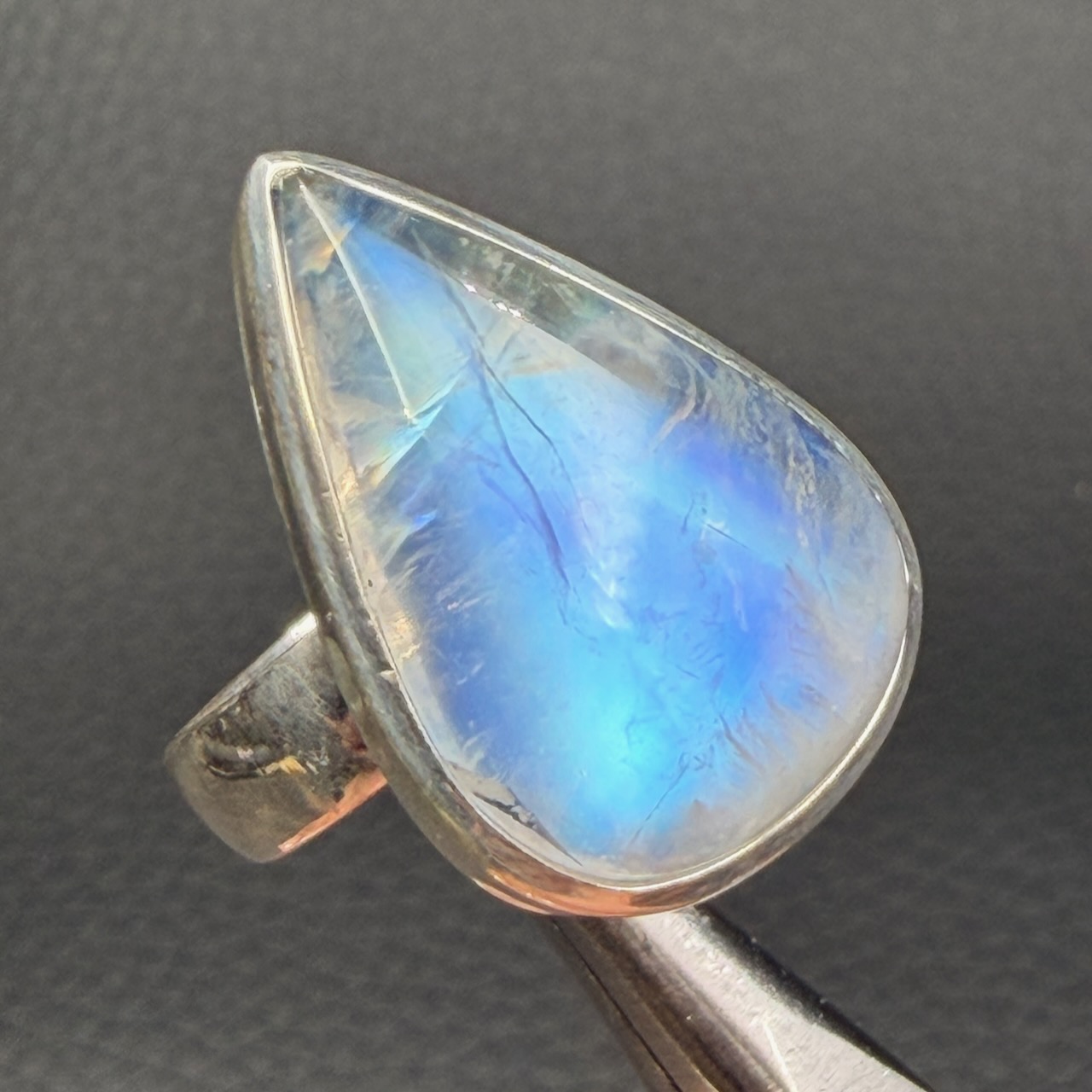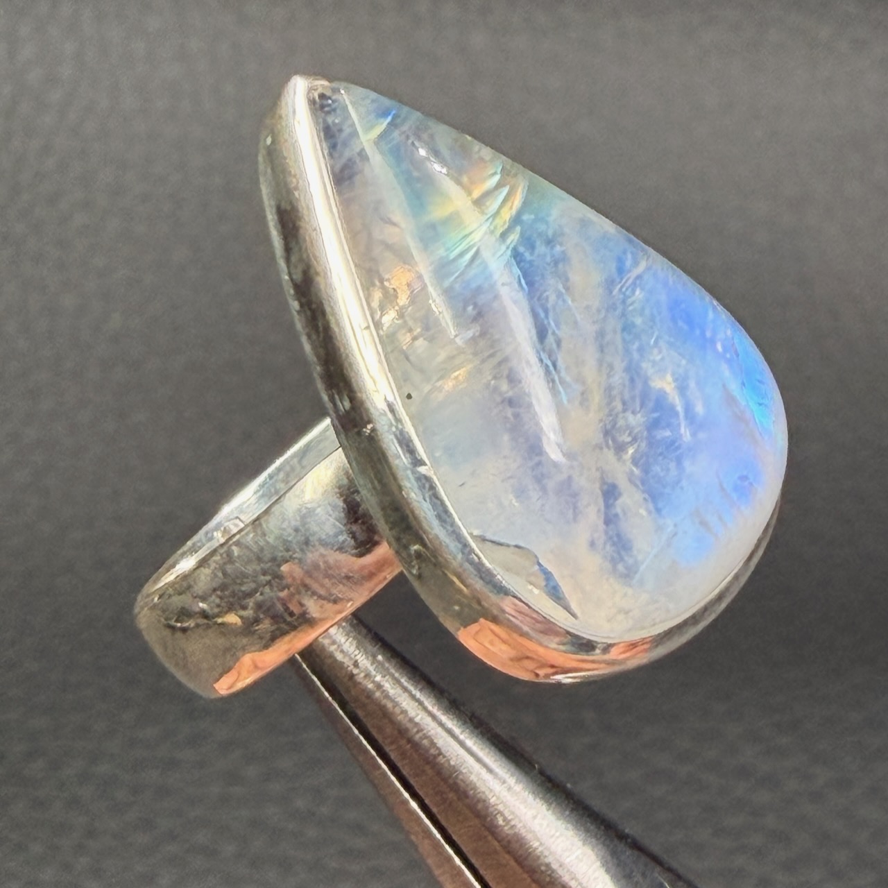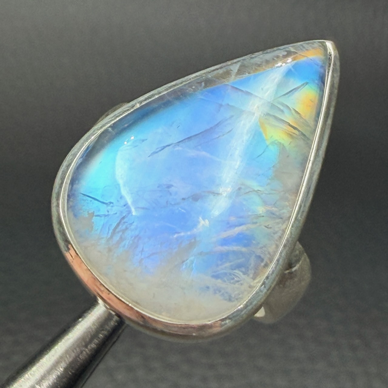 La bague en péristérite se révèle un véritable joyau aux multiples facettes. Sa pierre, d’une blancheur immaculée parée de reflets irisés bleutés et nacrés, évoque la douce lumière lunaire et les mystères féminins.