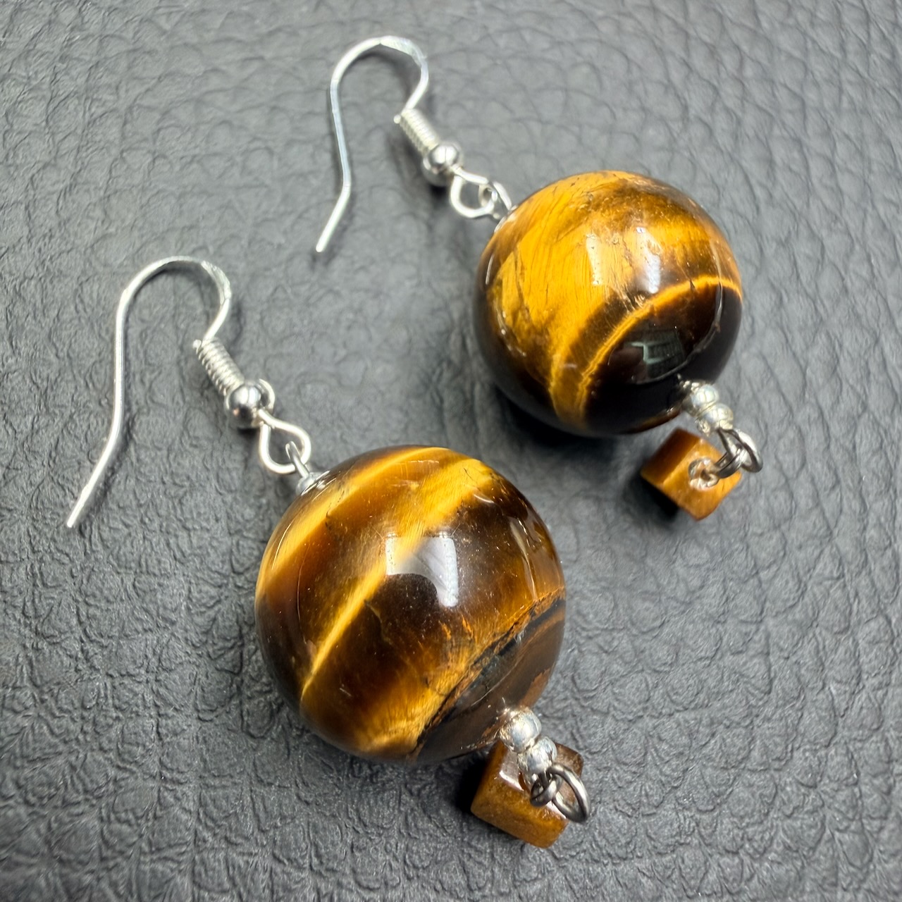 Taille des boucles d’oreilles en oeil de tigre : 5,2 cm de longueur avec perles de 16 mm.