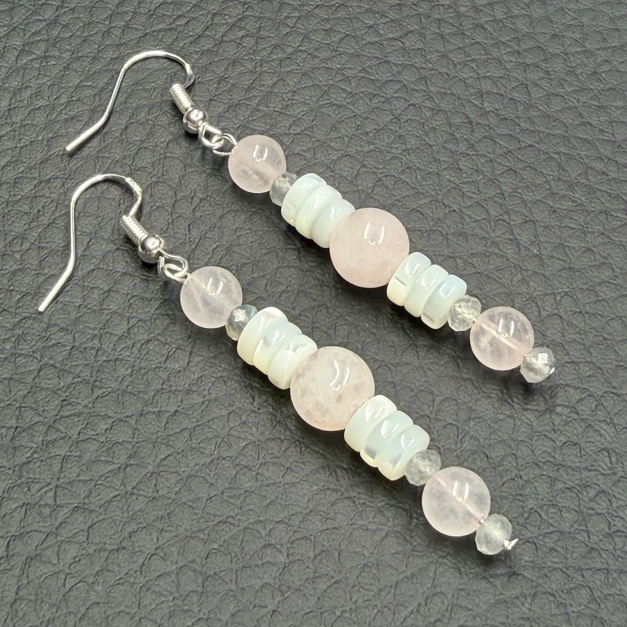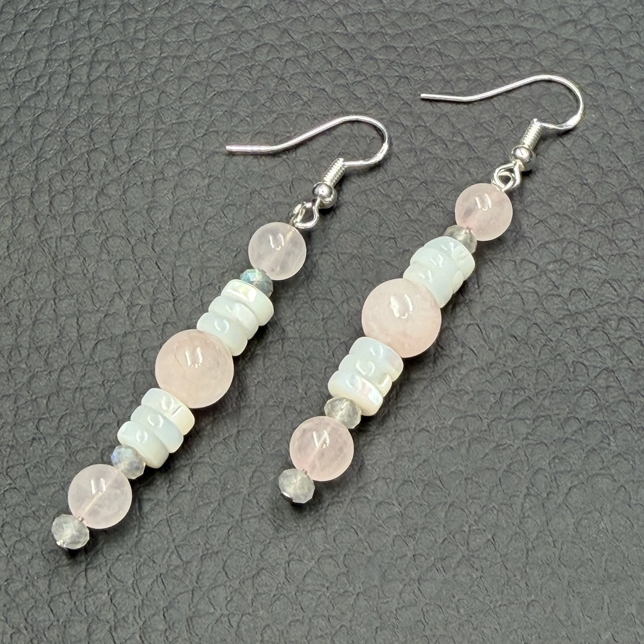 Boucles d’oreilles en quartz rose et nacre blanche.
