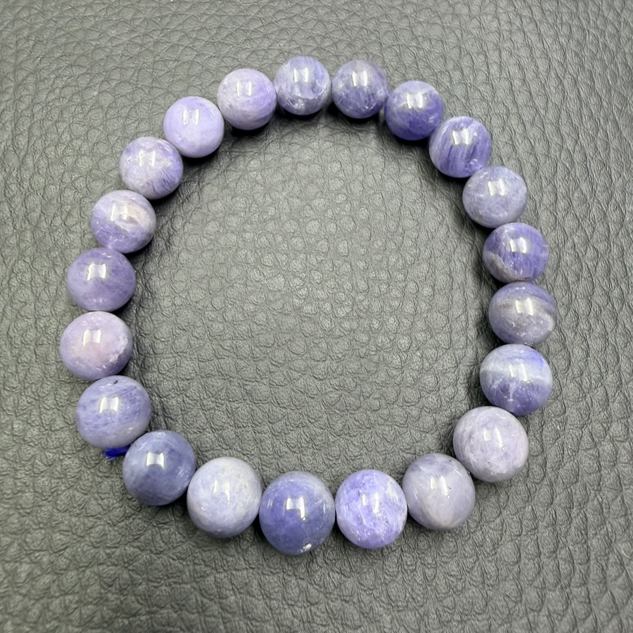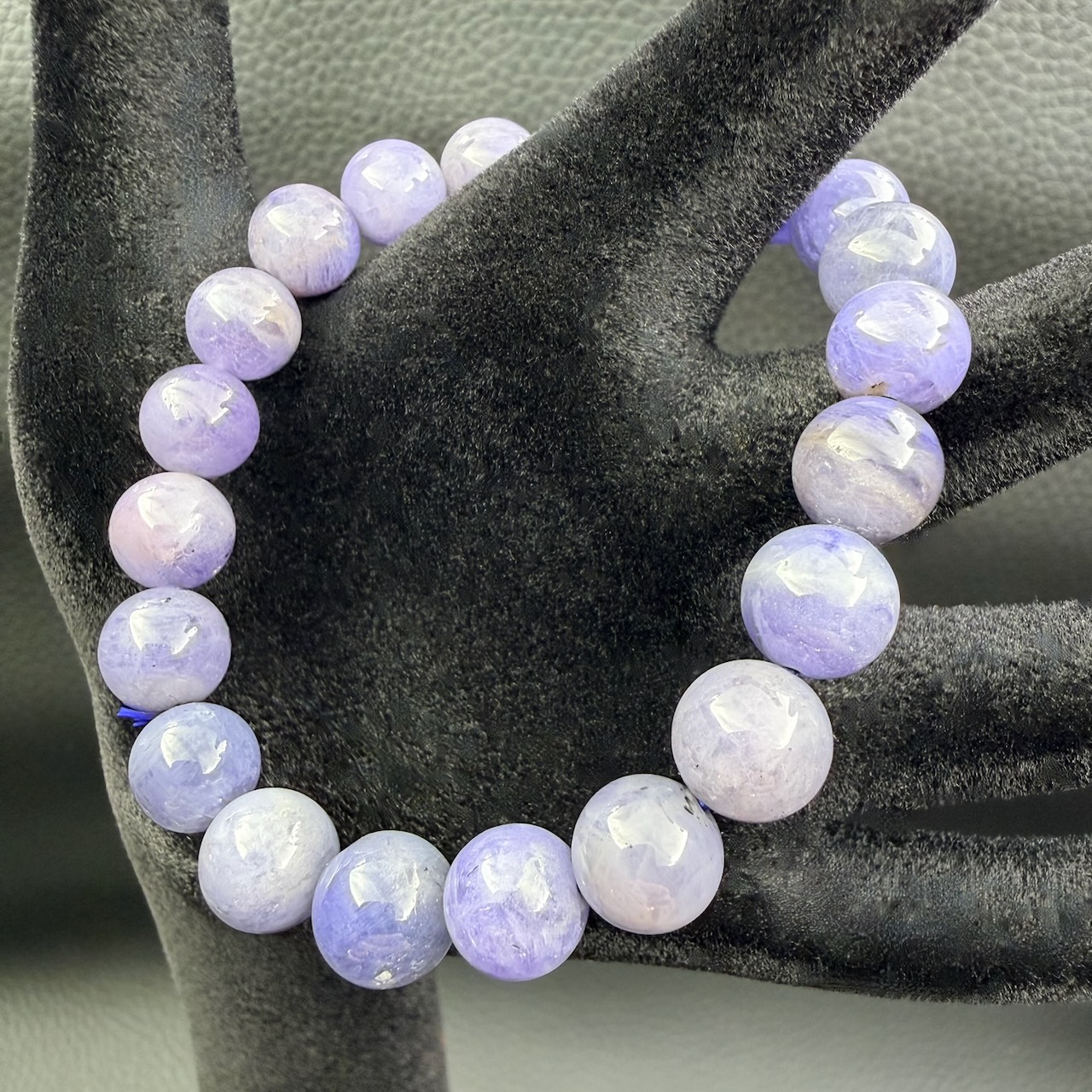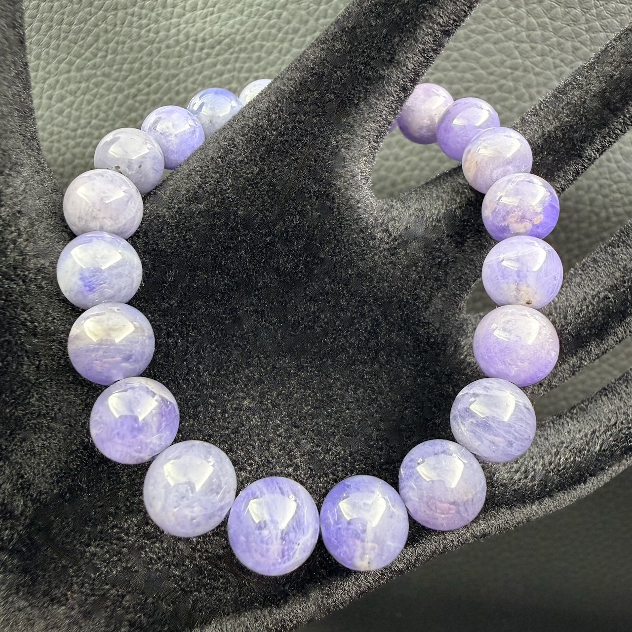 Dans un bracelet de tanzanite, cette richesse se traduit par une suite de micro-paysages optiques. Chaque perle n’est pas seulement une boule polie : c’est une lentille minérale, un petit monde de dégradés qui s’ouvre et se referme selon la lumière ambiante.