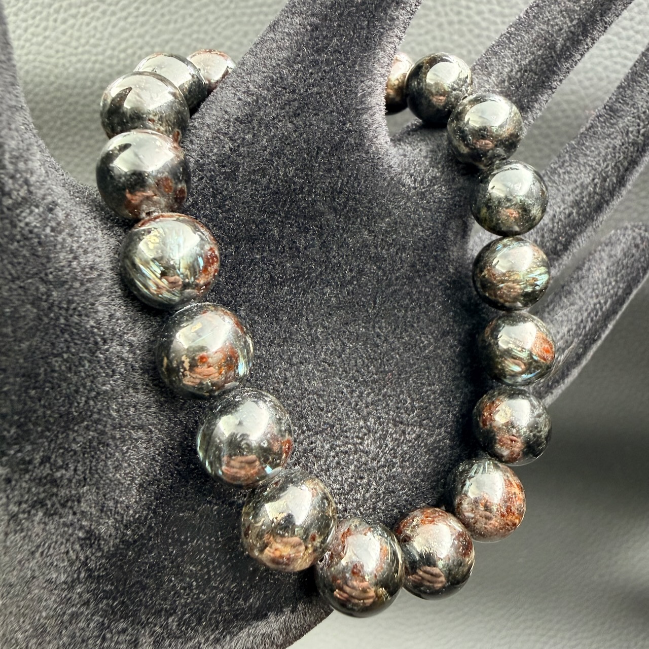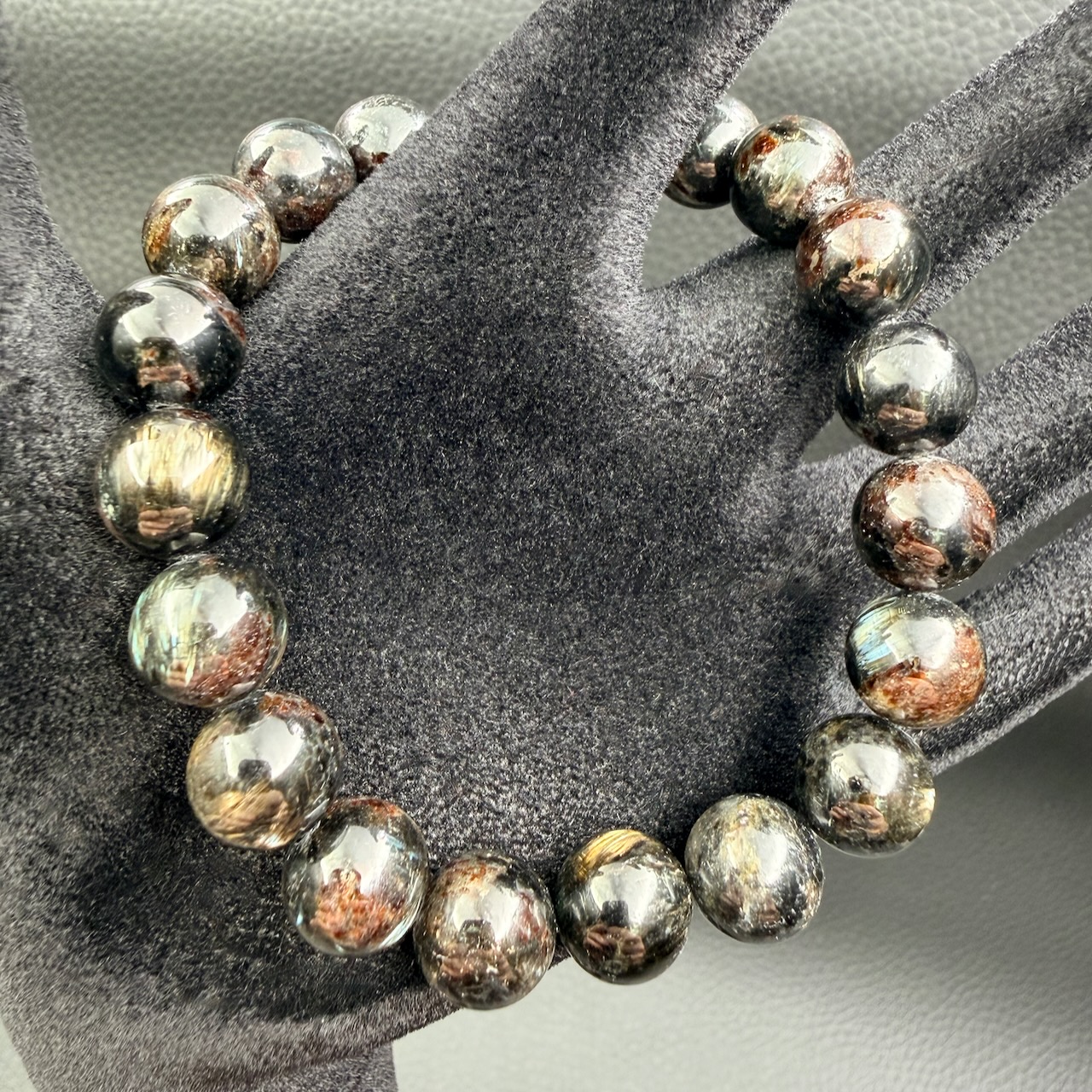 Un fond sombre, souvent d’un noir profond, parcouru de nervures dorées et de filaments lumineux. Ce jeu visuel est d’autant plus frappant lorsqu’elle est polie en perles sphériques : la lumière semble y tourner sur elle-même, comme si elle cherchait un centre gravitationnel.