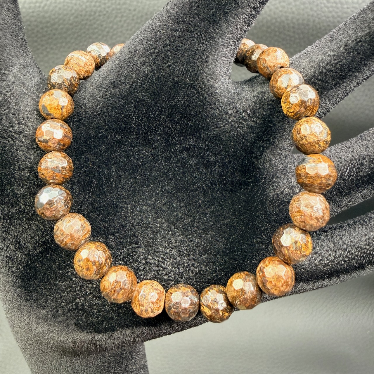 Cette pierre possède un aspect naturellement nacré, presque métallisé, lié à la présence de fer dans sa structure. Ce détail n’est pas anodin : il confère à la bronzite ce scintillement caractéristique, doux et pourtant puissant, comme si la pierre captait la lumière pour la transformer en une lueur intérieure. C’est ce jeu entre matité et éclat qui fait la magie visuelle du bracelet en bronzite.