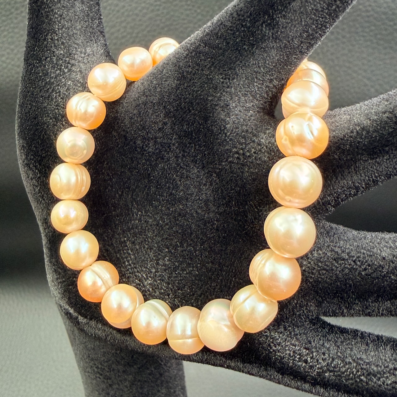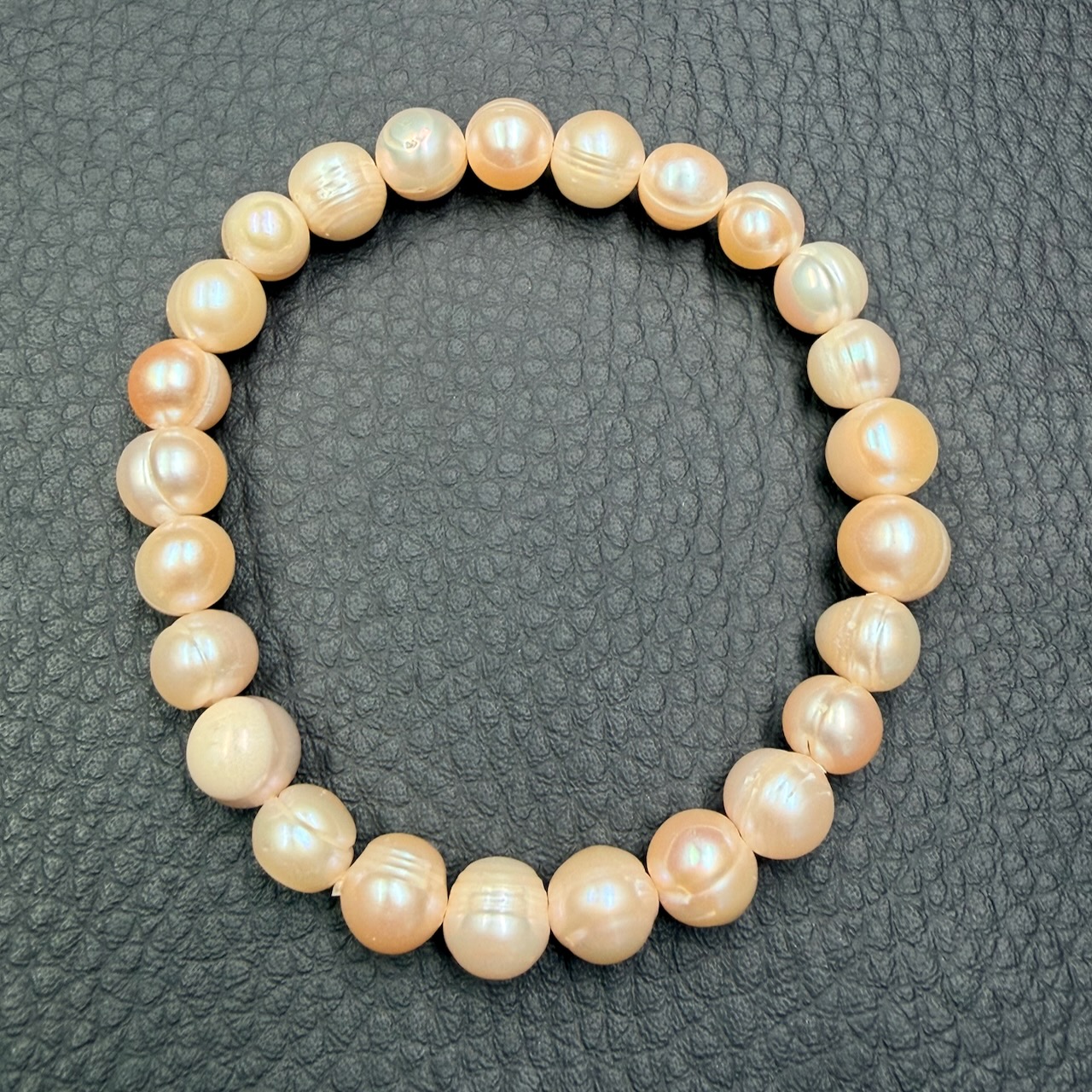 Les nuances peuvent varier du rose pâle à des tons légèrement orangés. Cette palette douce permet au Bracelet en Perles de Keshi de s’adapter facilement à différents styles, sans être trop marqué visuellement.