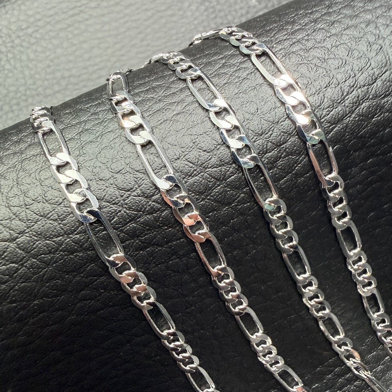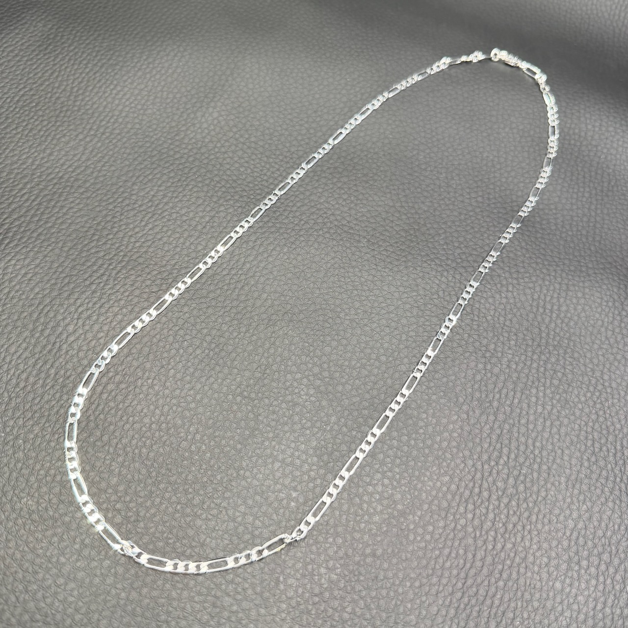 La maille figaro allongée se caractérise par une succession répétée d’un maillon long rectangulaire suivi de plusieurs maillons plus courts. Sur cette chaîne en argent 60 cm à grosses mailles, les maillons longs dominent visuellement la structure.