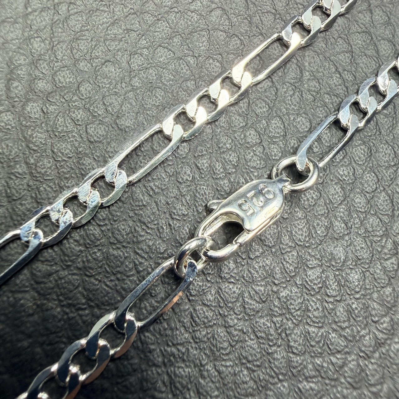La chaîne à mailles larges présentée ici se distingue par une architecture de type figaro, composée d’une alternance régulière entre maillons allongés et maillons courts. Cette organisation confère à l’ensemble une lecture visuelle structurée, avec un rythme linéaire constant sur toute la longueur.