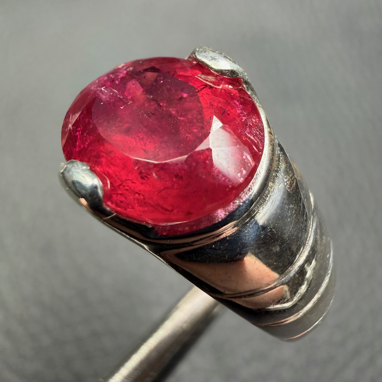 La Chevalière en tourmaline Rubellite met en avant une gemme appartenant au groupe complexe des tourmalines, plus précisément dans sa variété riche en lithium. La rubellite se distingue par ses teintes allant du rose soutenu au rouge intense, parfois légèrement nuancées de violet selon la composition chimique et l’origine géologique.