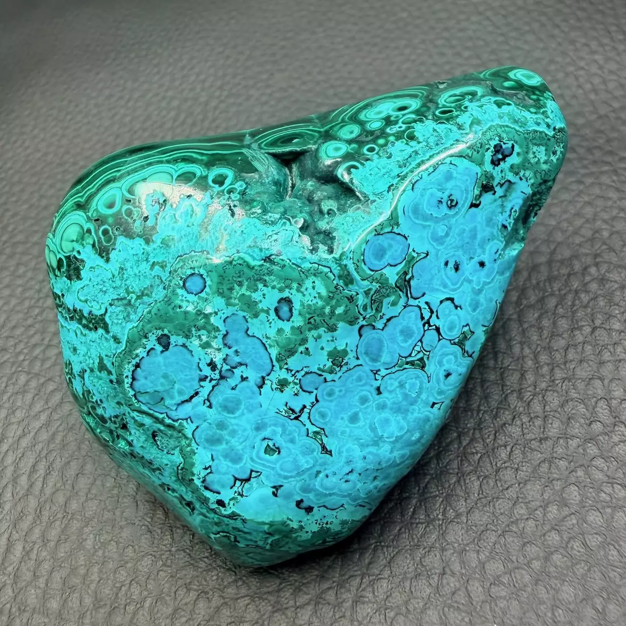 Taille du chrysocolle 7,8 cm sur 5,5 cm sur 2,7 cm.