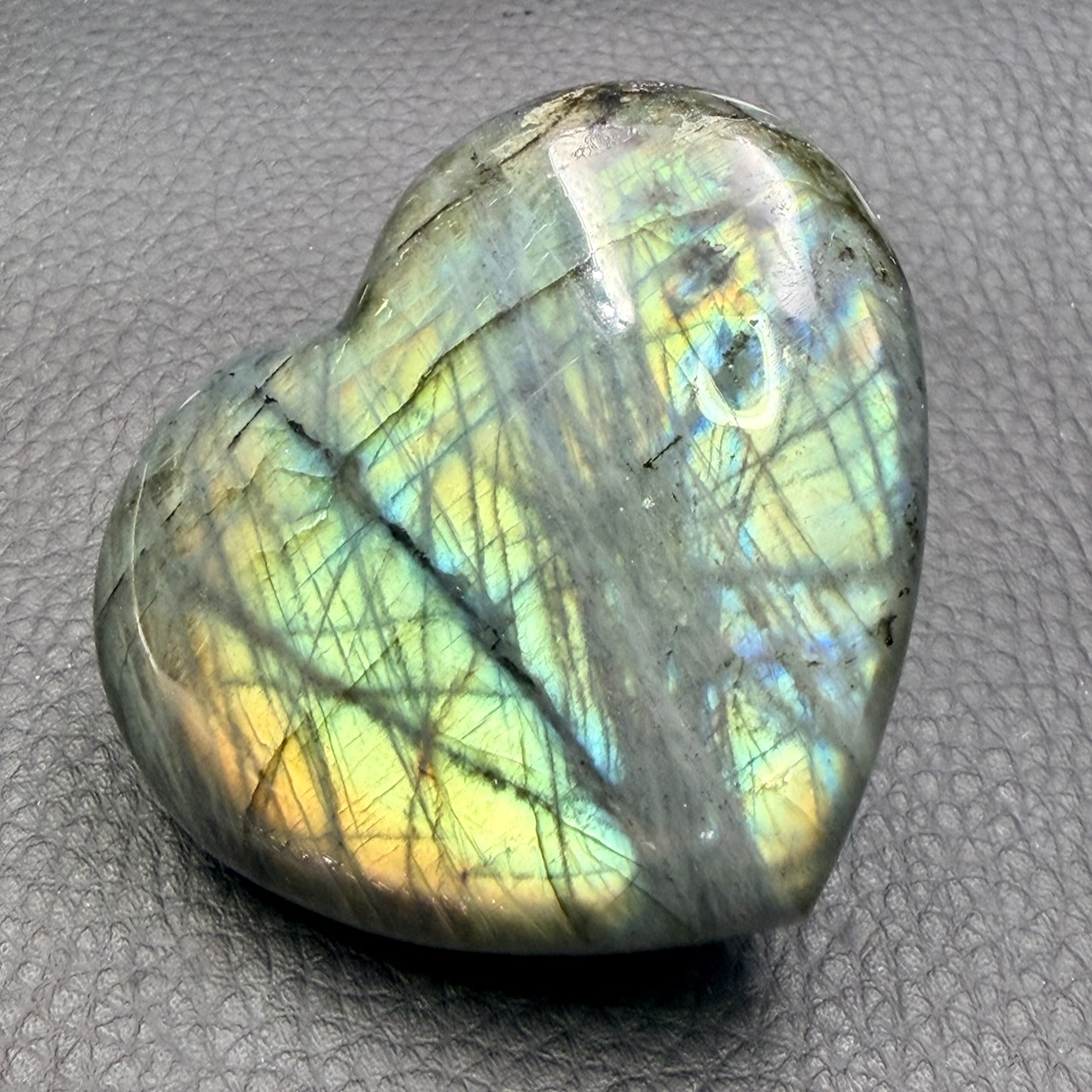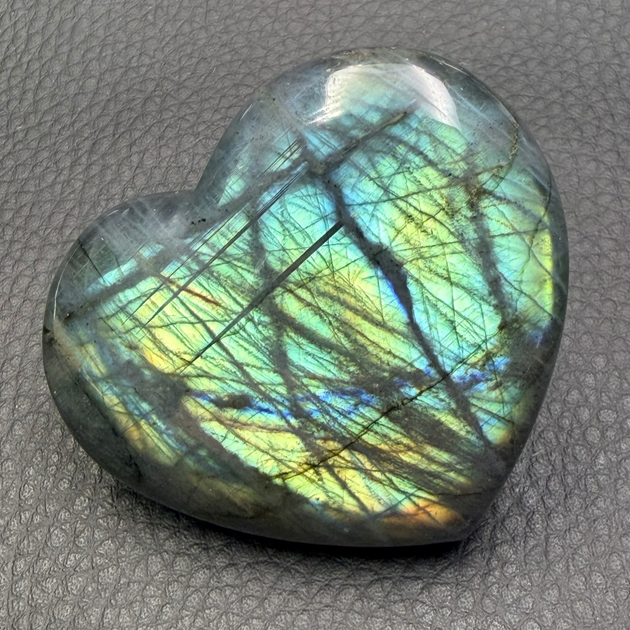 La taille en forme de cœur accentue ces effets en offrant une surface large et légèrement bombée, propice à la diffusion de la lumière. Ce type de façonnage est particulièrement adapté à la labradorite, car il permet de révéler des zones internes autrement invisibles sur une pierre brute.