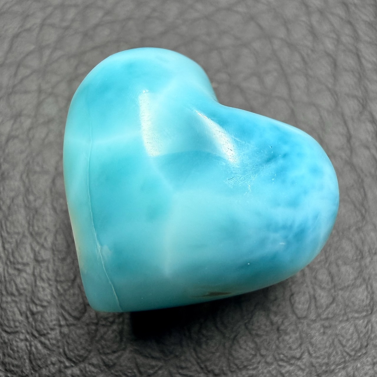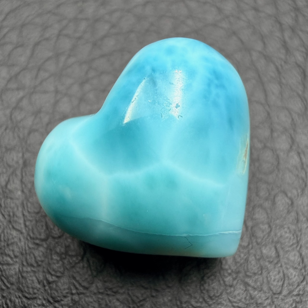 Le Larimar se reconnaît à ses vagues intérieures, ses veines blanches et ses nuances qui vont du turquoise doux au bleu océan. Chaque cœur taillé dans cette pierre est une toile miniature, un paysage marin figé dans le minéral. Certains y voient un lagon, d’autres un ciel d’été traversé de nuages. Chacun y projette un souvenir, un rêve, une émotion.