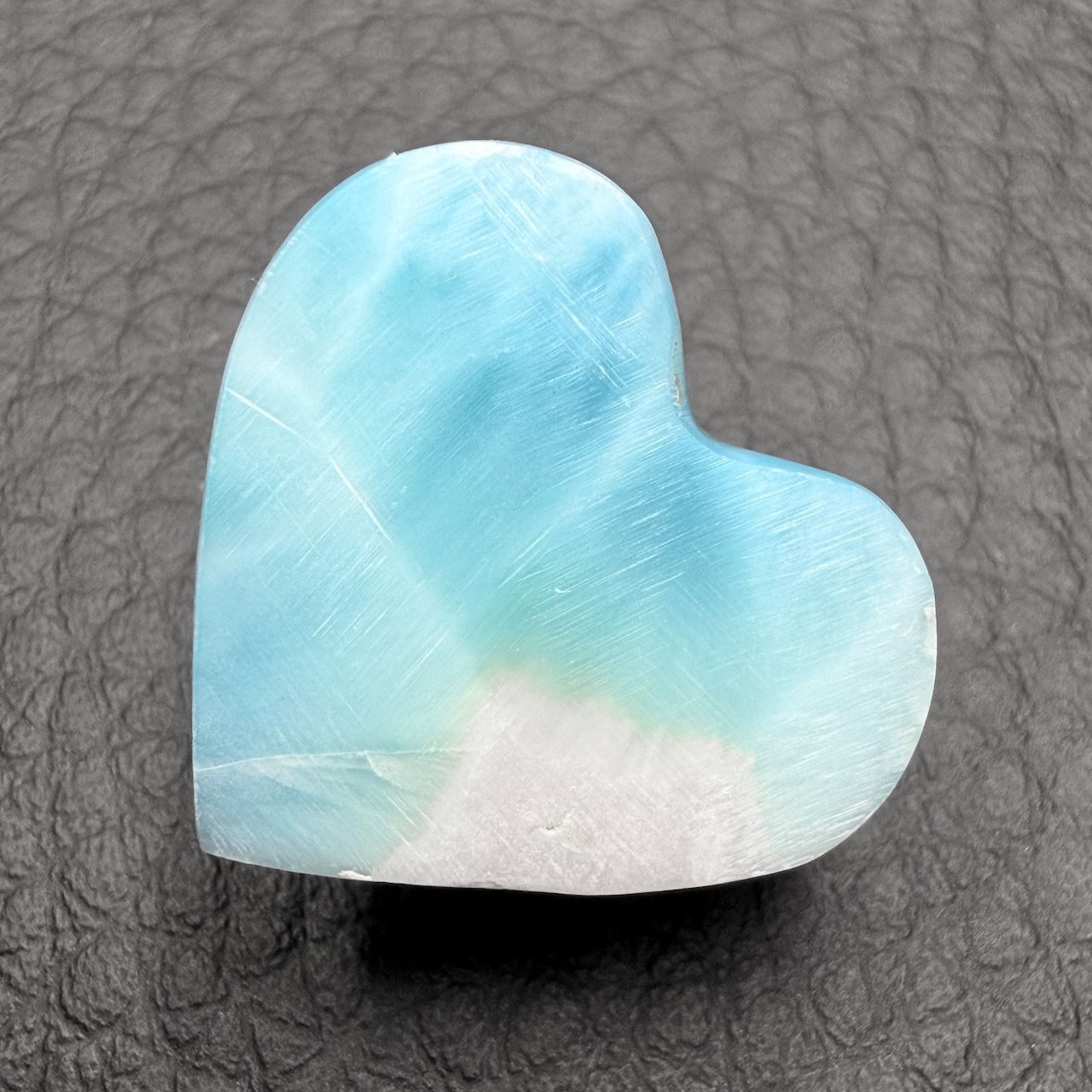 Cette sobriété de forme permet au Larimar de s’exprimer pleinement. Pas d’artifice, pas de surcharge. Juste la pierre et sa lumière intérieure. Un cœur poli à la main, prêt à reposer dans une paume ou sur un cou, comme un secret bleu que l’on garde tout contre soi.