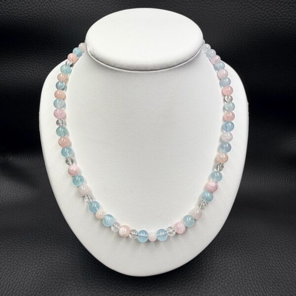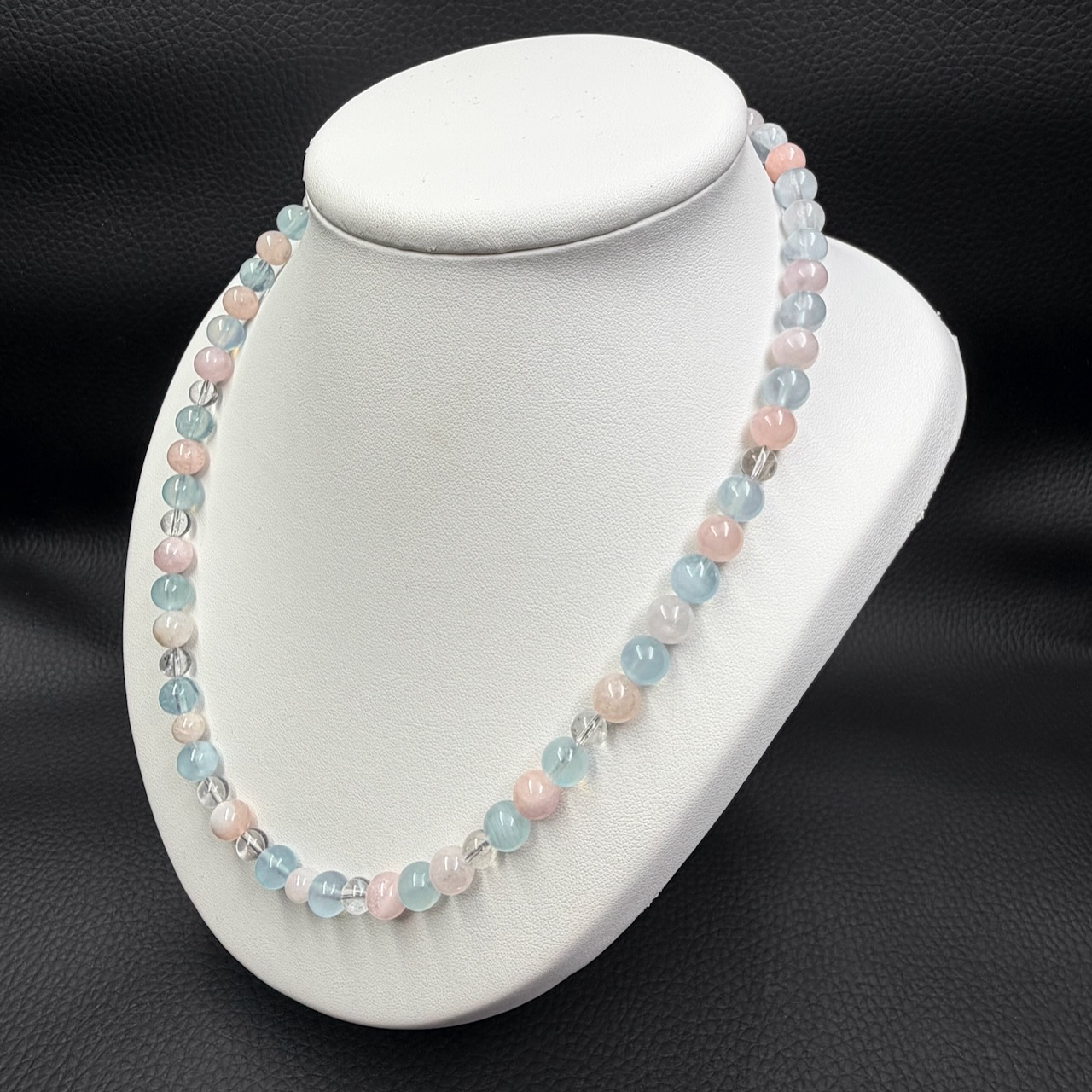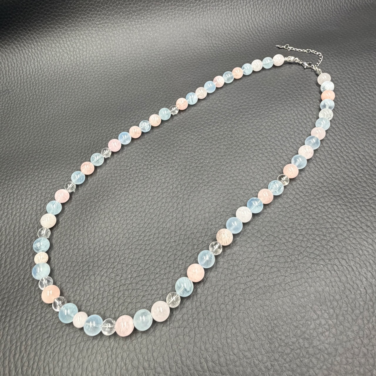 Collier composé de perles de 8 mm en Morganite et Aigue Marine et de perles de 6 mm en cristal de roche.