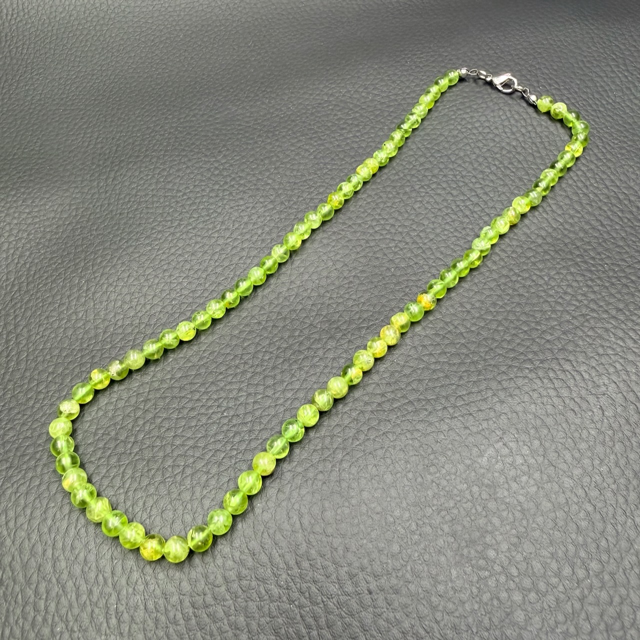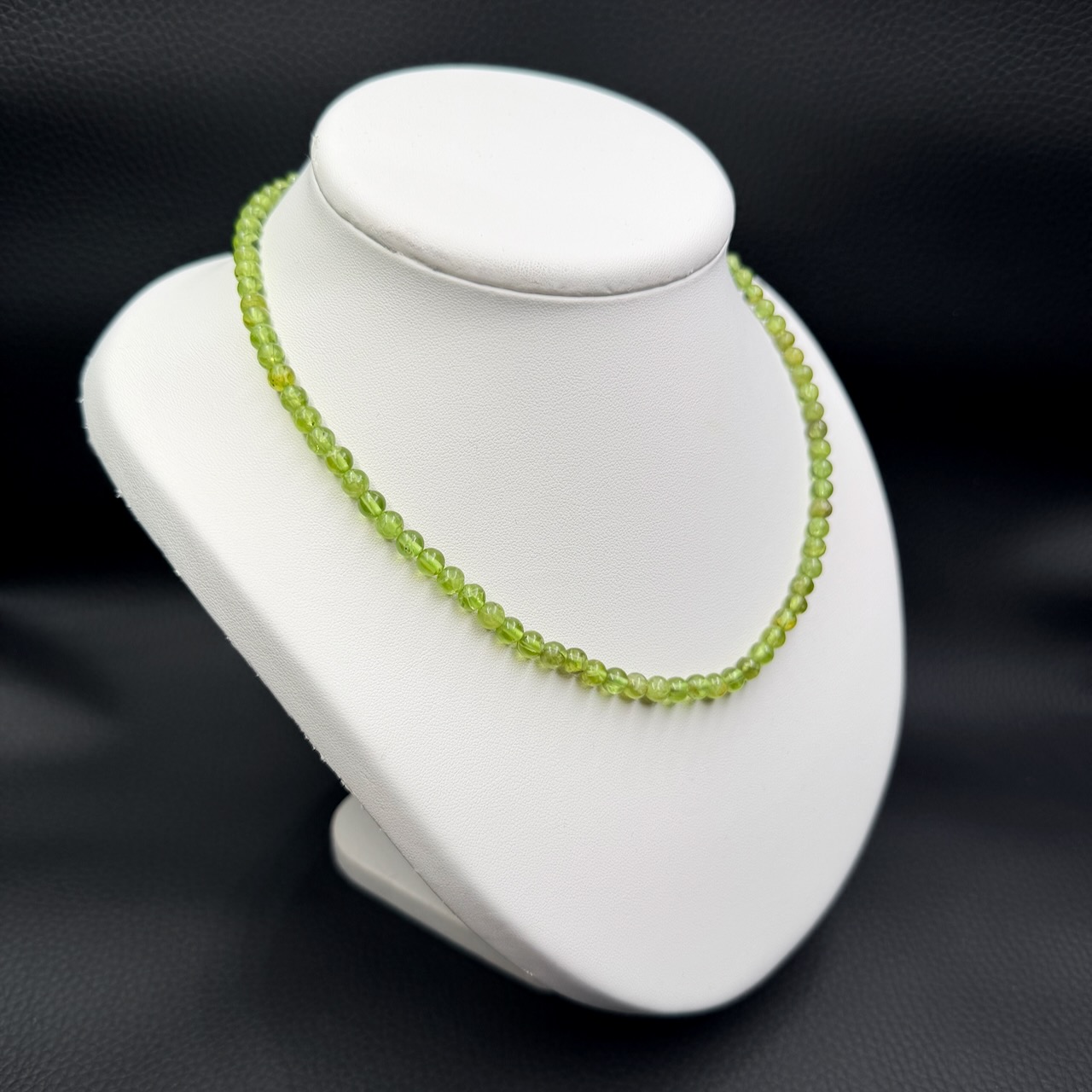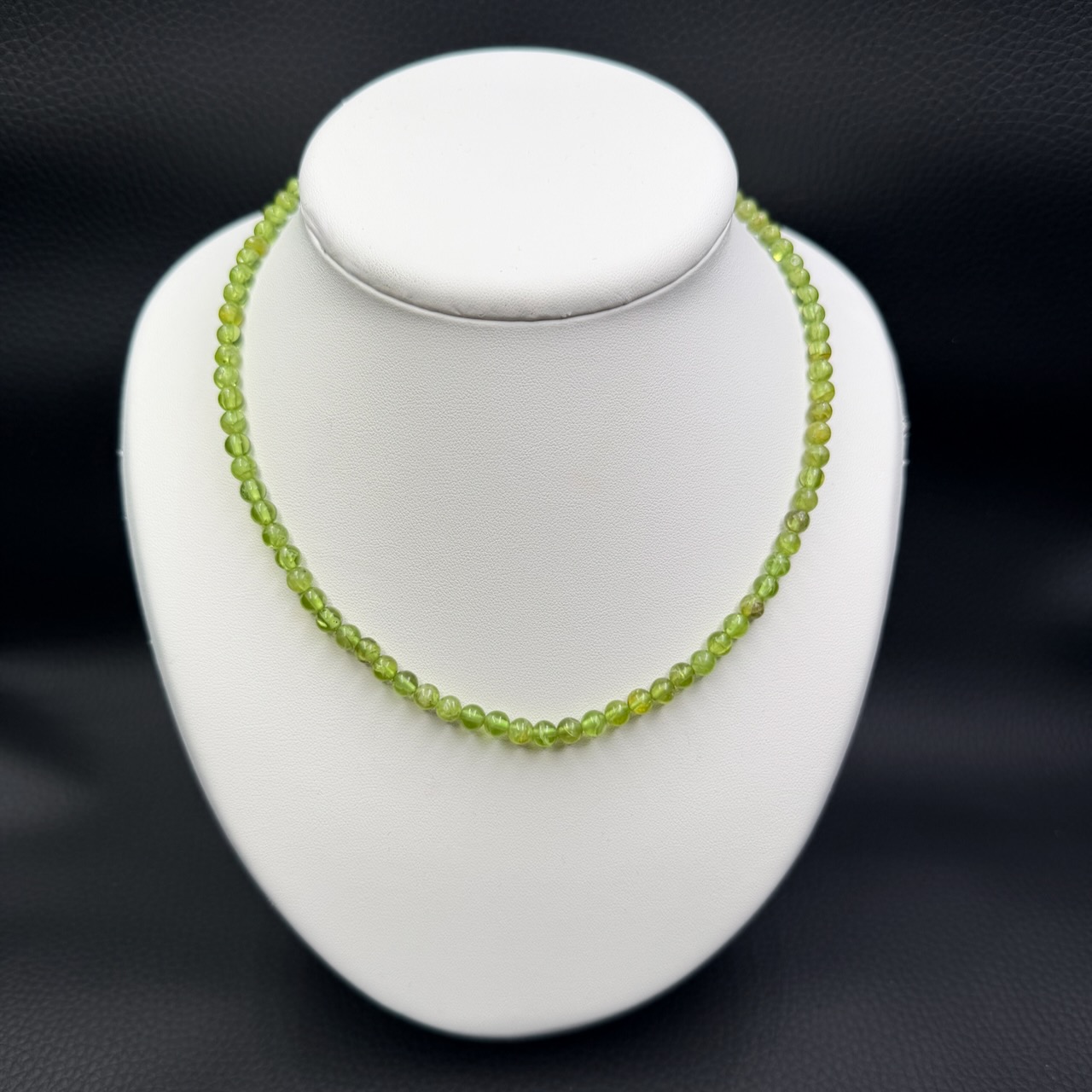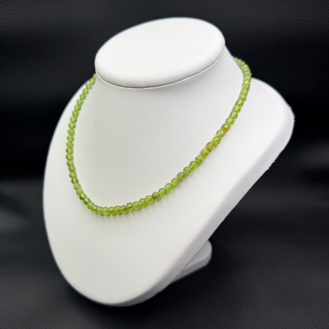 Taille des perles composant le collier en péridot : 0,6 mm.