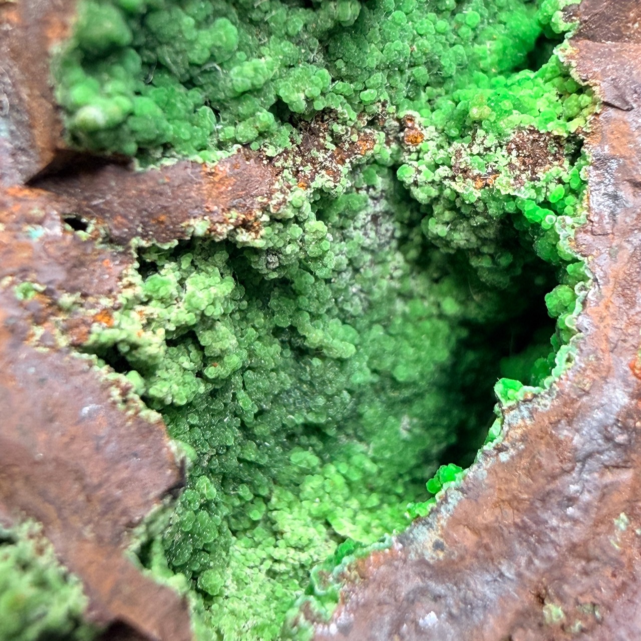 On la trouve la pierre Conichalcite dans les zones d’oxydation des gisements cuprifères (de cuivre).