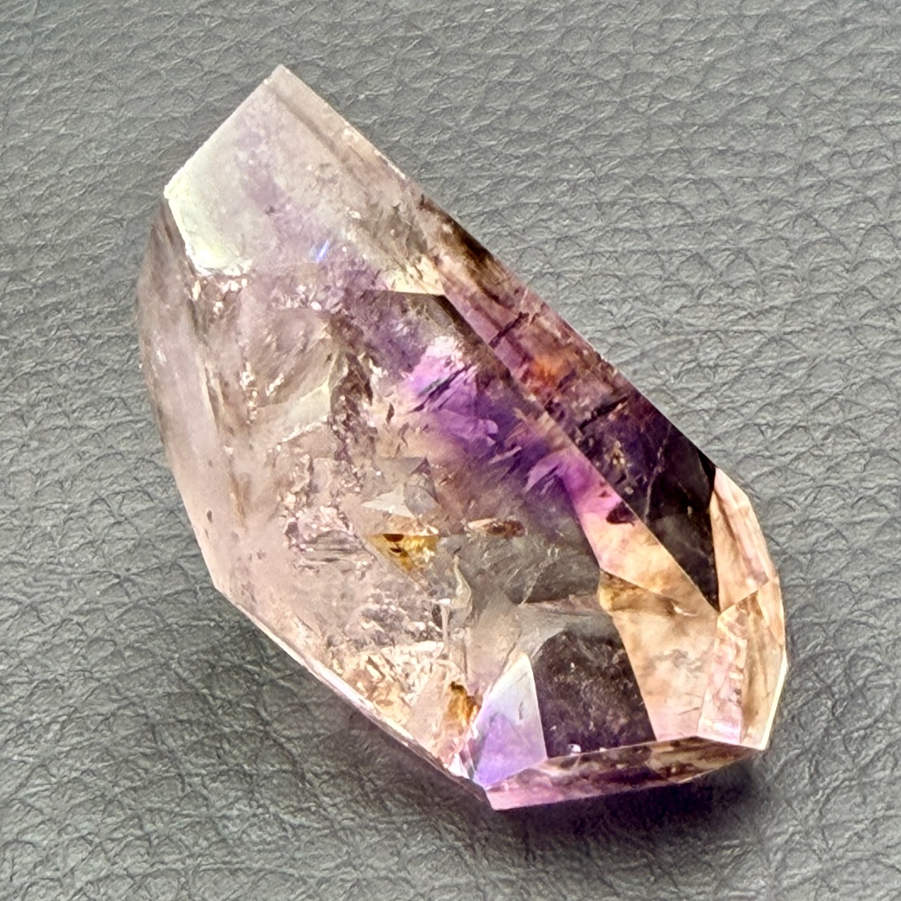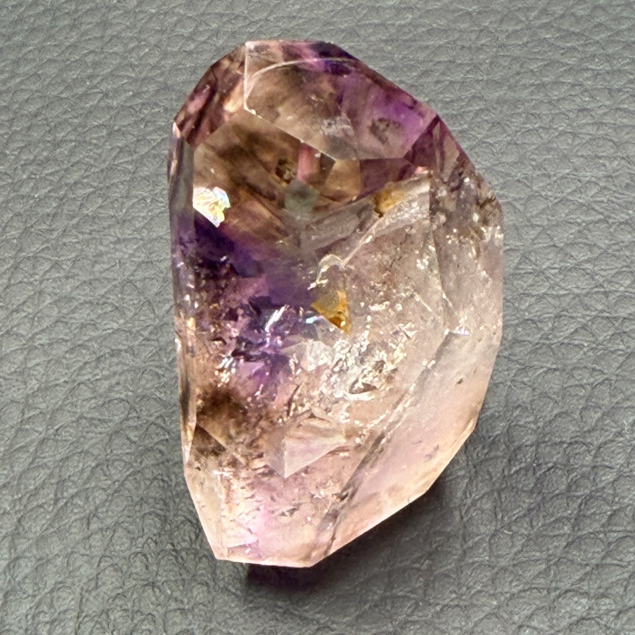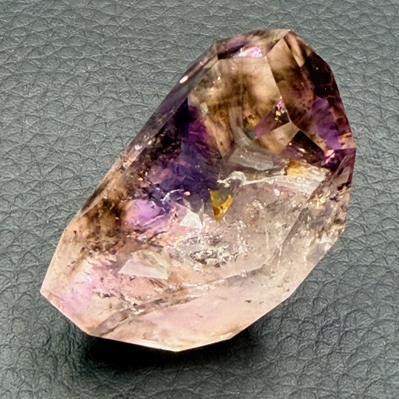 L’améthyste, avec sa couleur violette profonde, se distingue dans la structure de la Super Seven, souvent sous forme de fantômes à l’intérieur du cristal.