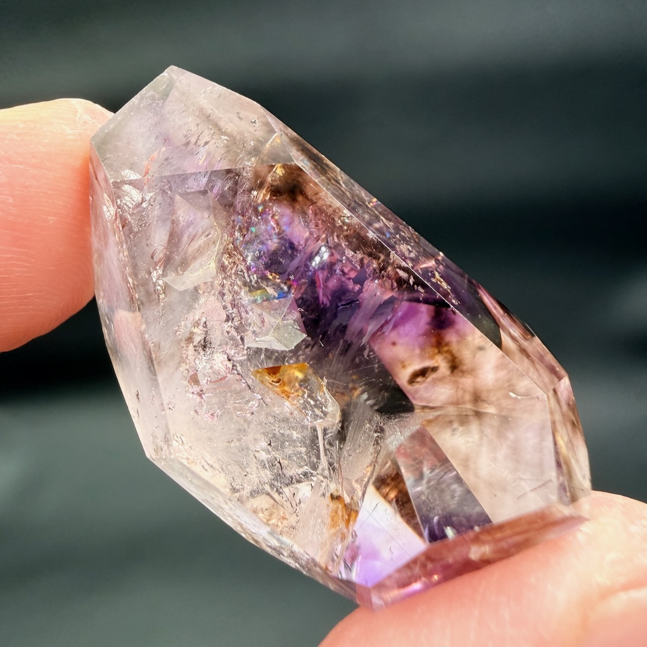 Les prismes de cristal de roche, comme celui que vous proposez avec un fantôme d’améthyste et des inclusions de traits noirs, sont particulièrement populaires.