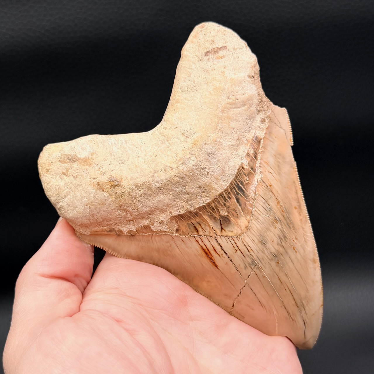 Taille de la dent de mégalodon 13,5 cm sur 9,7 cm sur 2,5 cm.