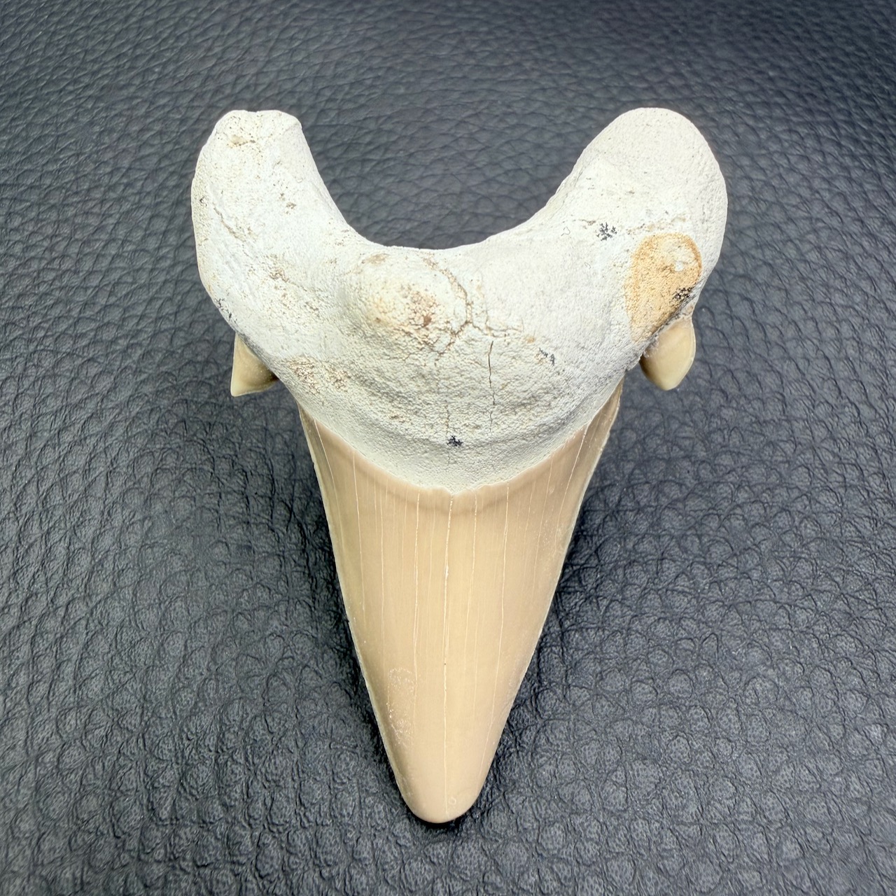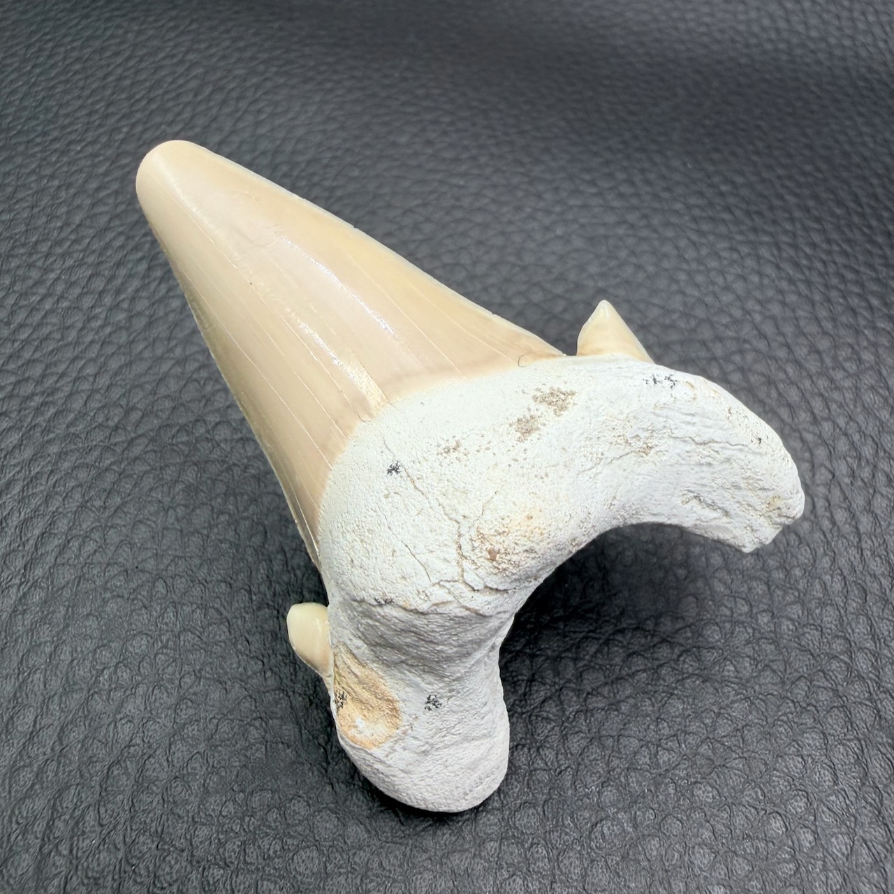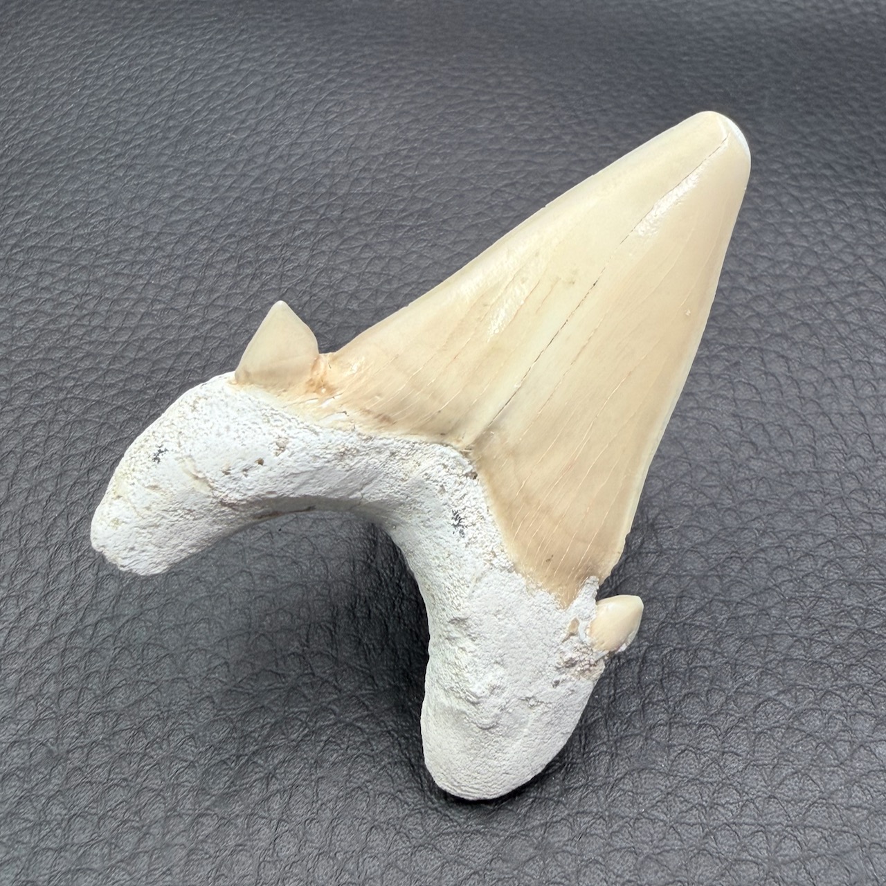 Taille de la dent de requin fossile 6,4 cm sur 4,6 cm sur 2,2 cm.