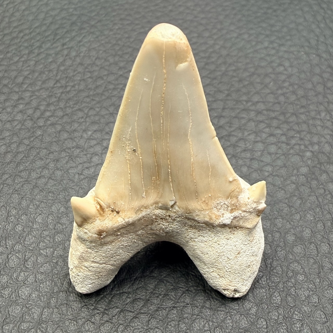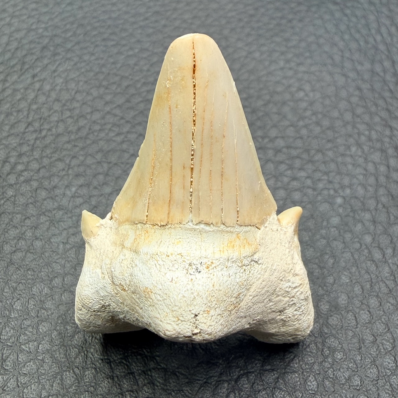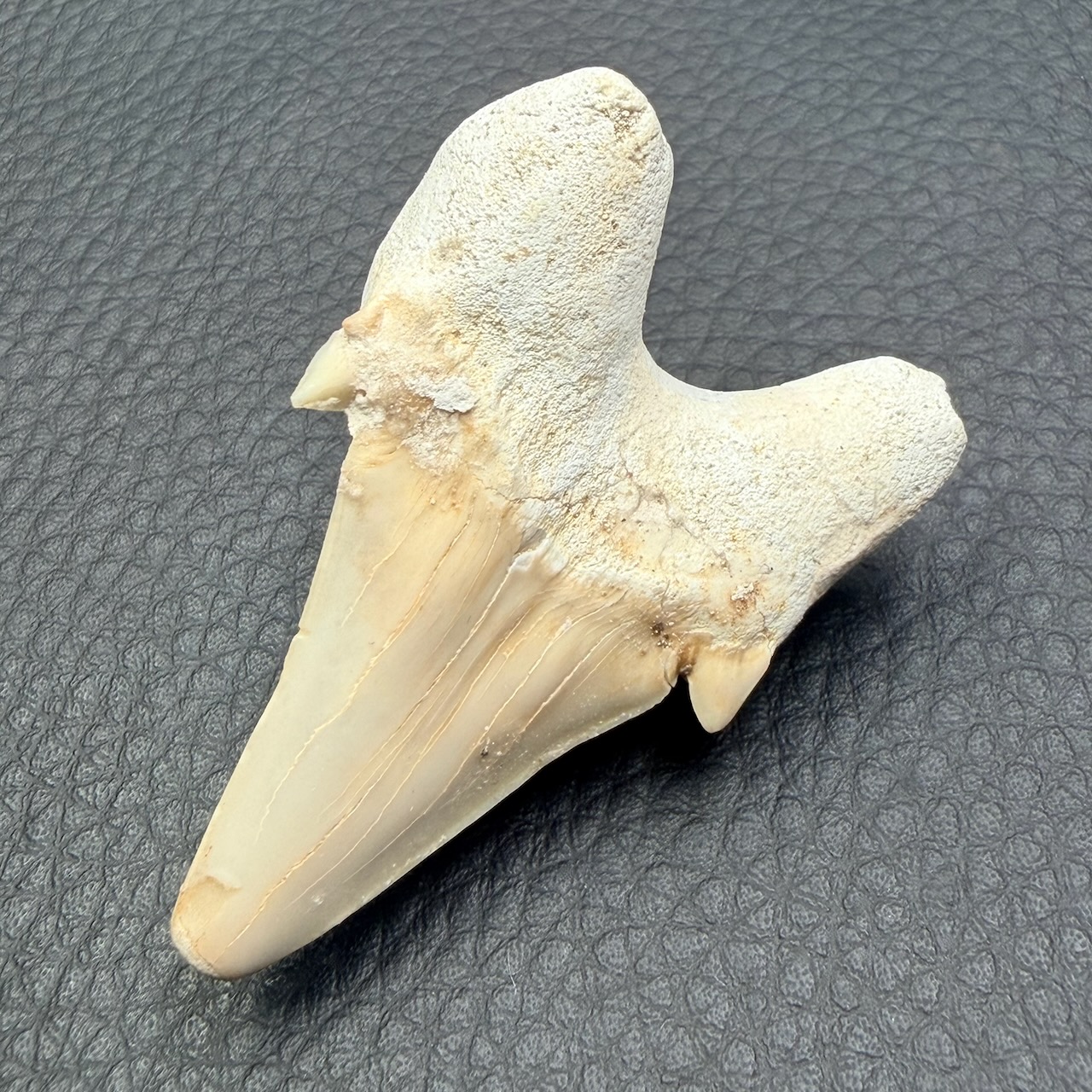 Taille de la dent de requin fossile : 5,2 cm sur 3,5 cm sur 1,8 cm.