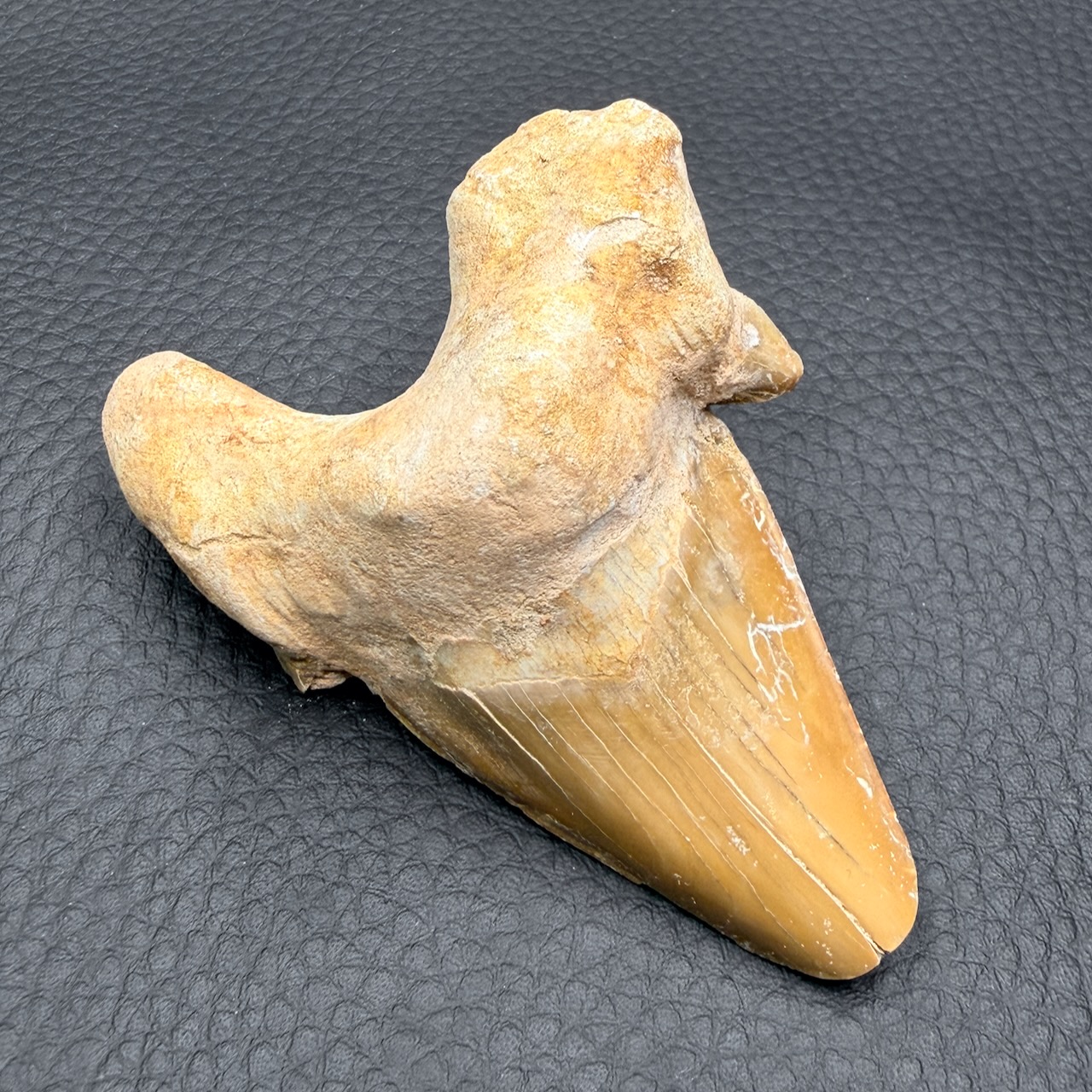 Provenance de la dent de requin fossile : mines de phosphate du Maroc.