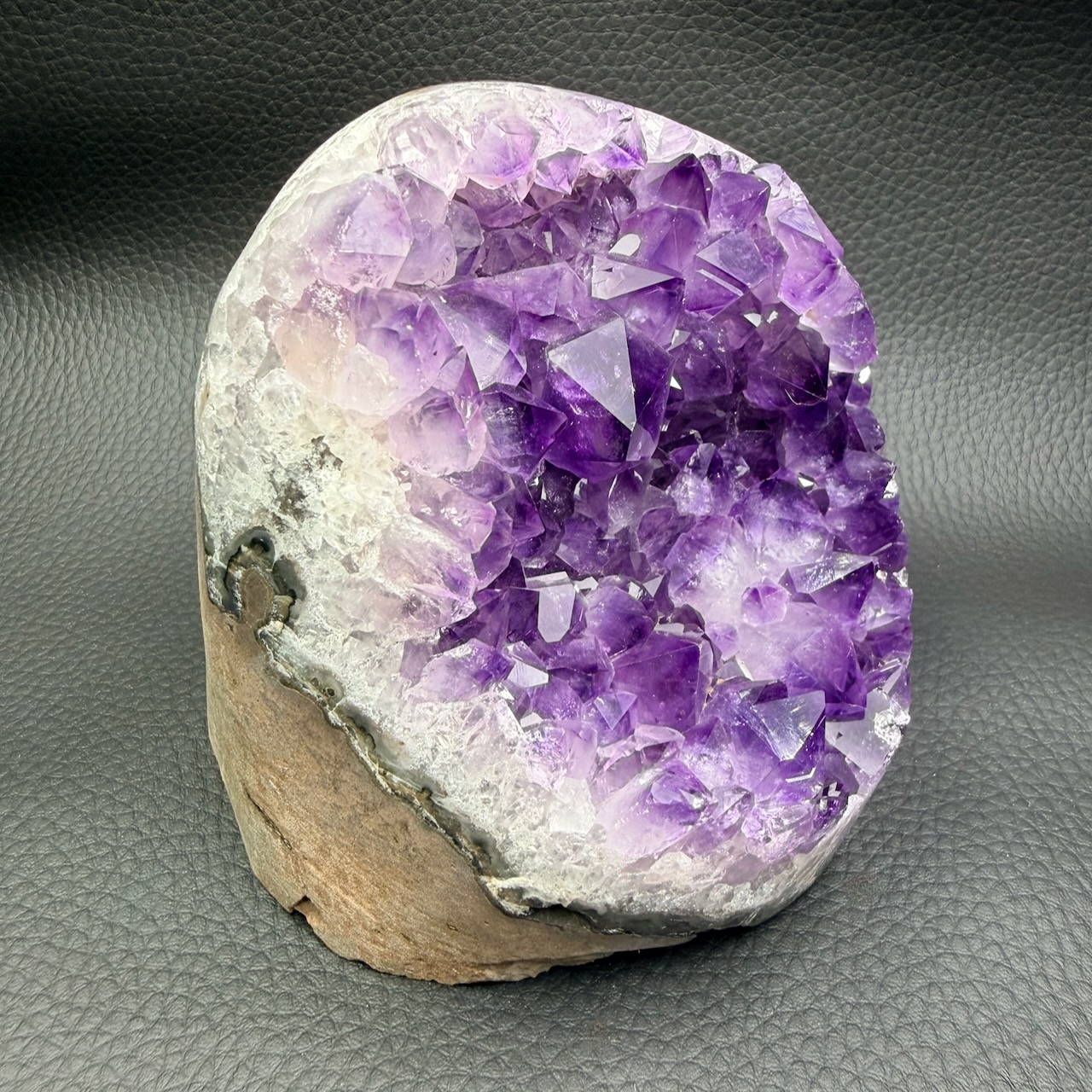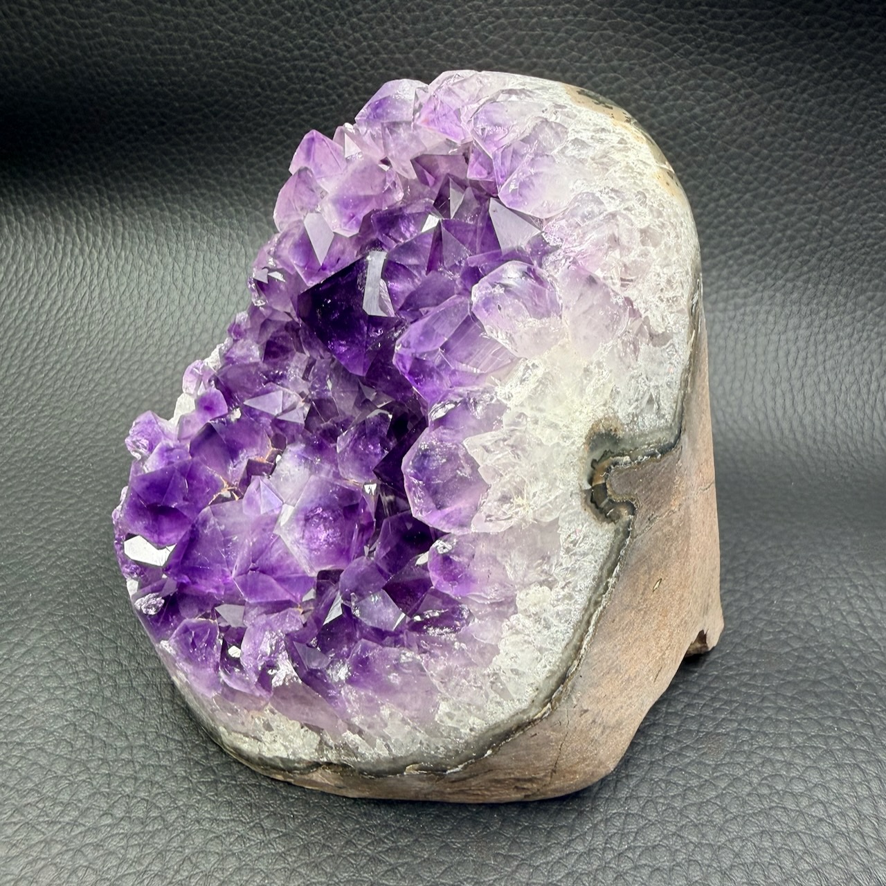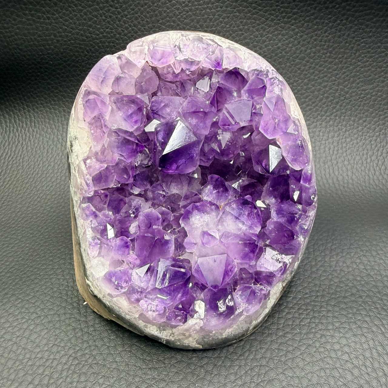 Taille de la druse d’améthyste 10 cm sur 10 cm sur 9,7 cm.
