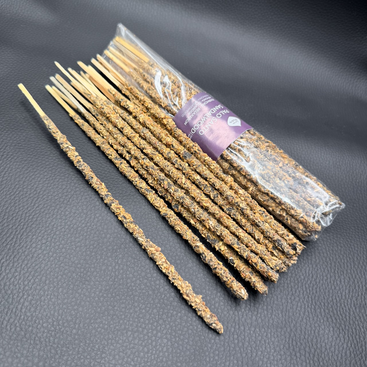 La poudre de bois de santal constitue la base aromatique. Elle assure la structure du bâtonnet et libère progressivement le parfum lors de la combustion.