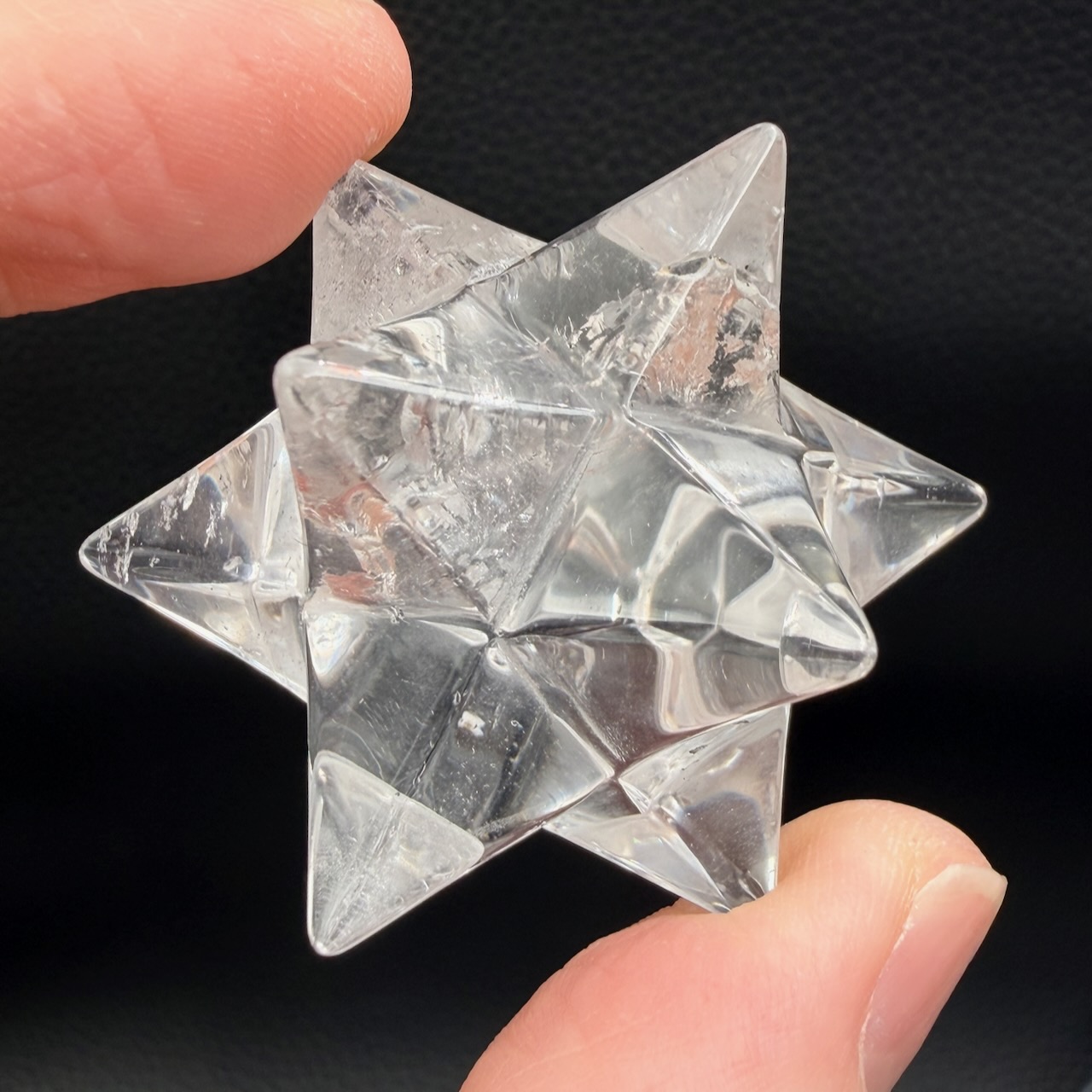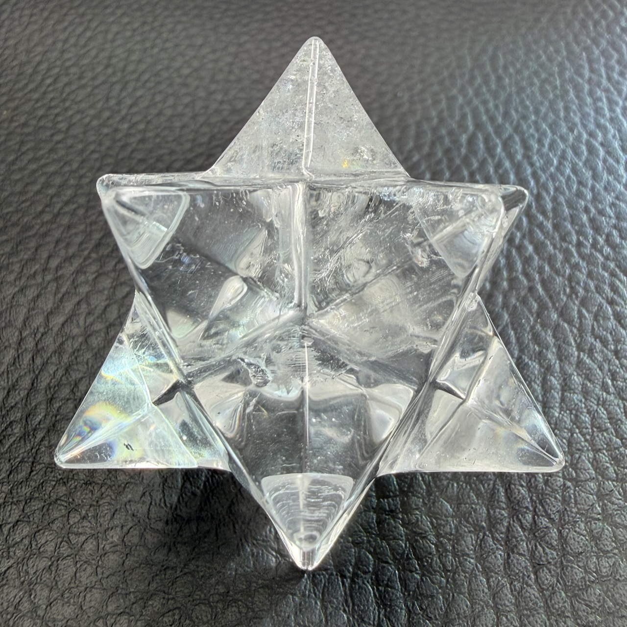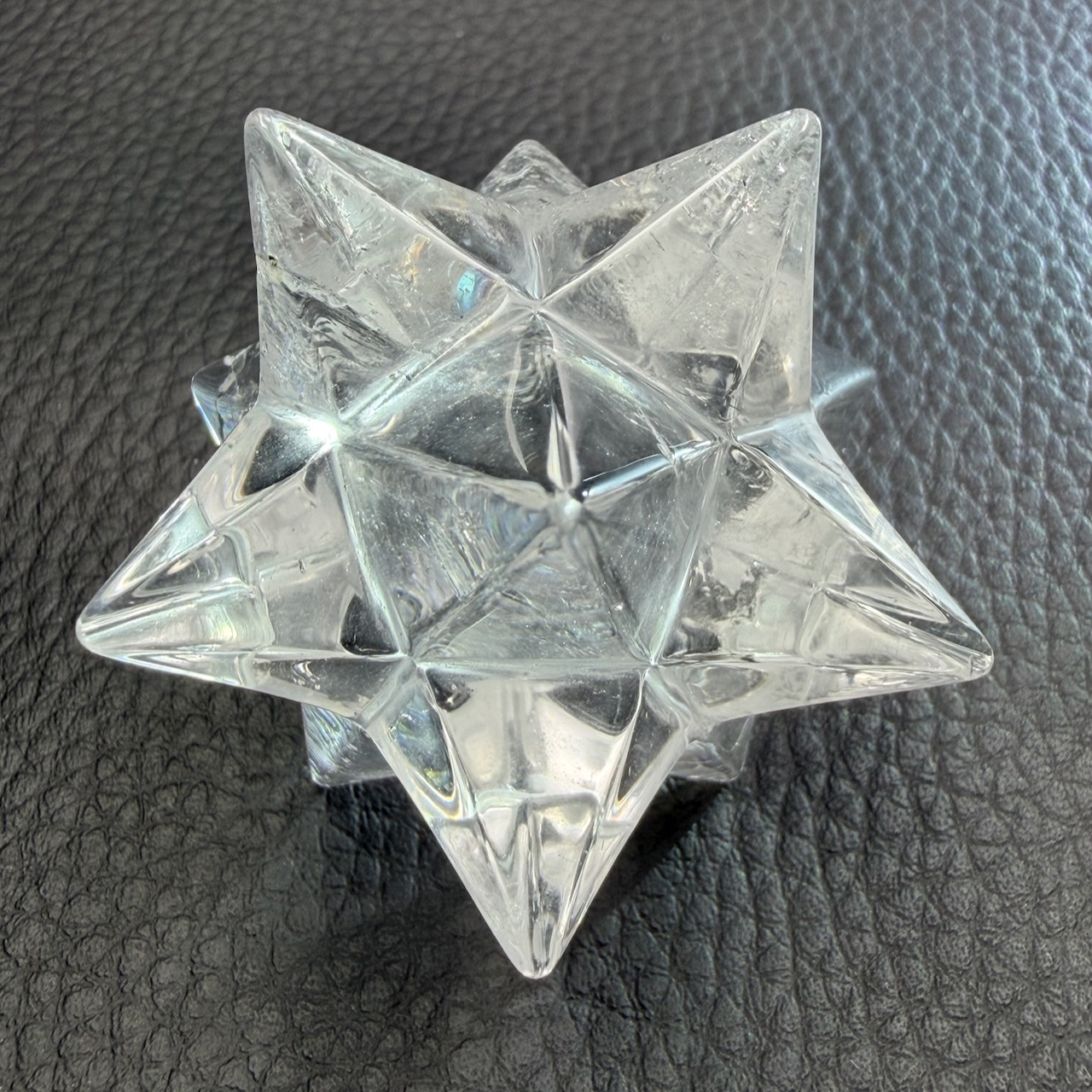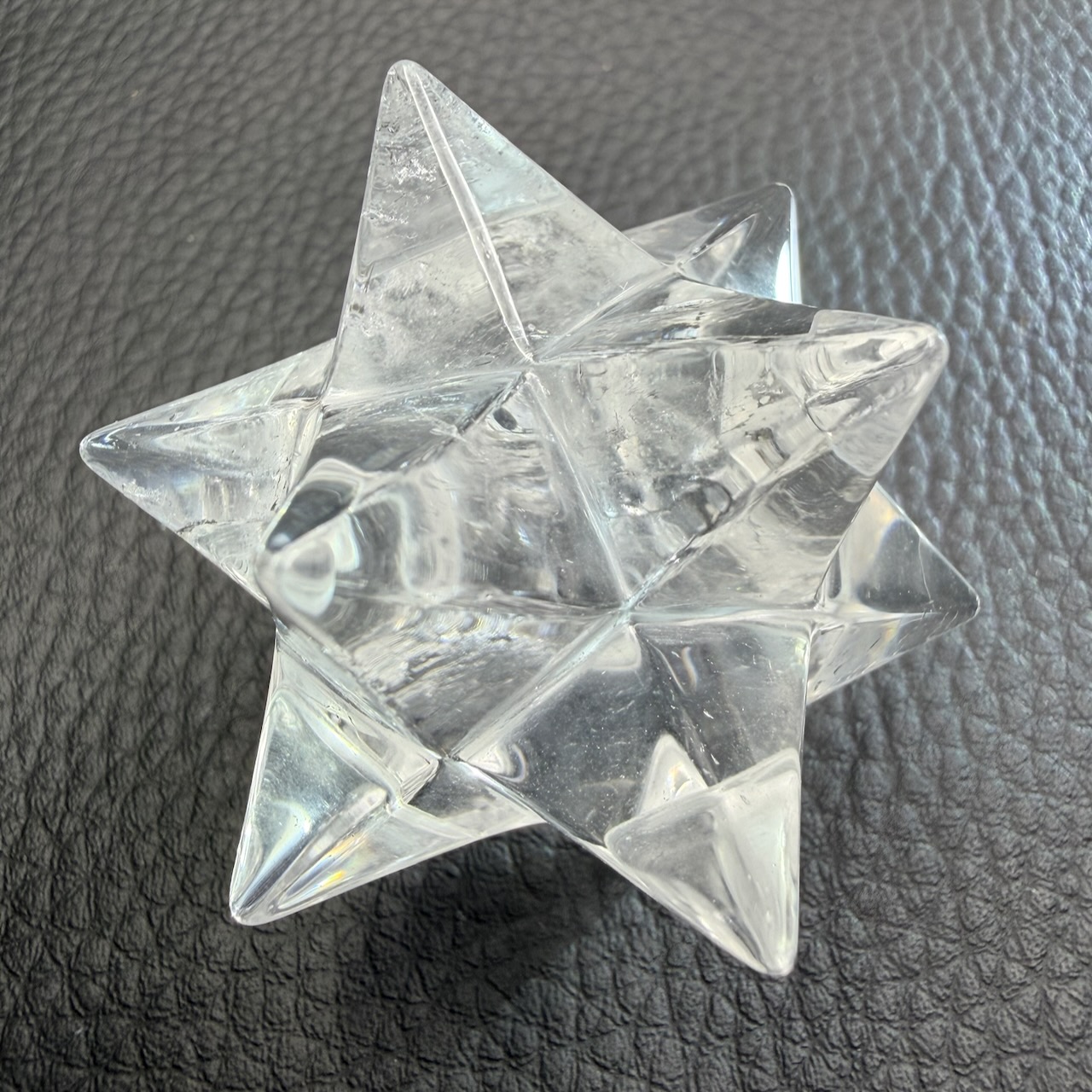 La transparence du cristal de roche joue un rôle essentiel. Elle permet de capter et de diffuser la lumière à travers les différentes branches de l’étoile. Les arêtes et les facettes créent des effets de réflexion qui renforcent visuellement la structure géométrique.