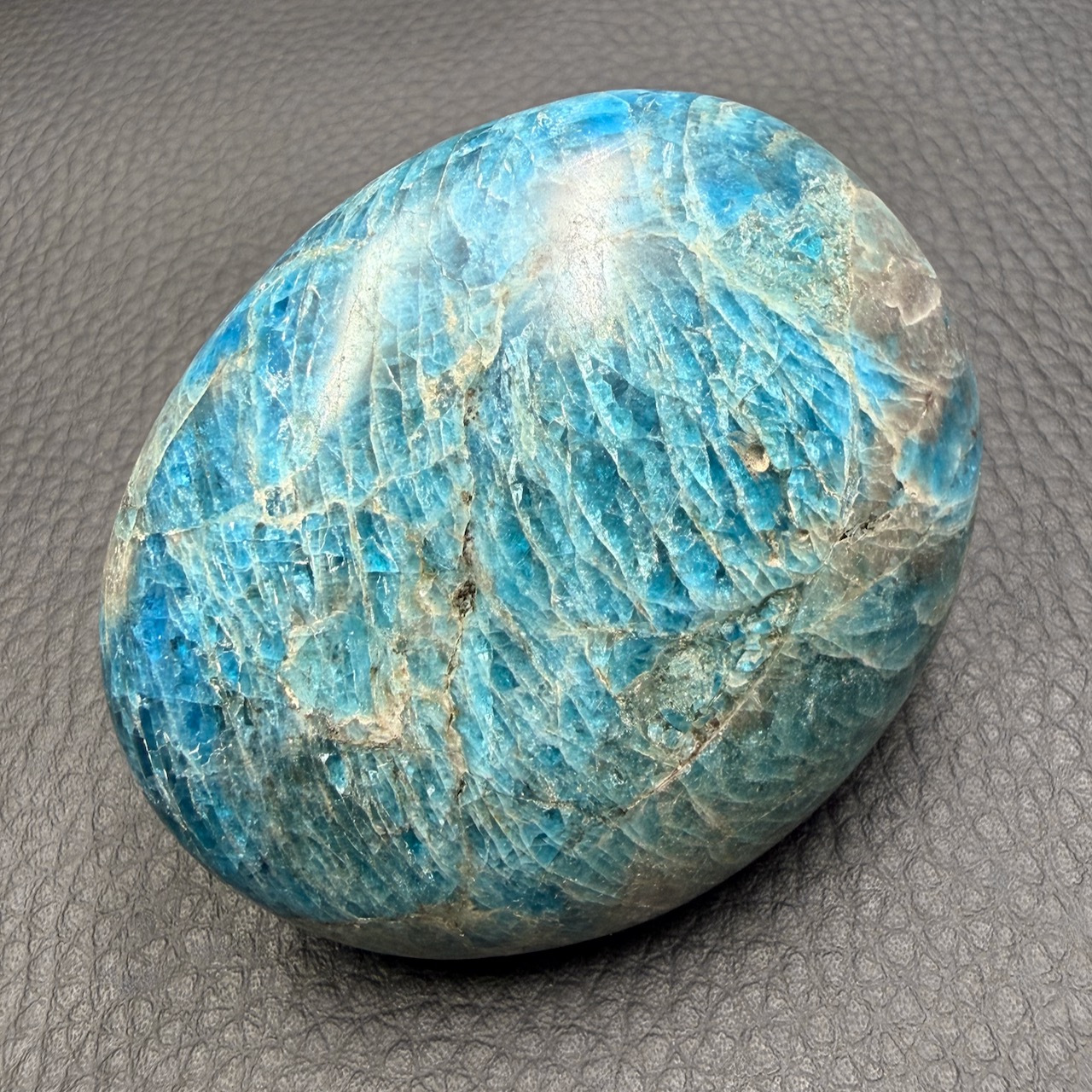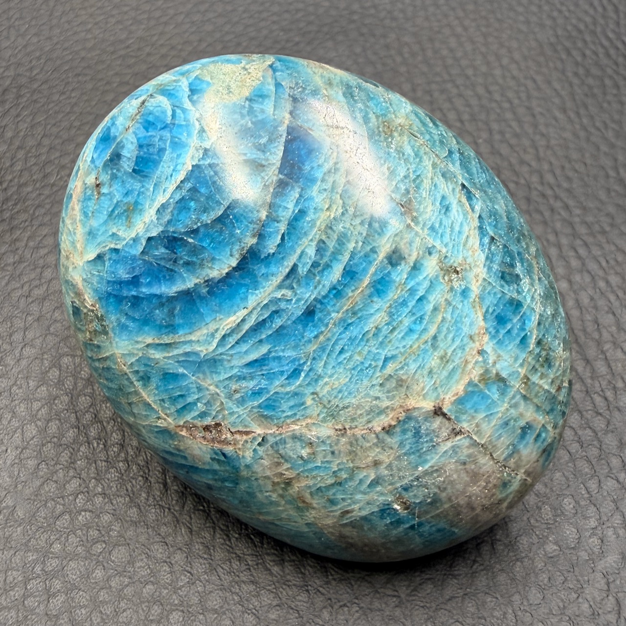 Taille du galet apatite bleue 6,5 cm sur 5,3 cm sur 2,9 cm.