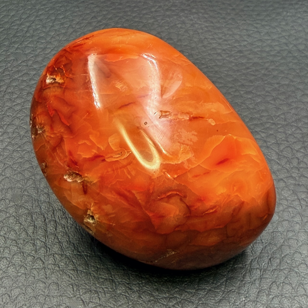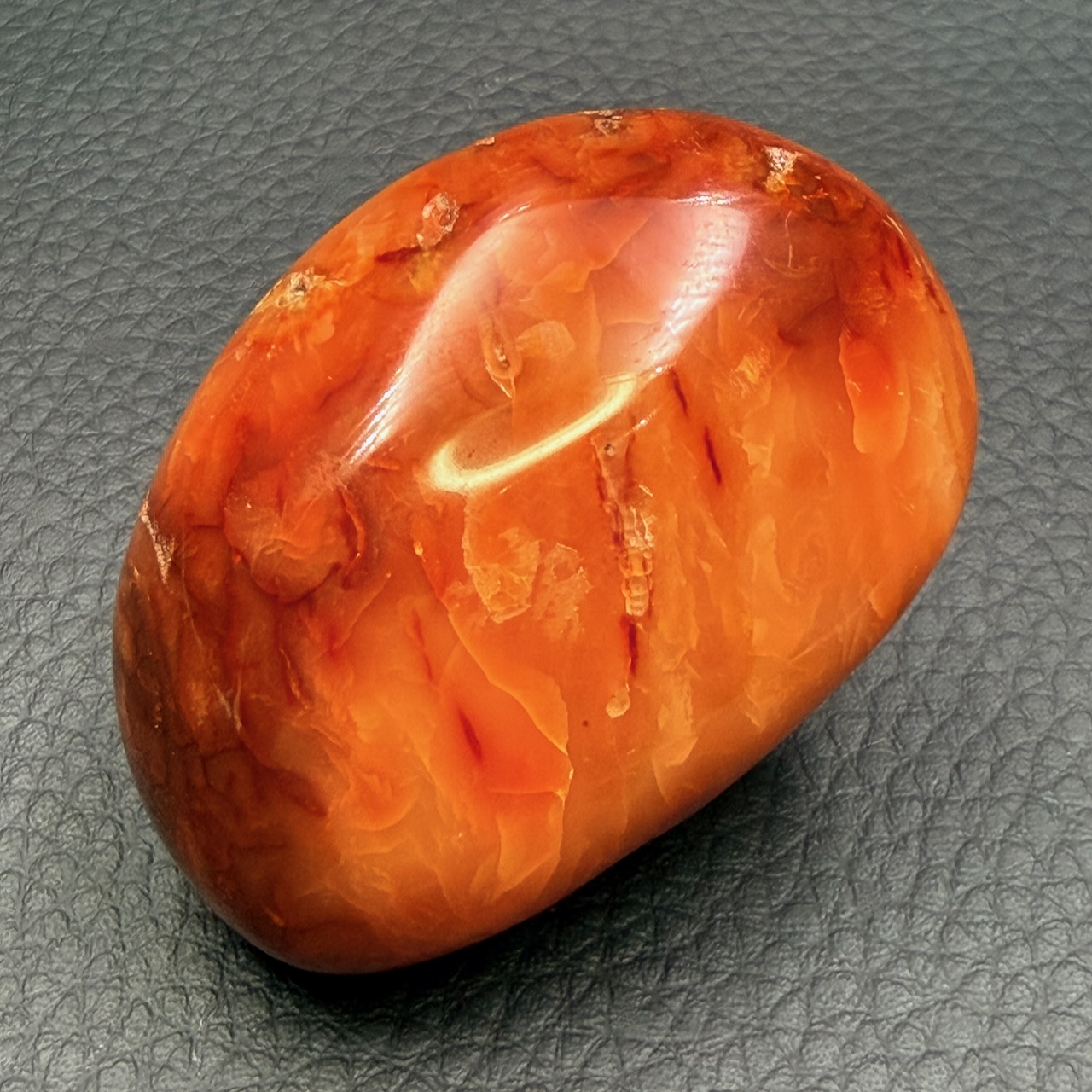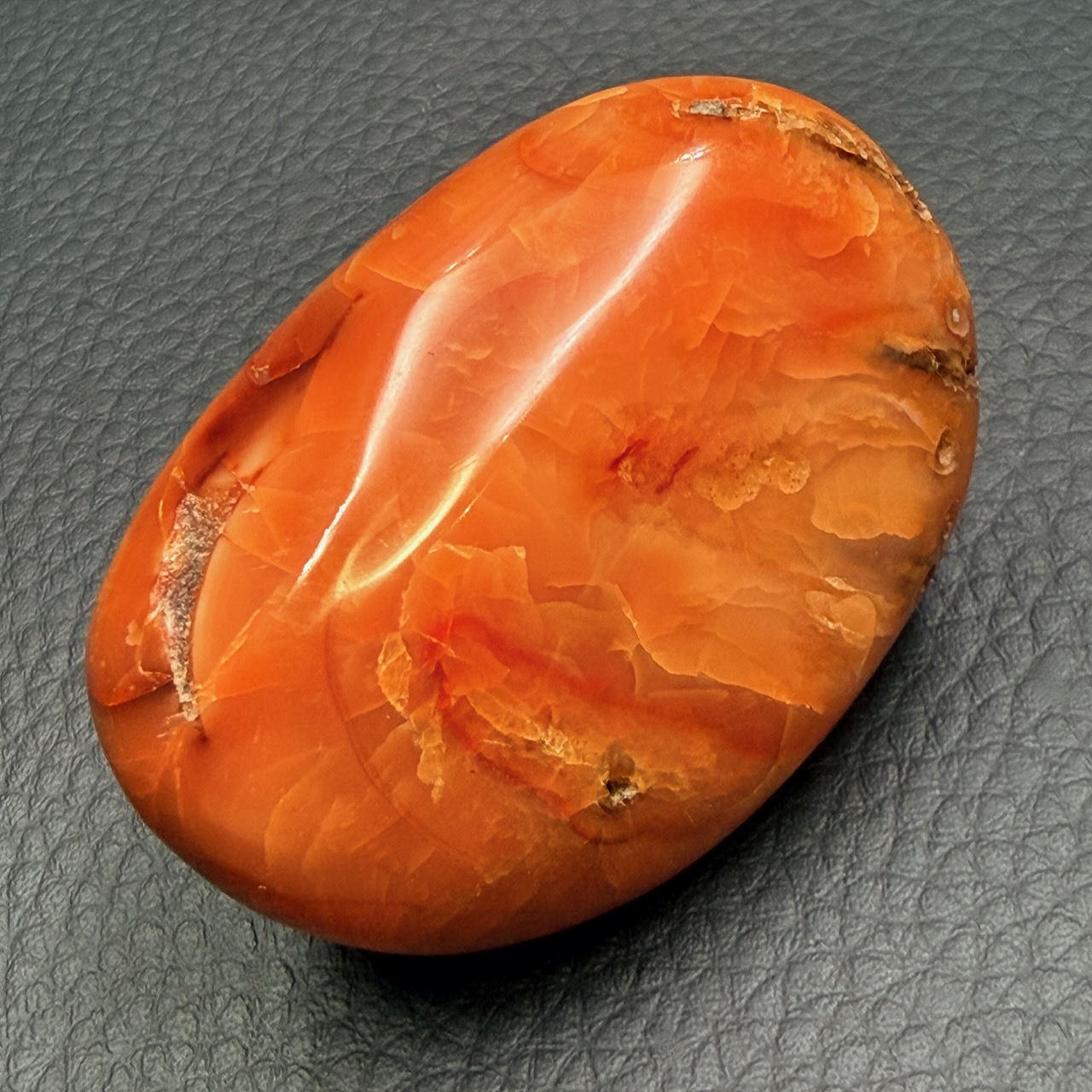 Taille du galet de cornaline 5,4 cm sur 3,7 cm sur 2,5 cm.